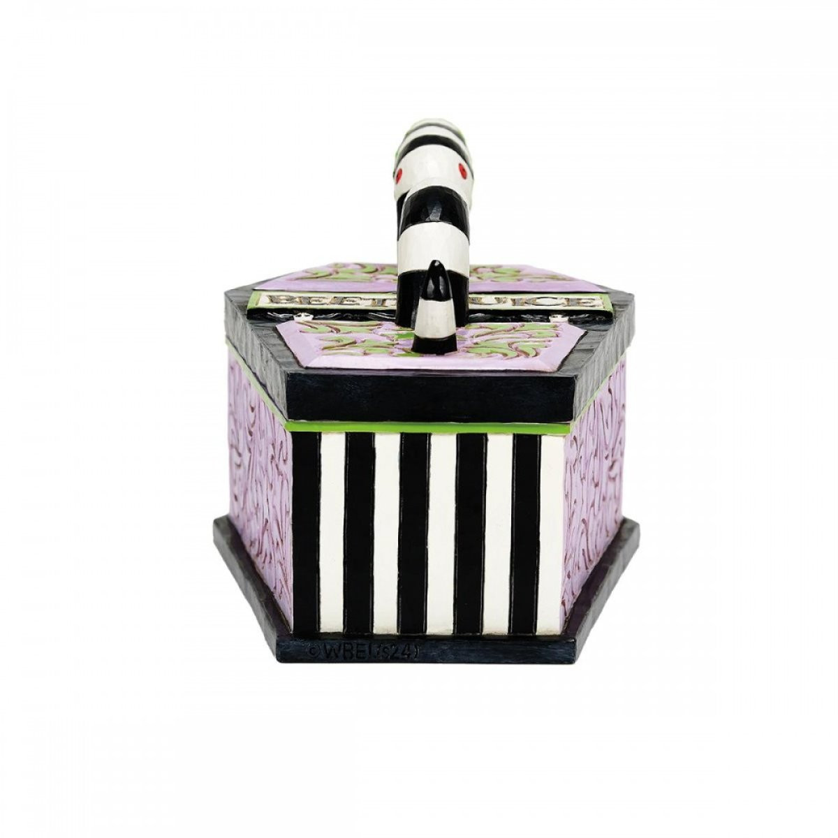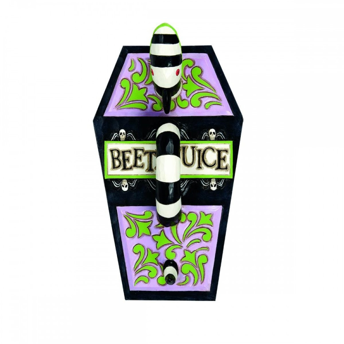 Doodskistvormige sieraden , geïnspireerd op Beetlejuice met een zandworm erop. Met de hand geschilderd en gemaakt van hoogwaardig gietsteen met een inscriptie aan de binnenkant die verwijst naar de film. Ontworpen door de bekroonde kunstenaar en beeldhouwer Jim Shore voor de Beetlejuice-collectie. Deze figuren zijn geen kinderspeelgoed. Alleen bedoeld voor volwassenen.