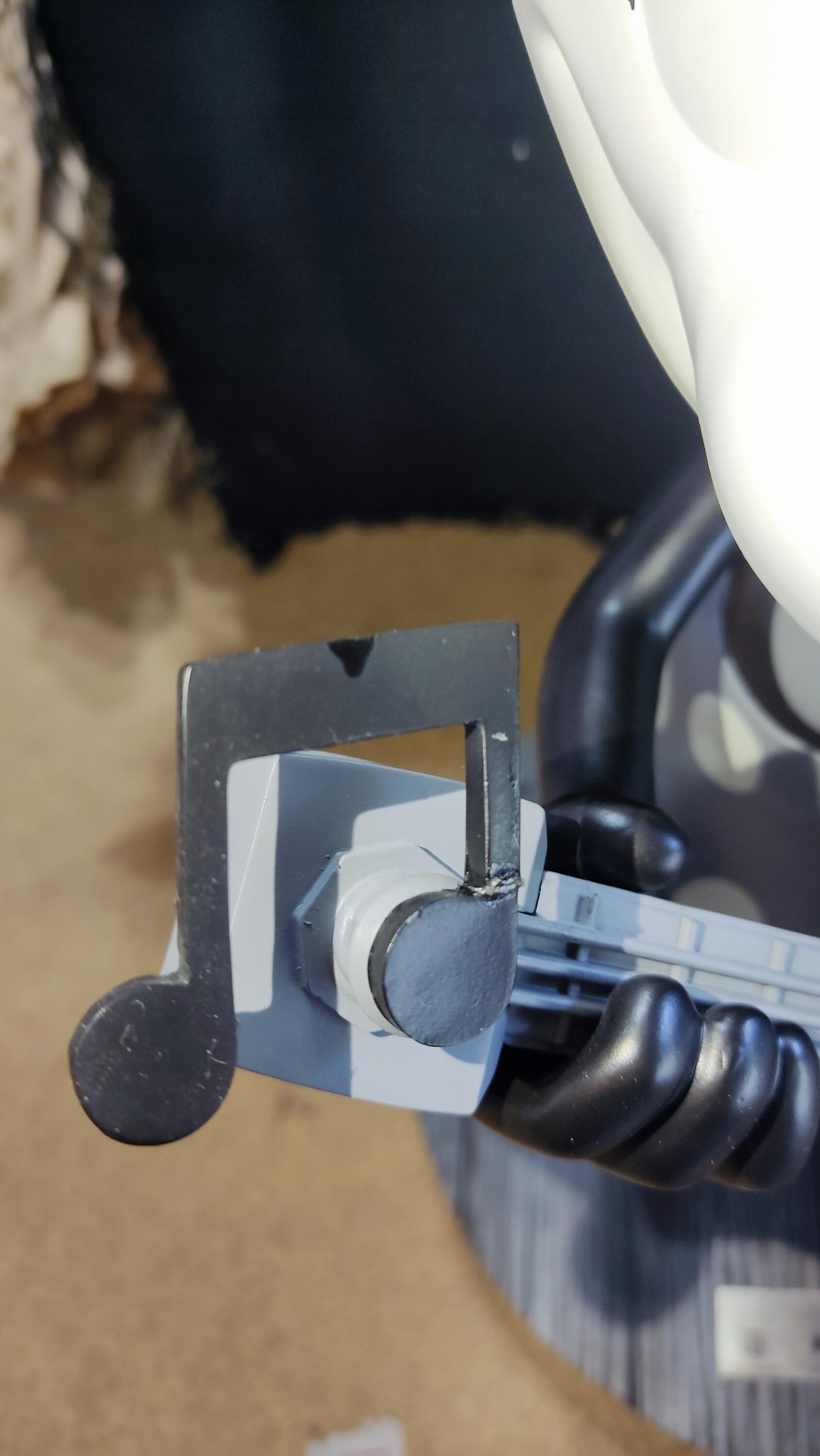 - De muzieknoot is opnieuw bevestigd; een klein spoortje lijm is zichtbaar