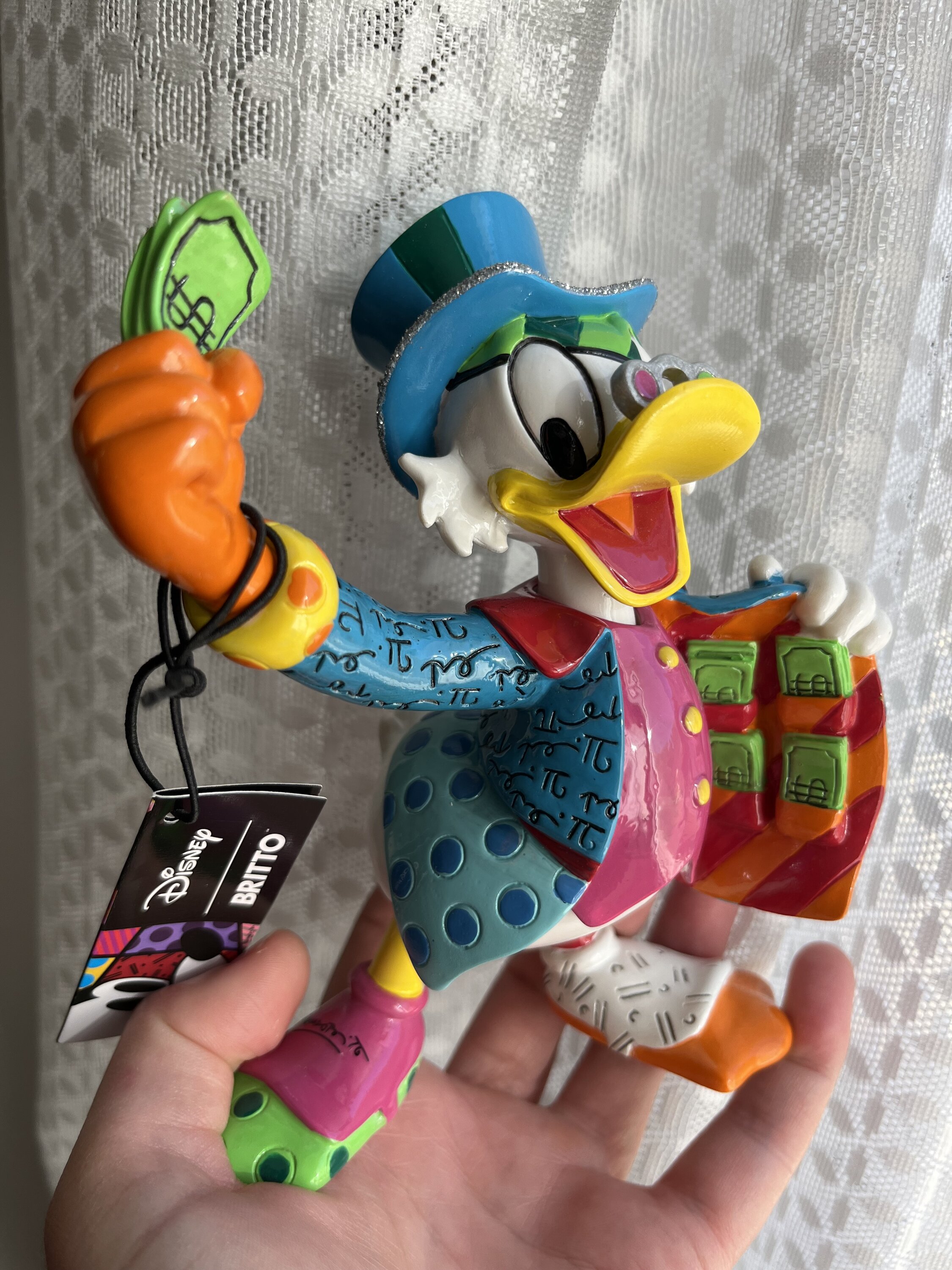 In dit beeldje pronkt Dagobert Duck met zakken vol geld met zijn rijkdom. Elk Disney by Britto-beeldje, gedecoreerd in pop-artstijl door de internationale kunstenaar Roméro Britto, is gemaakt van handgeschilderde hars met een gelakte en glanzende afwerking.