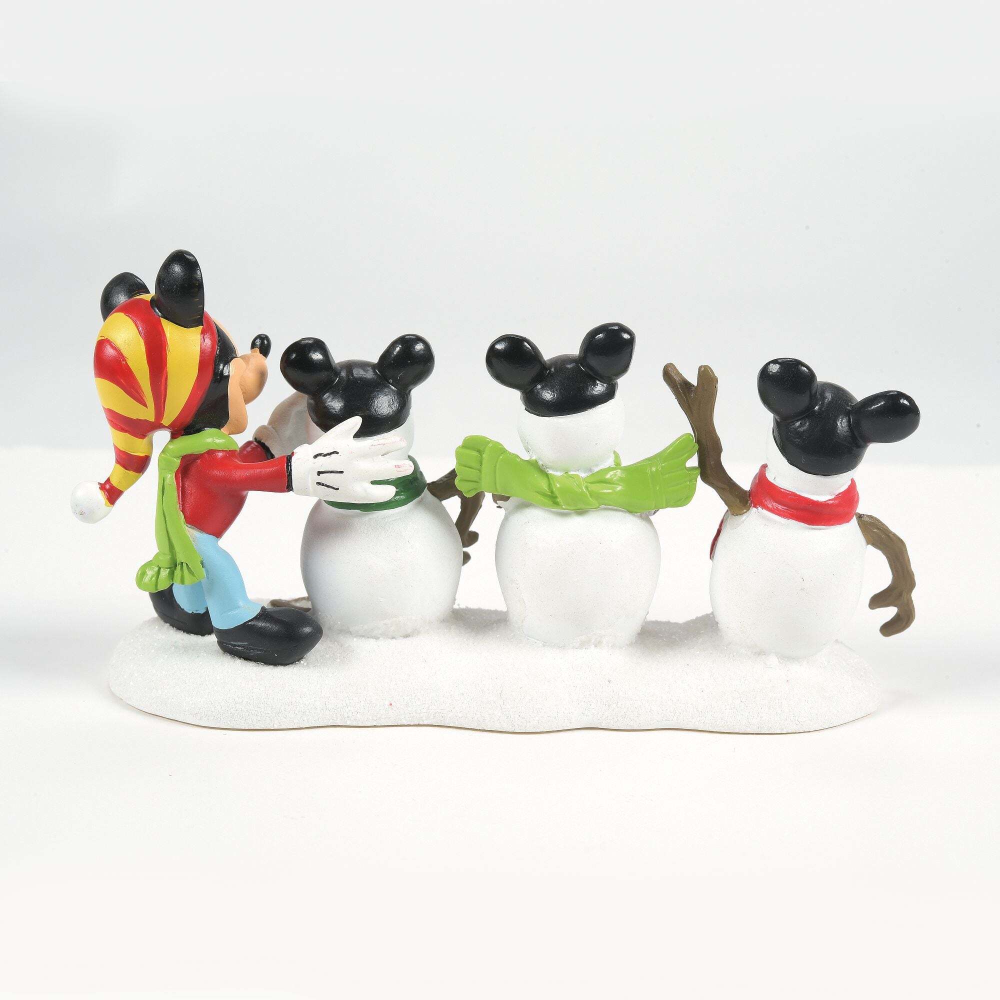 Dit met de hand geschilderd harsbeeldje toont een klassieke Mickey Muis met een gestreepte muts en sjaal, die de laatste hand legt aan zijn drie sneeuwpoppen. In plaats van traditionele mutsen draagt elk van hen de beroemde Mickey Muis -muts met oren. Deze items zijn geen kinderspeelgoed. Alleen bedoeld voor gebruik door volwassenen. Hoogte: 5,5 cm