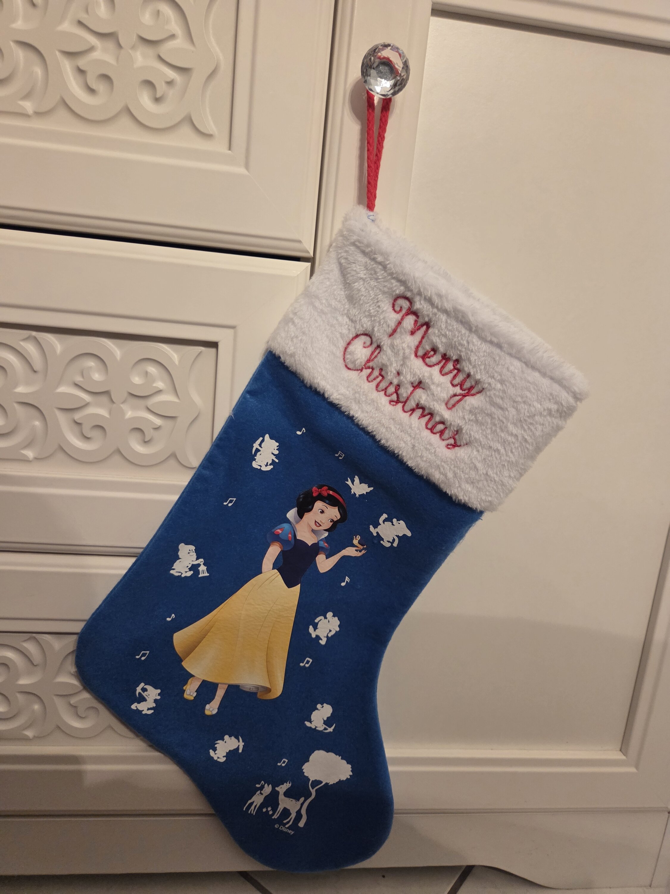 Deze Sneeuwwitje Kerstmis heeft een illustratie van de beroemde Disney prinses in haar iconische jurk. De achtergrond van de sok is effen donkerblauw, met de afbeelding van Sneeuwwitje als accent. Hang hem aan je open haard om een vleugje magie toe te voegen aan je Kerstmis .