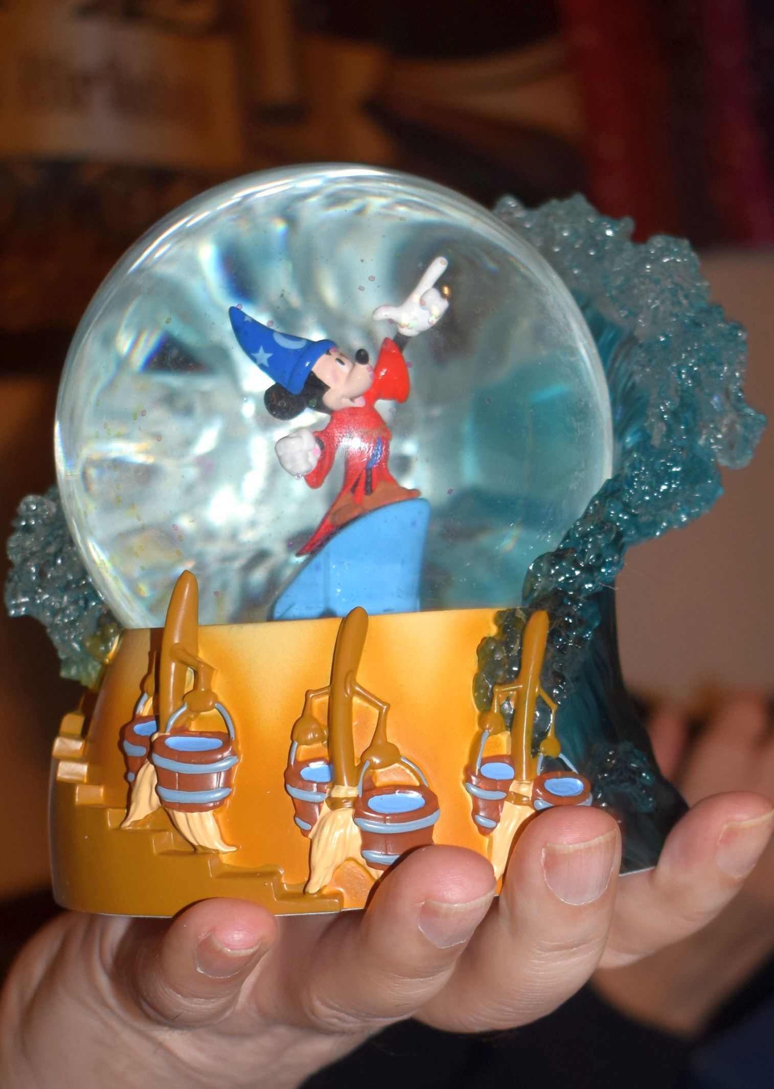 Vier de 85e verjaardag van Walt Disney's animatiemeesterwerk Fantasia met deze 100 mm grote waterbol met de tovenaarsleerling Mickey Muis terwijl hij het water beheerst met magische bezemstelen en brekende golven gemaakt van heldere hars.