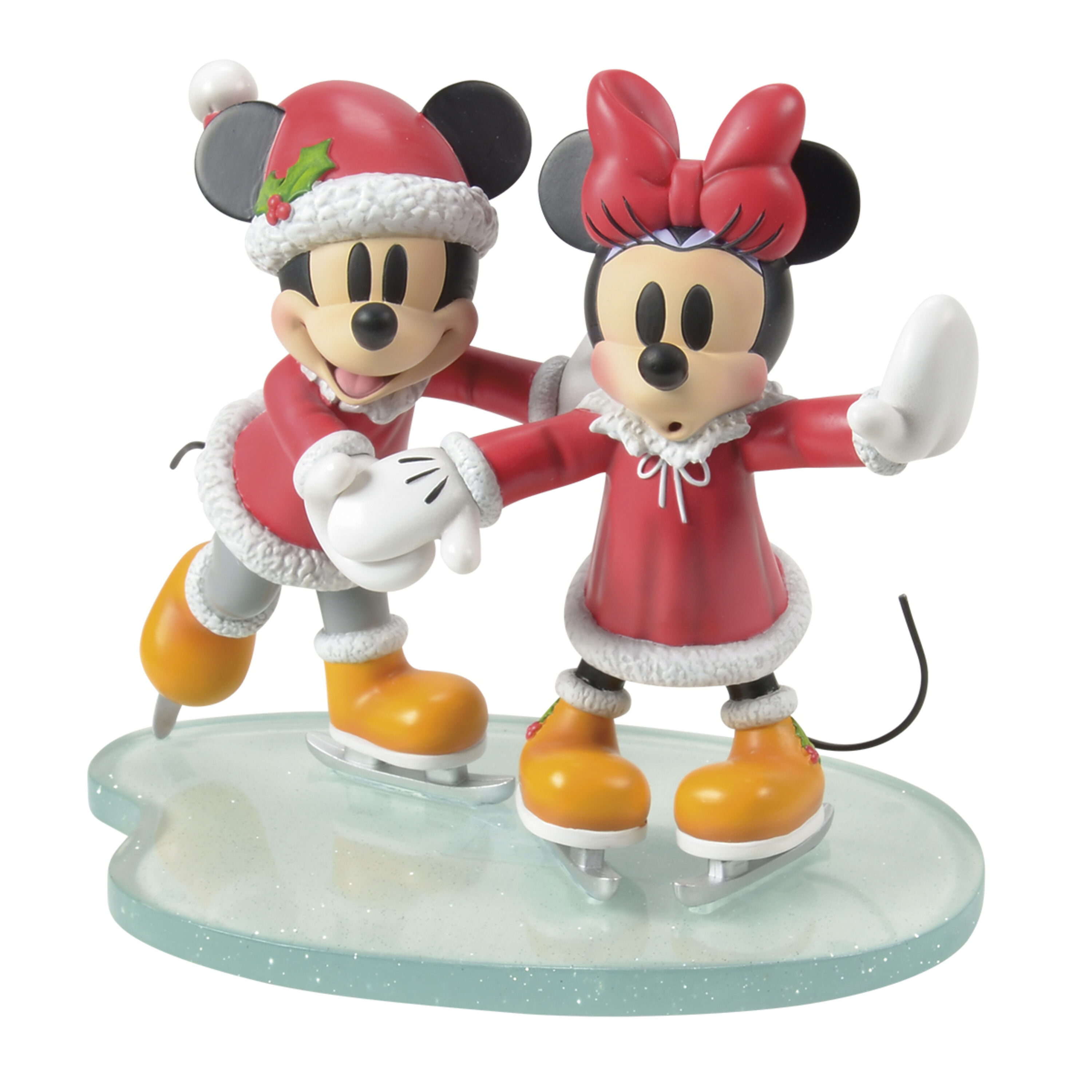 Mickey Muis en Minnie Muis vieren de feestdagen in dit feestelijke vakantietafereel. Mickey houdt Minnie stevig vast terwijl ze over de vijver glijdt.