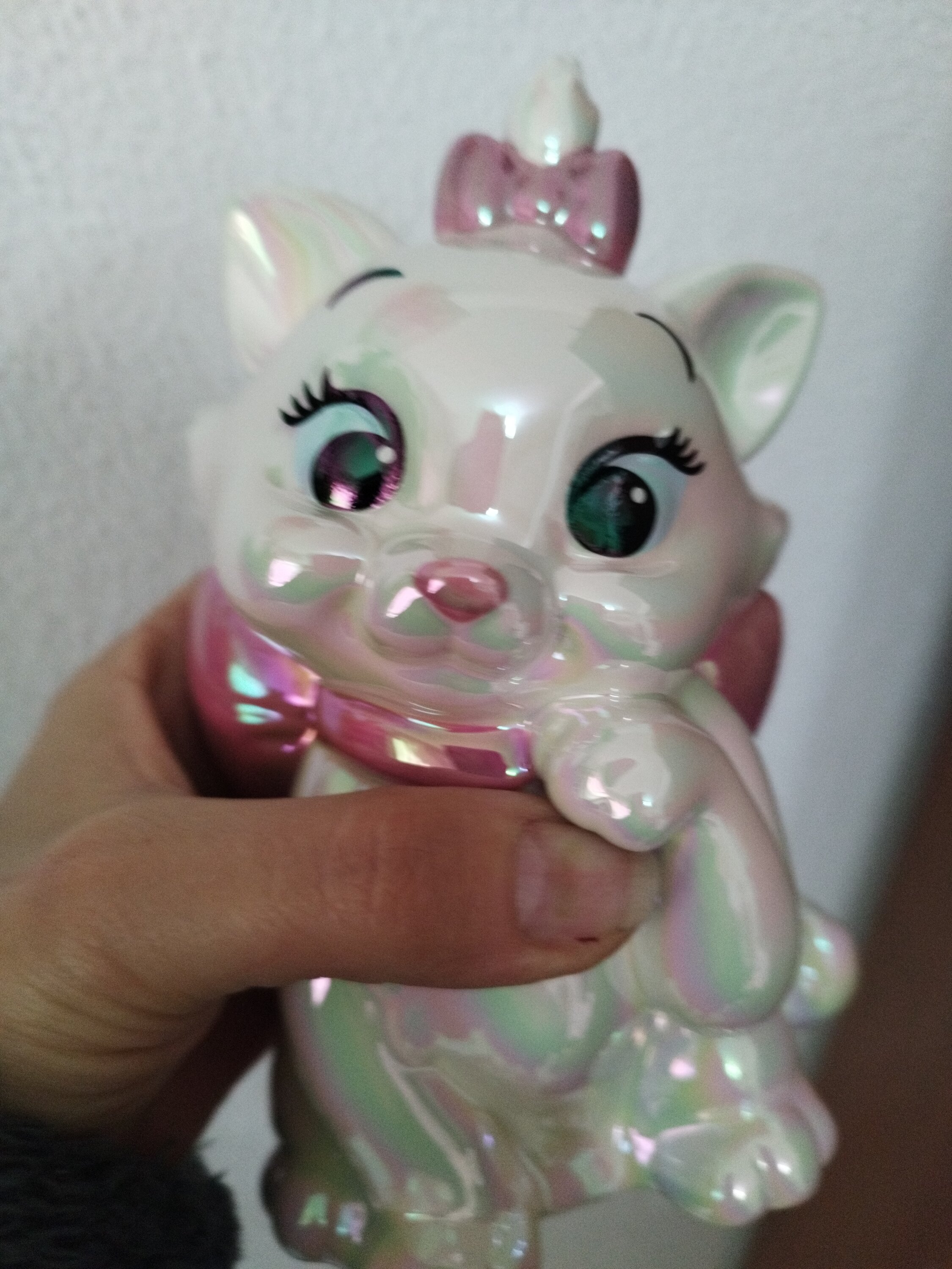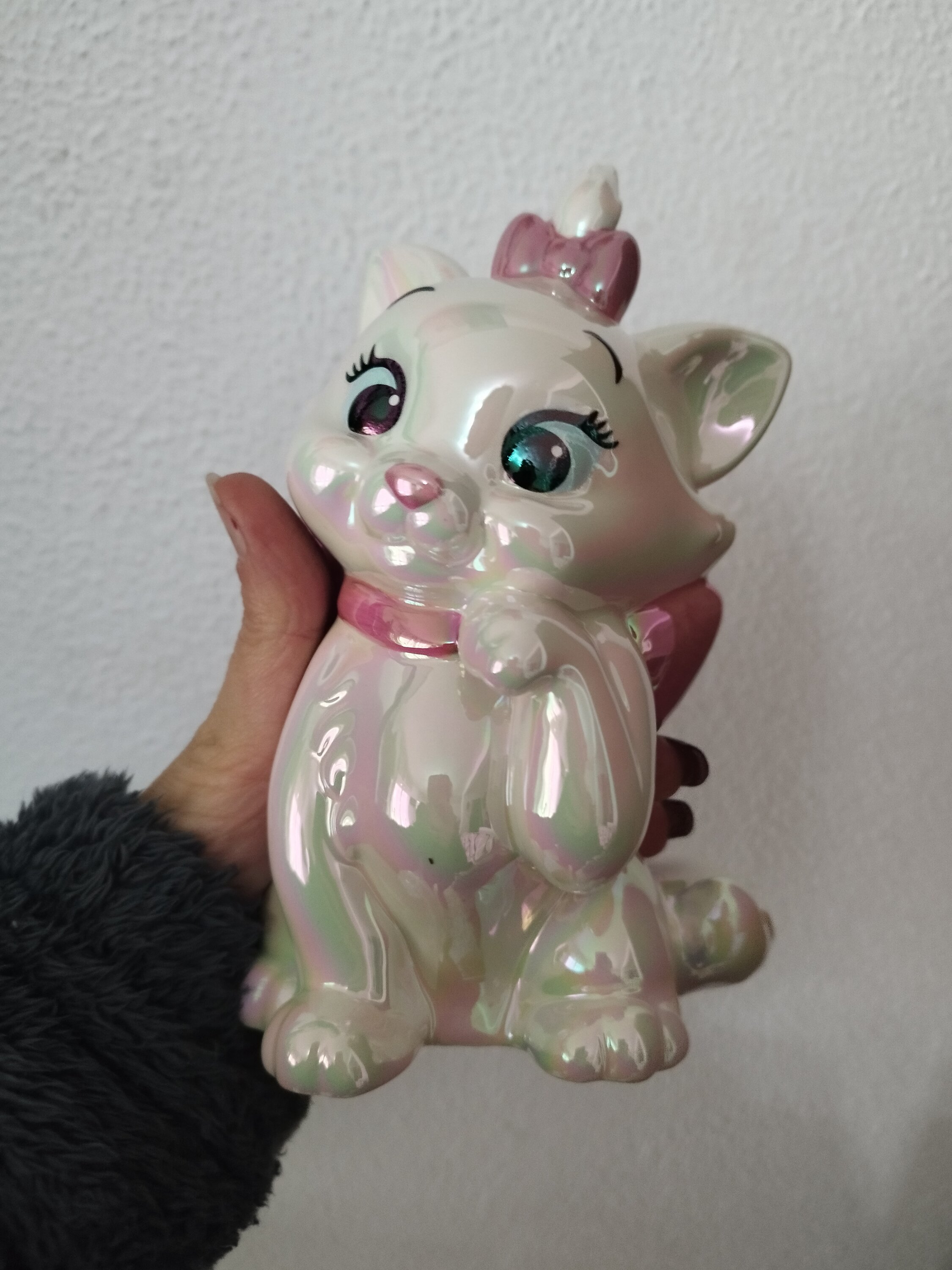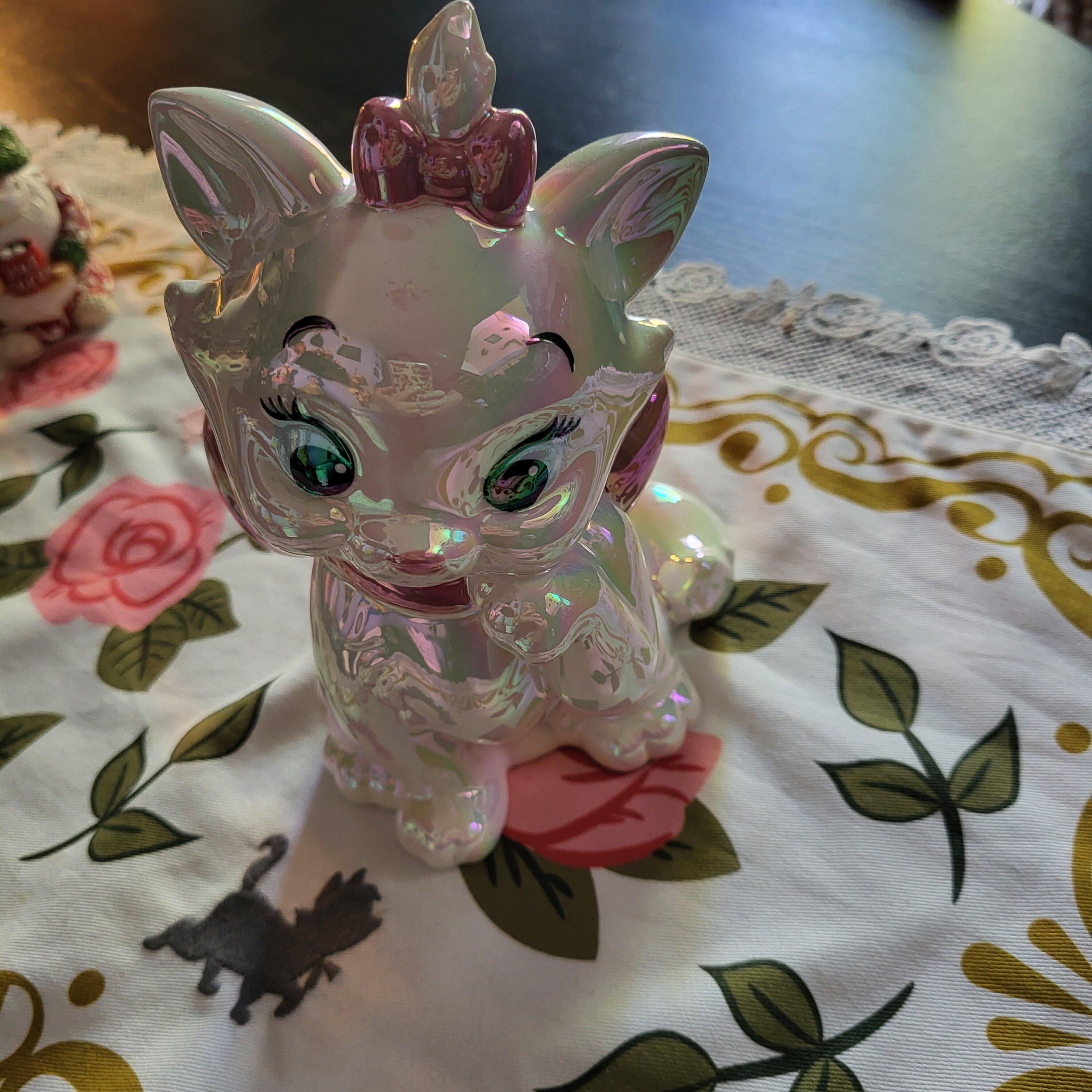 Marie, het schattige poesje uit Disney's animatieklassieker De Aristokatten , is te zien in deze gegoten en met de hand geschilderd keramische spaarpot. Een speciaal galvanisatieproces geeft Marie een unieke en zeer aantrekkelijke iriserende glans.