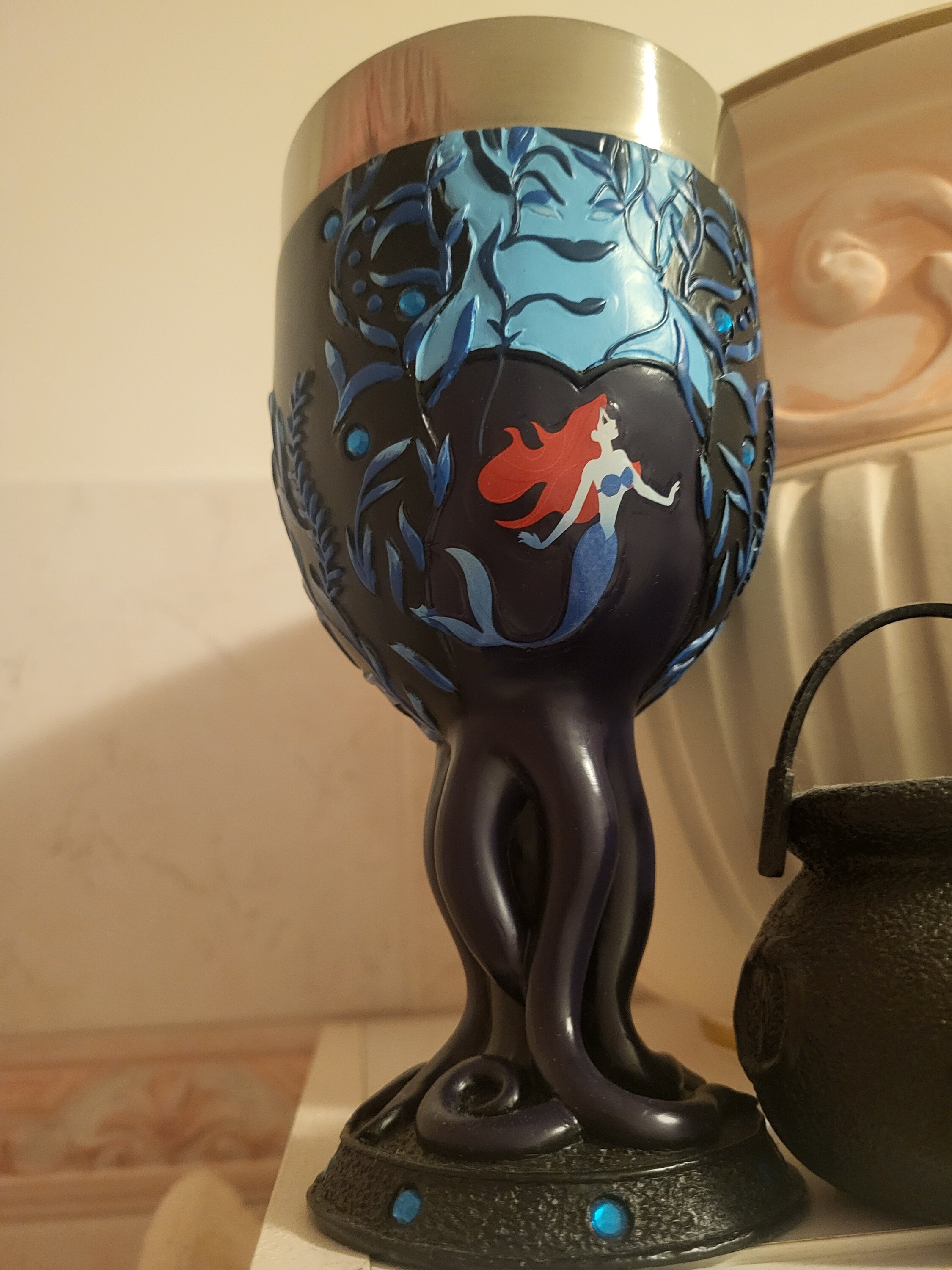 Je mets 3 étoiles à ce calice car je suis un peu déçu au niveau de la peinture qui déborde un peu sur certains motifs et on a dû mal à reconnaitre Ursula par rapport à la photo. Le pied du calice quant à lui est magnifique, les tentacules, les petites pierres incrustées rattrape les petits défauts du calice en lui-même.