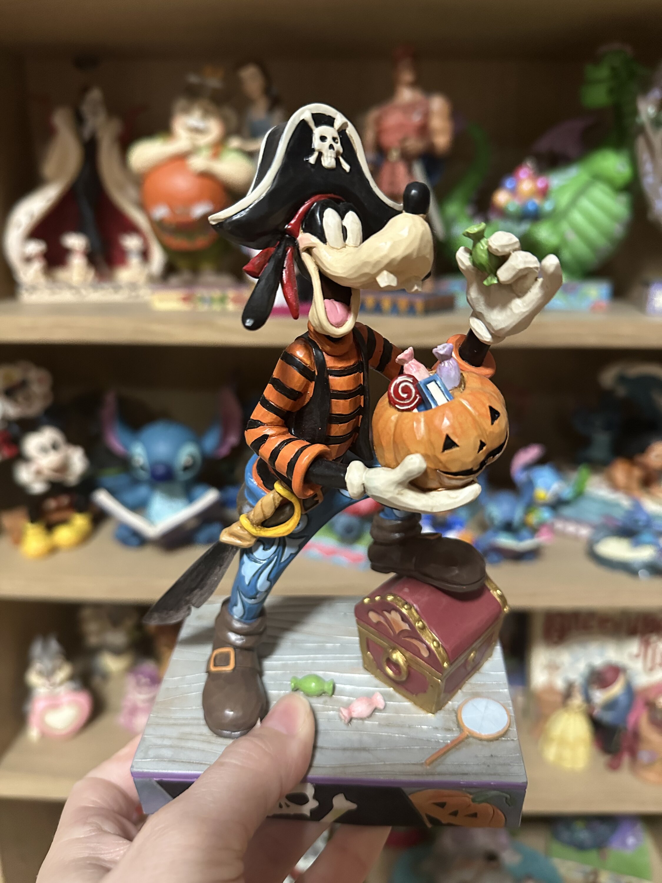 Goofy is helemaal verkleed en klaar voor Halloween in zijn piratenkostuum. Ontworpen door Jim Shore voor de Disney Traditions collectie, het is met de hand gebeeldhouwd en geschilderd.