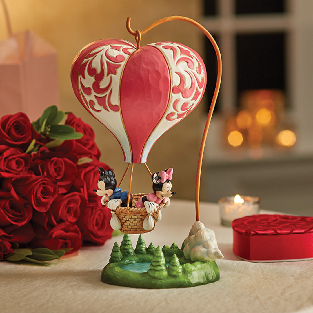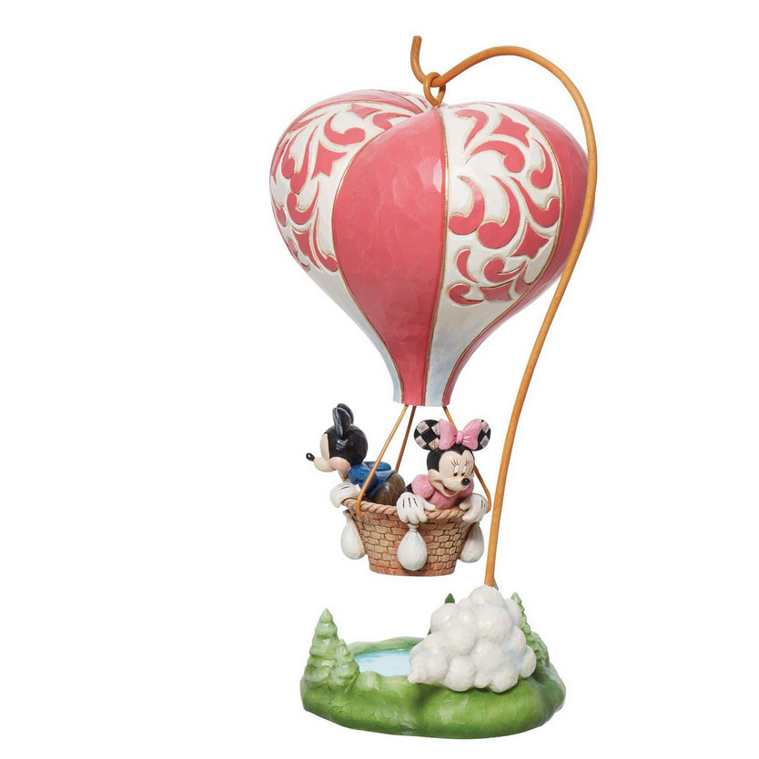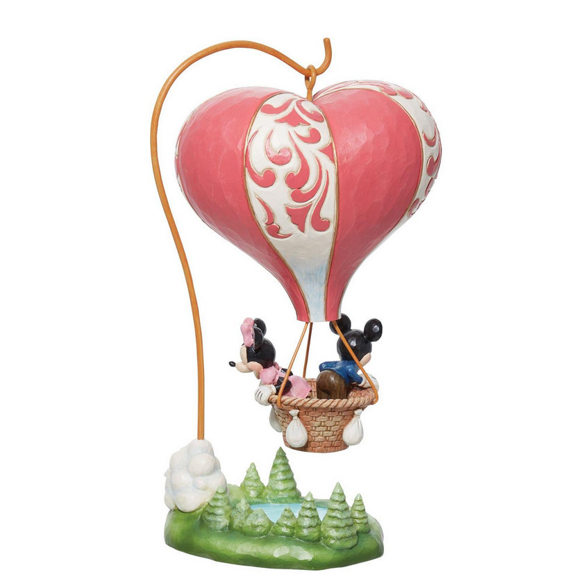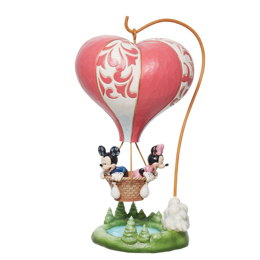 Geweldig beeldje van Mickey en Minnie aan boord van een hartvormige luchtballon, voortgestuwd door liefde, wat een prachtig romantisch tafereel oplevert.