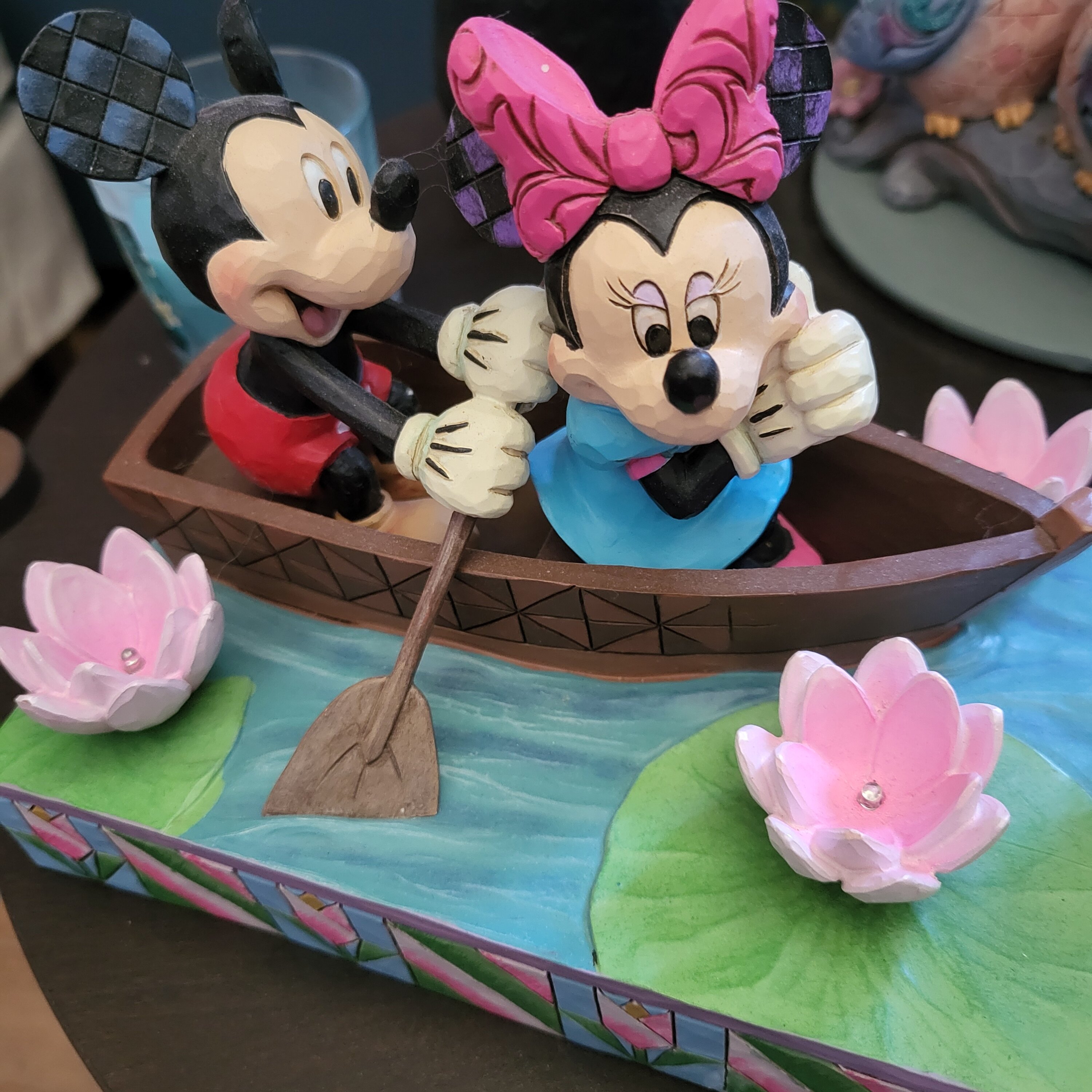 Jim Shore creëert een romantische scène met geliefde personages, Mickey en Minnie Muis, aan boord van een schilderachtige roeiboot, badend in de gloed van rust. Te midden van de rust van de natuur sieren bloeiende bloemen hun ontmoetingsplaats in de rivier terwijl de twee tortelduifjes verder drijven.