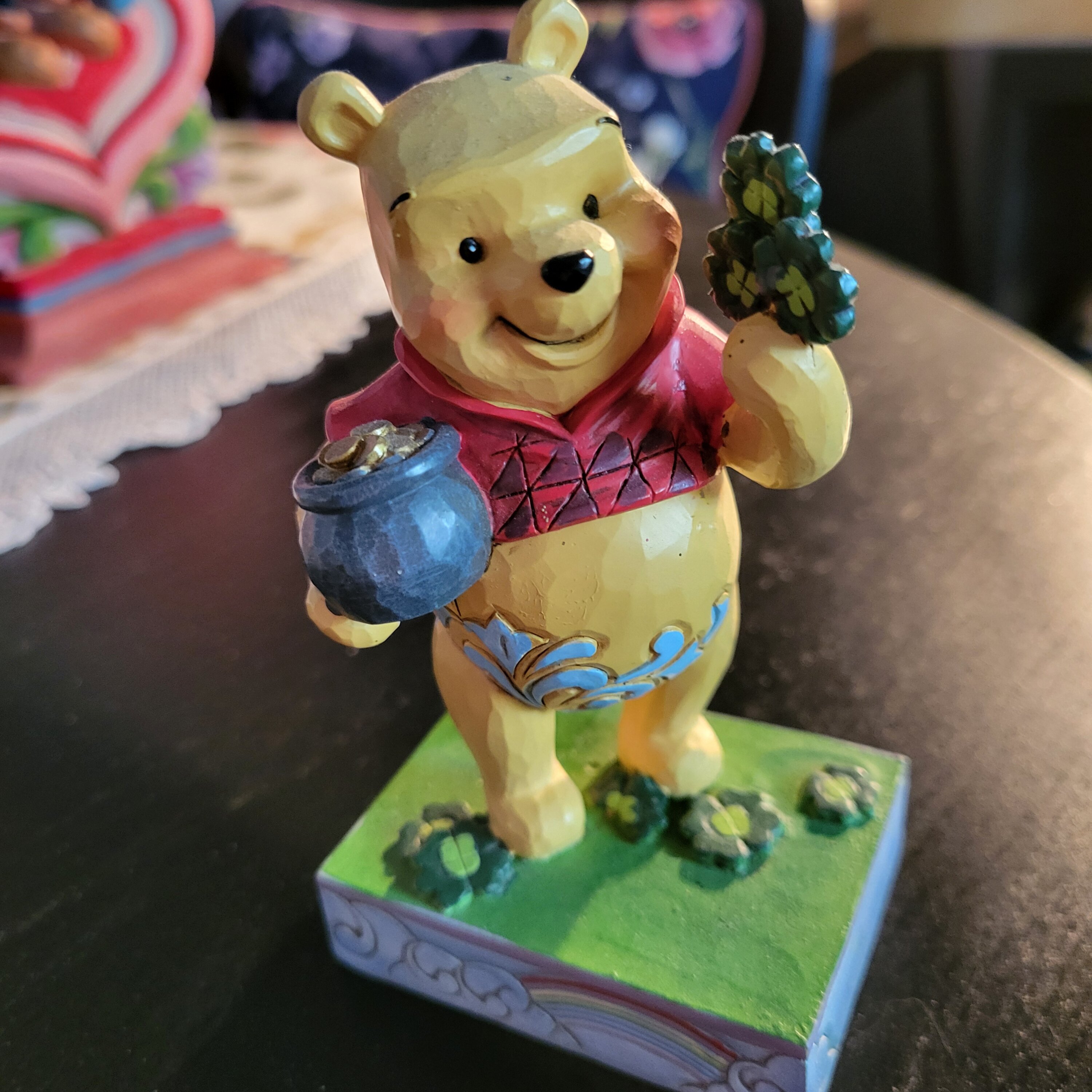 Adorable winnie de petite taille avec son trèfle son côté Irlande de jolies couleurs tout dans le détail le socle arc en ciel