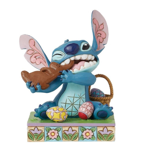 Geniet van de grillige charme van Jim Shore terwijl Stitch de alien zich overgeeft aan Pasen , omringd door een kleurrijke reeks Pasen . Met kattenkwaad in zijn ogen knabbelt Stitch vrolijk aan een chocoladekonijntje met aanstekelijke vreugde.