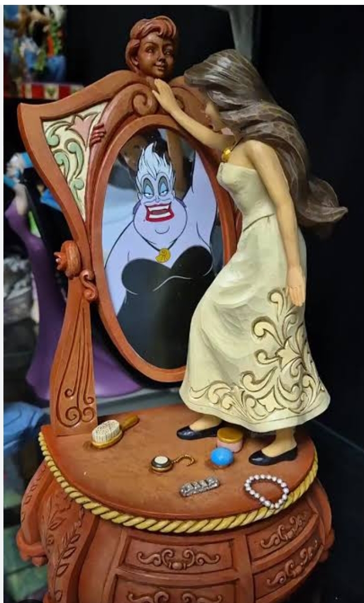 In dit betoverende stuk van Jim Shore wordt Ursula, de zeeheks, afgebeeld in haar menselijke vorm, gefixeerd terwijl ze in een spiegel staart die onthult haar ware aard. In de meest verfijnde details legt de scène de slechterik vast op een transformerend moment.