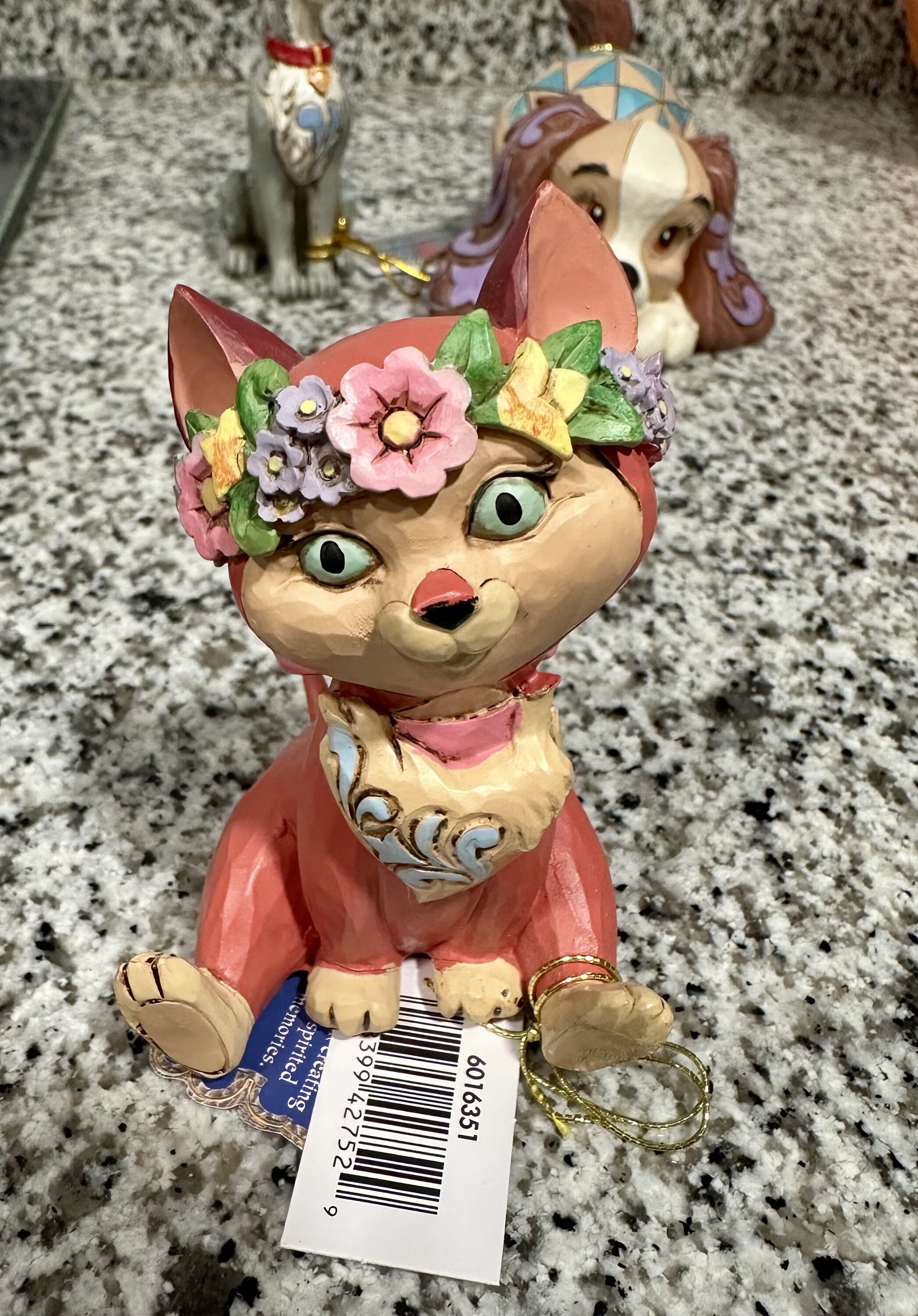 Dit unieke Jim Shore -ontwerp toont Dinah de kat uit Alice in Wonderland, versierd met een charmante bloemenkroon en ingewikkelde rozemarijn. Het speelse stuk nodigt ons uit om het konijnenhol in te gaan in een wereld van verbeelding en magie.