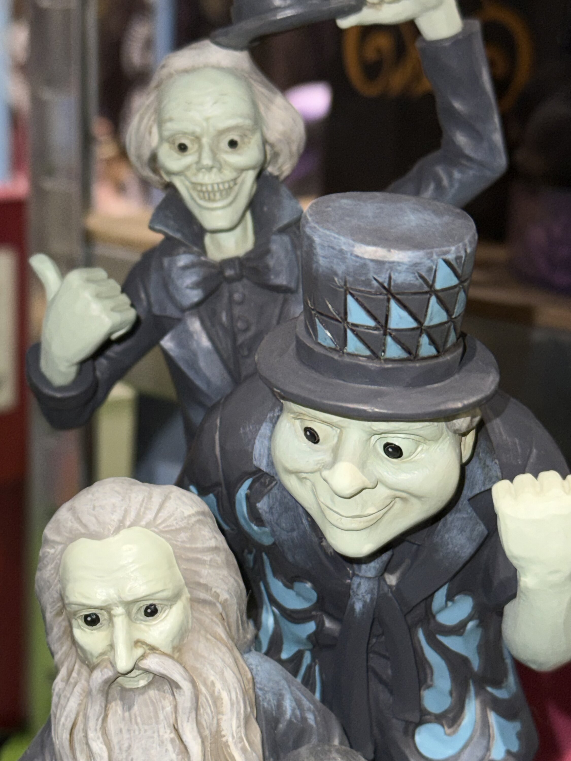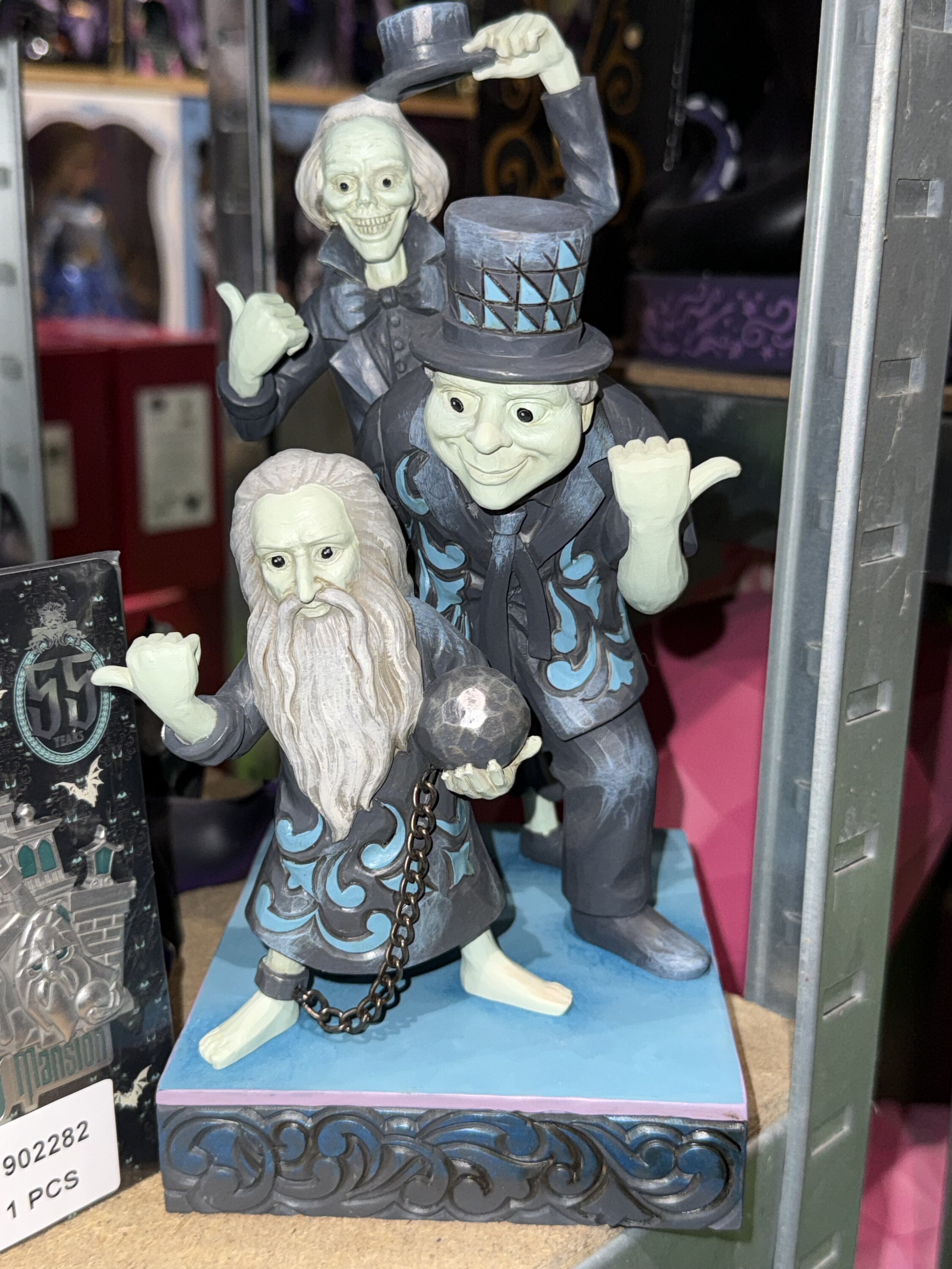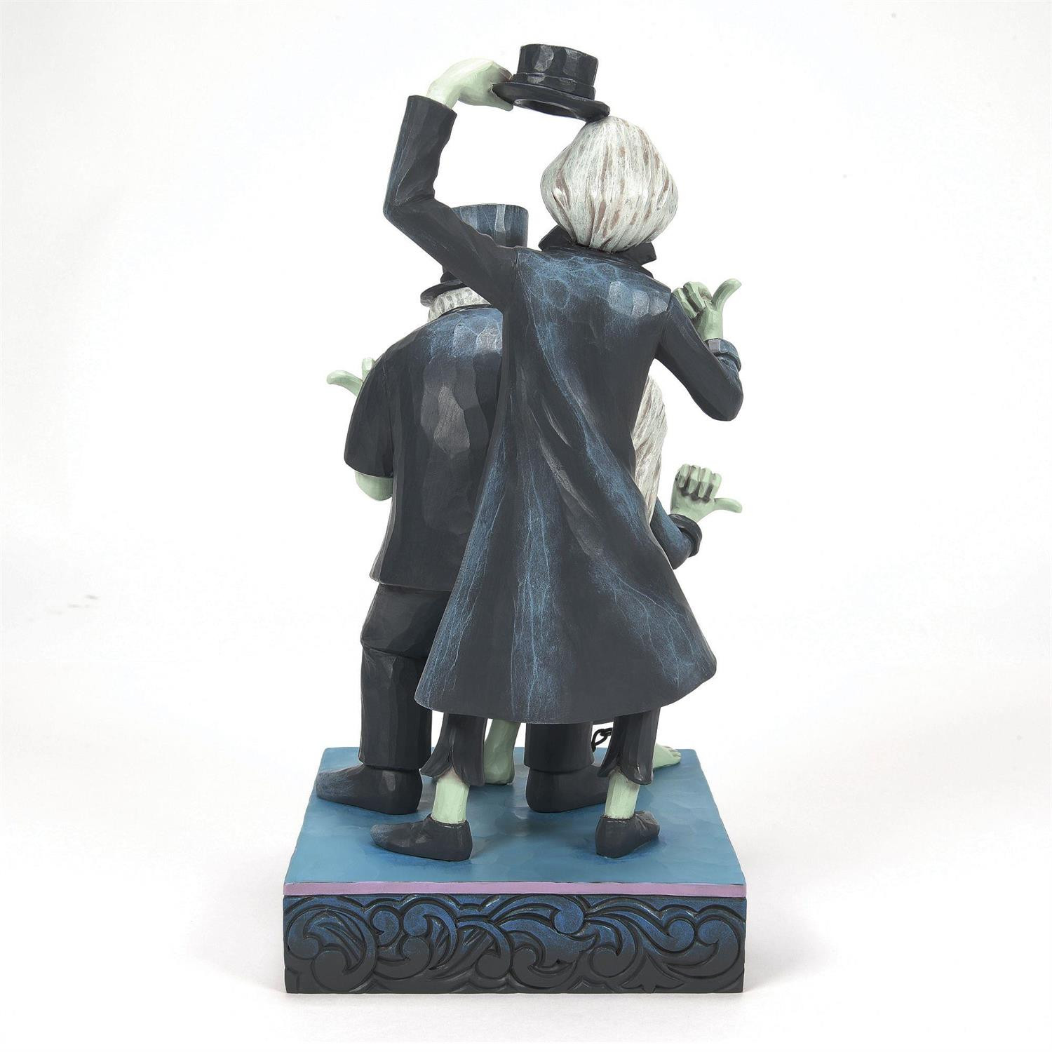 In dit Jim Shore -beeldje staan de drie autostop geesten uit het Haunted House samen, elk met een decoratief gepatroneerde duim. Met hoopvolle blikken proberen ze de oversteek naar het hiernamaals te maken. Wordt geleverd in een speciaal ontworpen geschenkdoos. Ontworpen door de bekroonde kunstenaar en beeldhouwer Jim Shore voor het merk Disney Traditions . Deze figuren zijn geen kinderspeelgoed. Alleen bedoeld voor volwassenen.