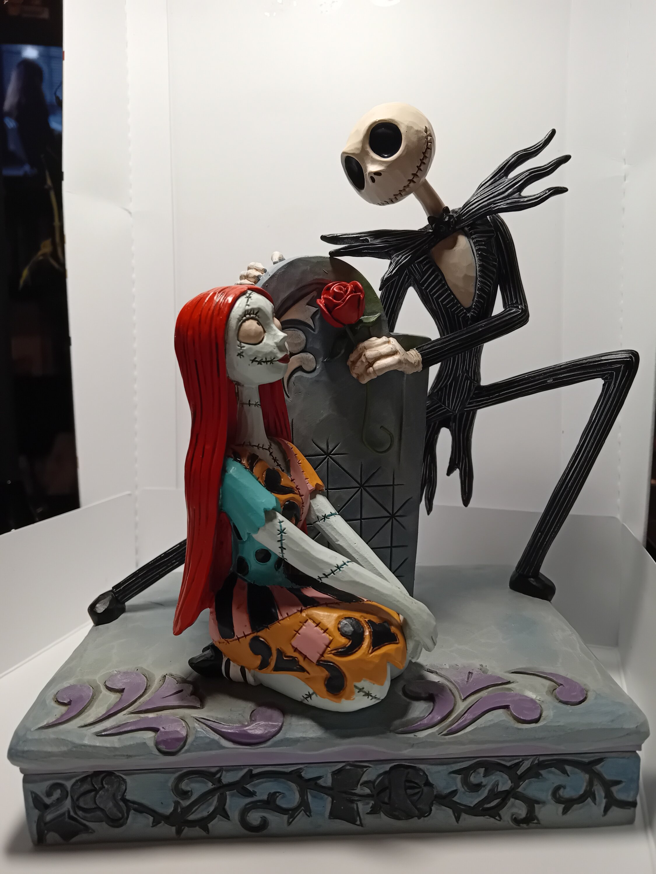 In dit prachtige Jim Shore beeldje delen Jack en Sally, het unieke stel uit The Nightmare Before Christmas, een teder moment op een begraafplaats. Naast een grafsteen geeft Jack Sally een roos. Geleverd in een geschenkdoos. Ontworpen door de bekroonde kunstenaar en beeldhouwer Jim Shore voor het merk Disney Traditions . Deze figuren zijn geen kinderspeelgoed. Alleen bedoeld voor volwassenen.
