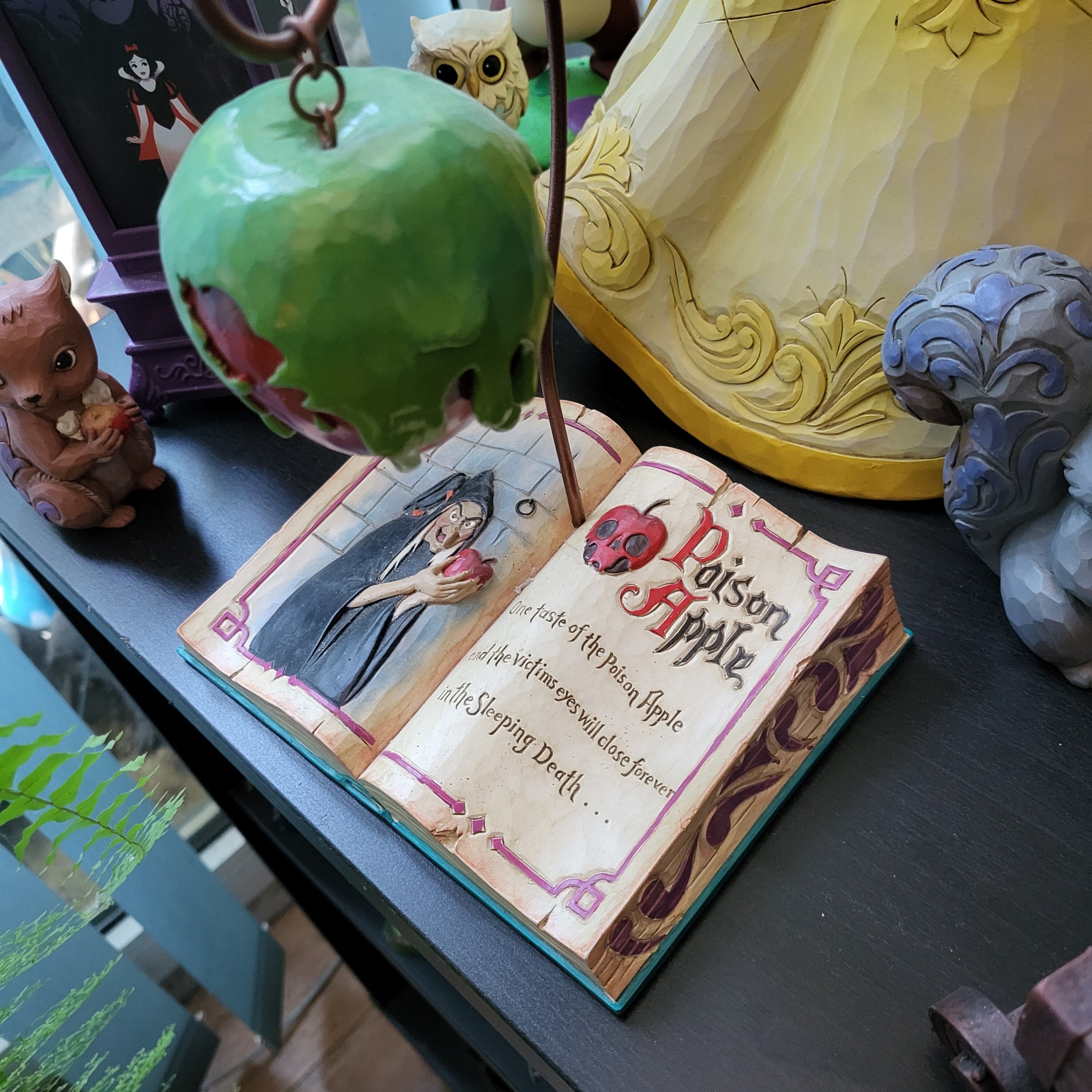 Dit Jim Shore beeldje toont Sneeuwwitjes spreukenboek geopend, waarbij een pagina verschijnt die is gewijd aan de Poison Apple met een illustratie van de Evil Queen. De appel hangt voorzichtig aan een draad die uit het boek komt! Ontworpen door de bekroonde kunstenaar en beeldhouwer Jim Shore voor het merk Disney Traditions . Deze figuren zijn geen kinderspeelgoed. Alleen bedoeld voor volwassenen.