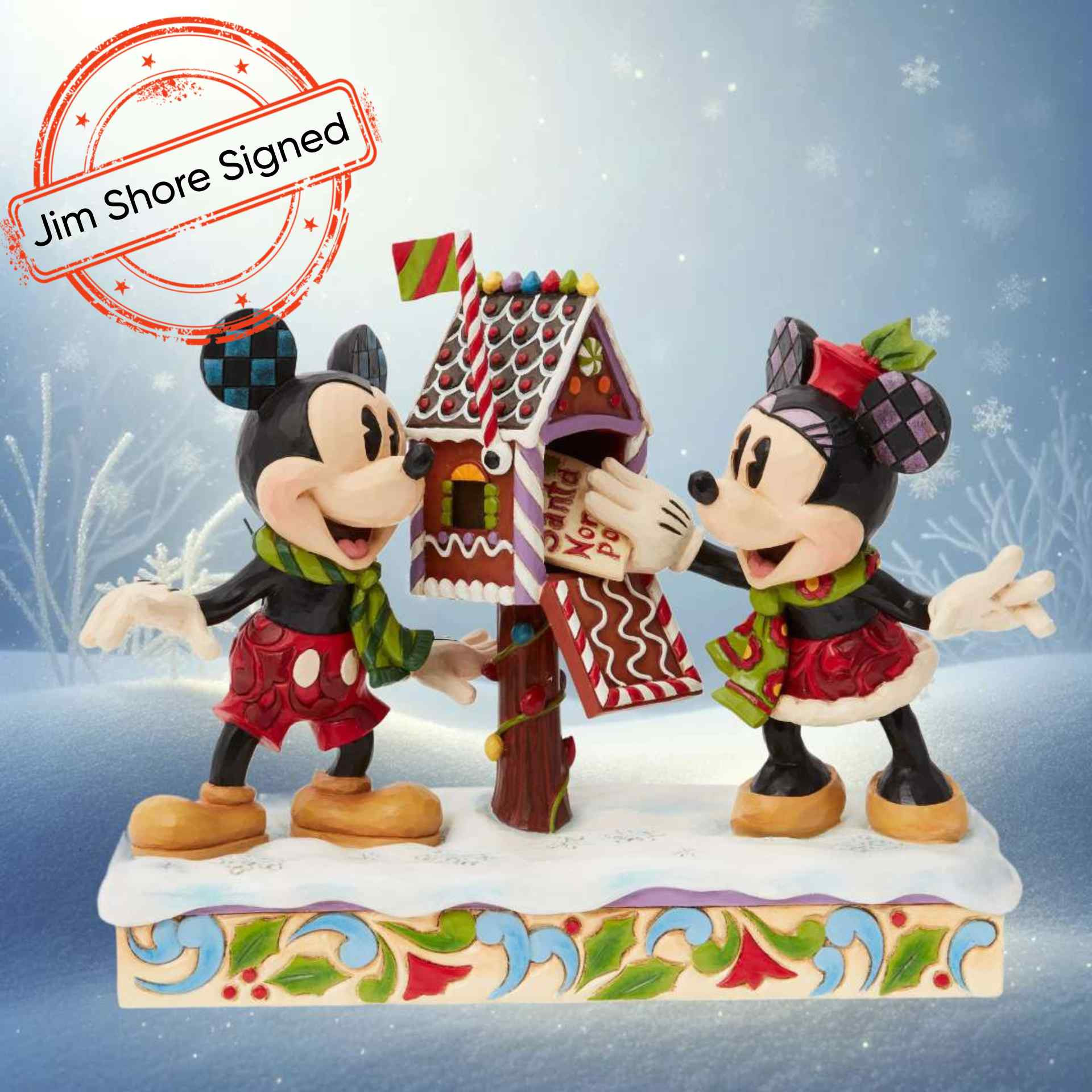 Mickey en Minnie Muis komen in de Kerstmis met Disney Traditions van Jim Shore. Een prachtig feestelijk beeldje met het iconische stel dat hun Kerstmis naar de Kerstman stuurt. Met de hand gesneden en beschilderd.