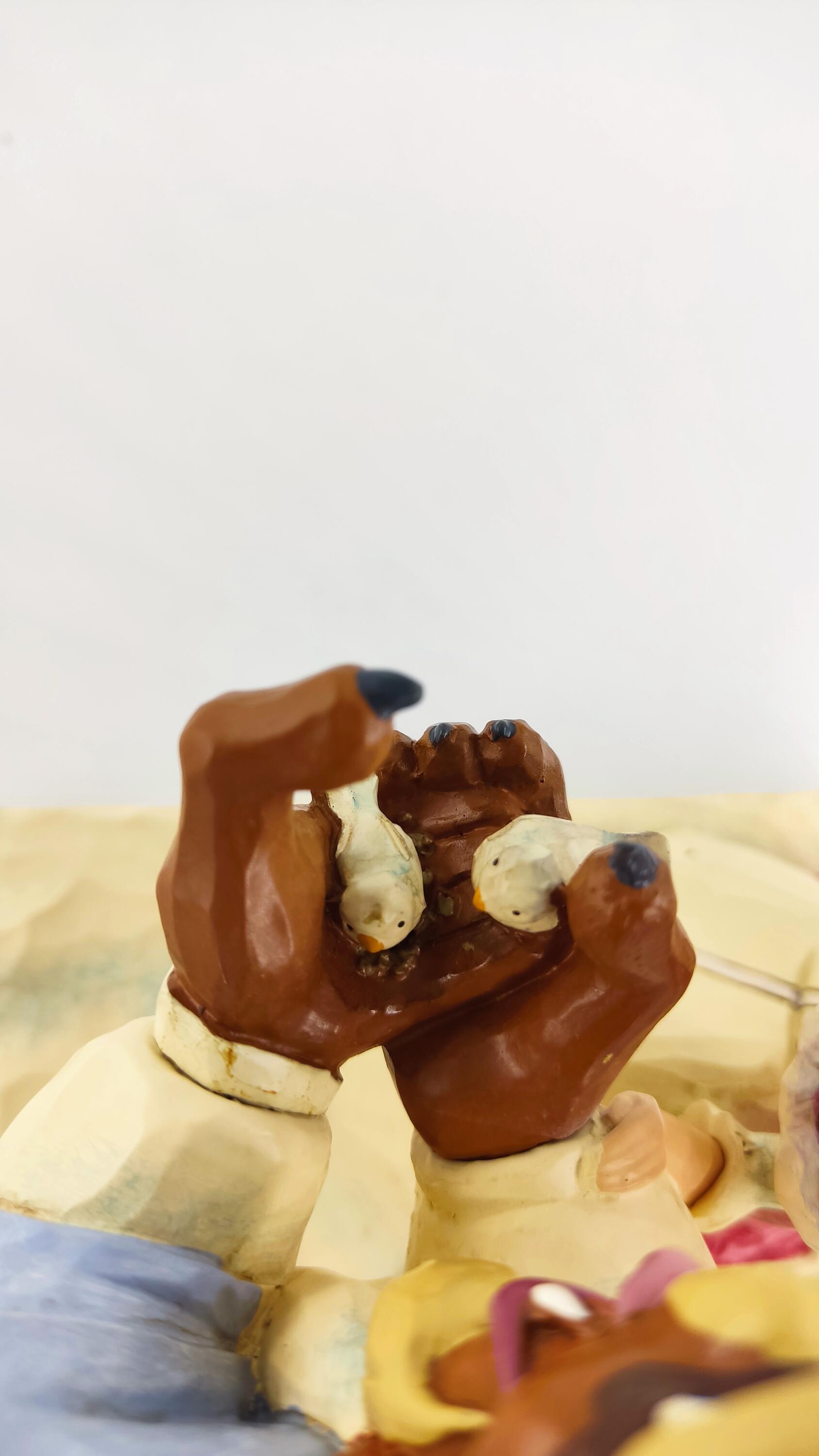 Magnifique scène de la belle et la bête dans la neige... avec les petits oiseaux... Les détails sont bien présents, même les petites graines par terre qu ils donnent aux oiseaux...