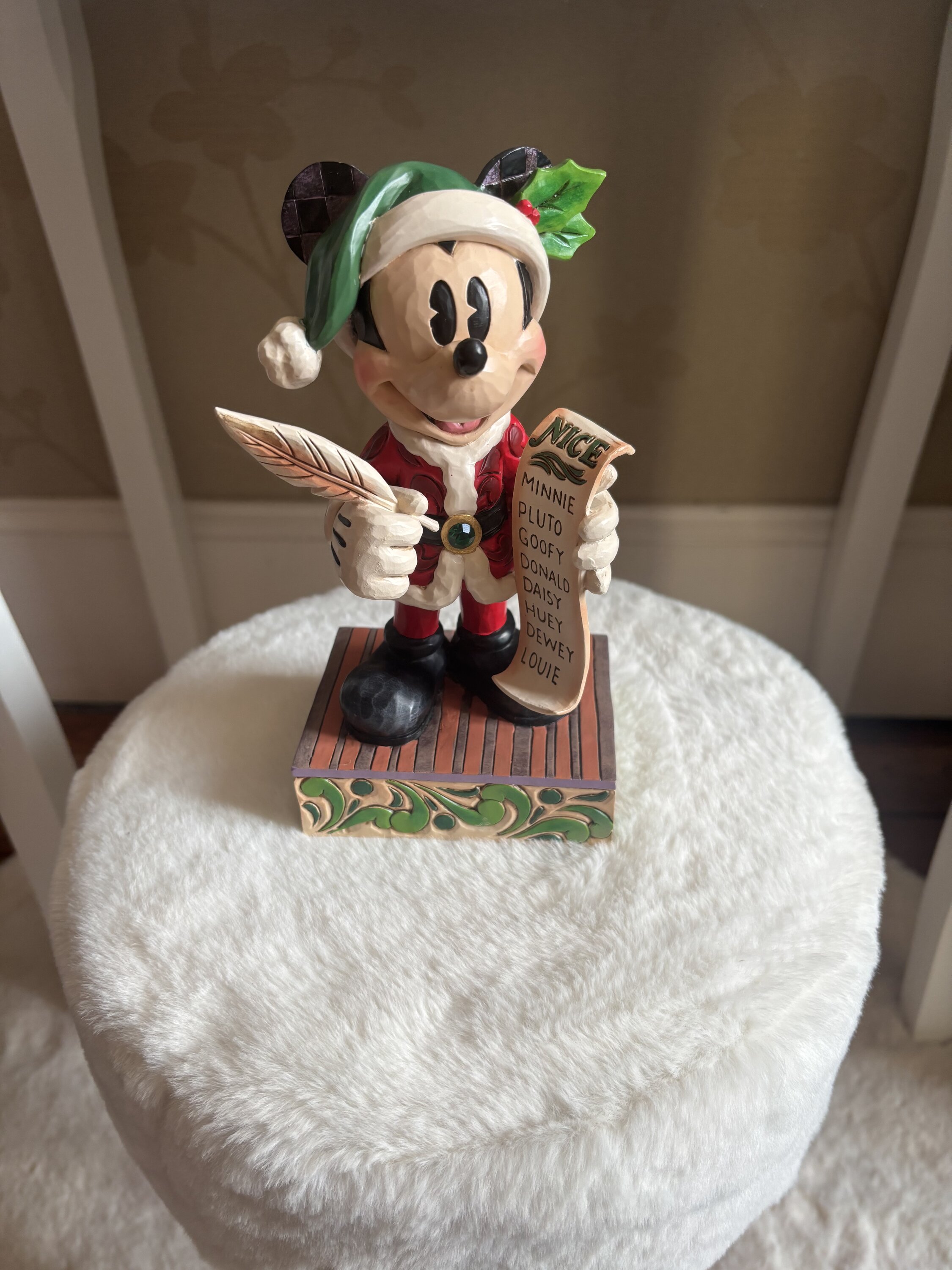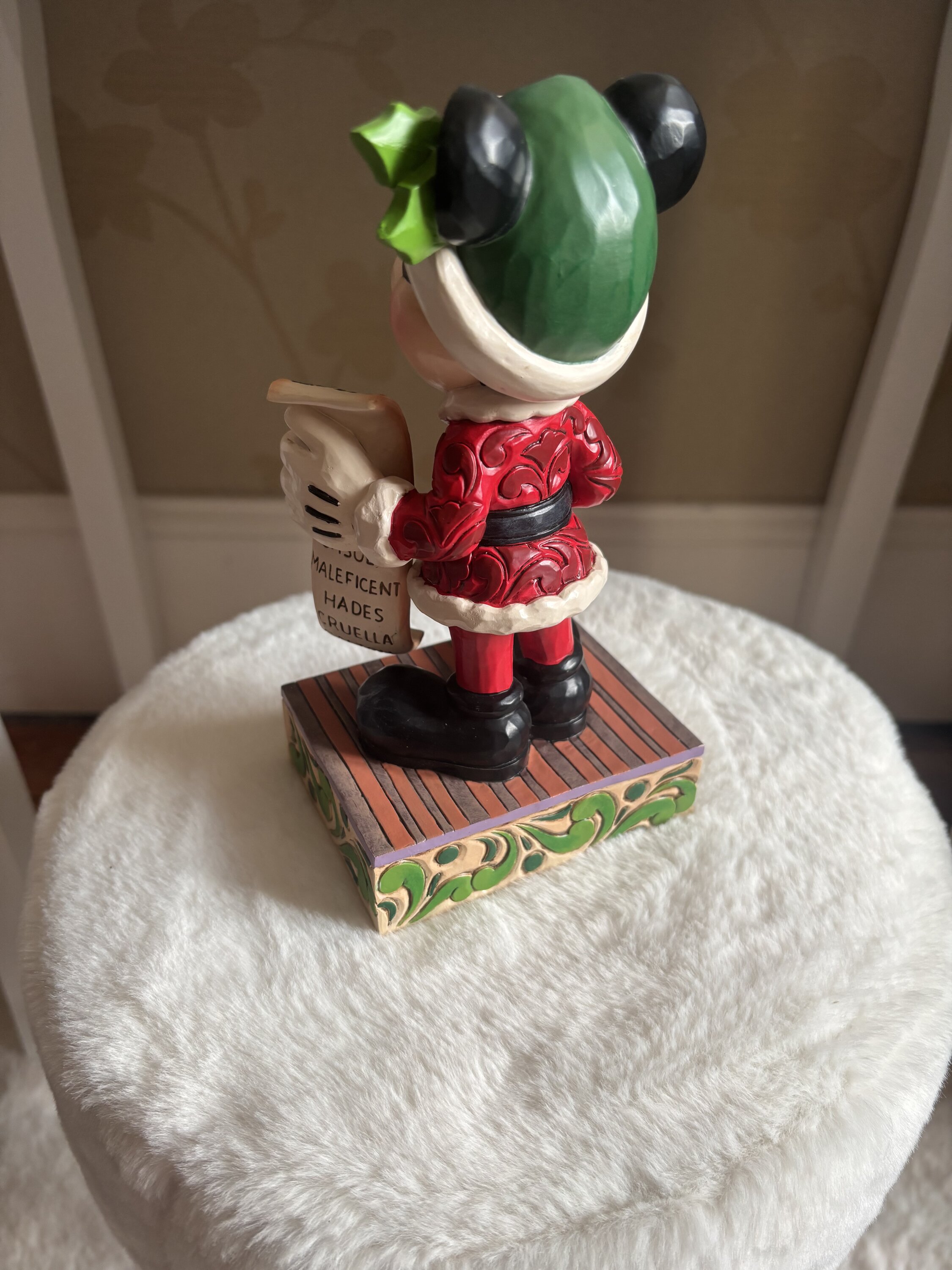 In deze betoverende Jim Shore Kerstmis draagt Mickey Muis een opvallend rood rozenkranspak met een groene juwelenriem en een kerstmuts versierd met hulst. Hij houdt een pen vast en een lijst met Naughty and Nice Disney-personages met een glimlach.