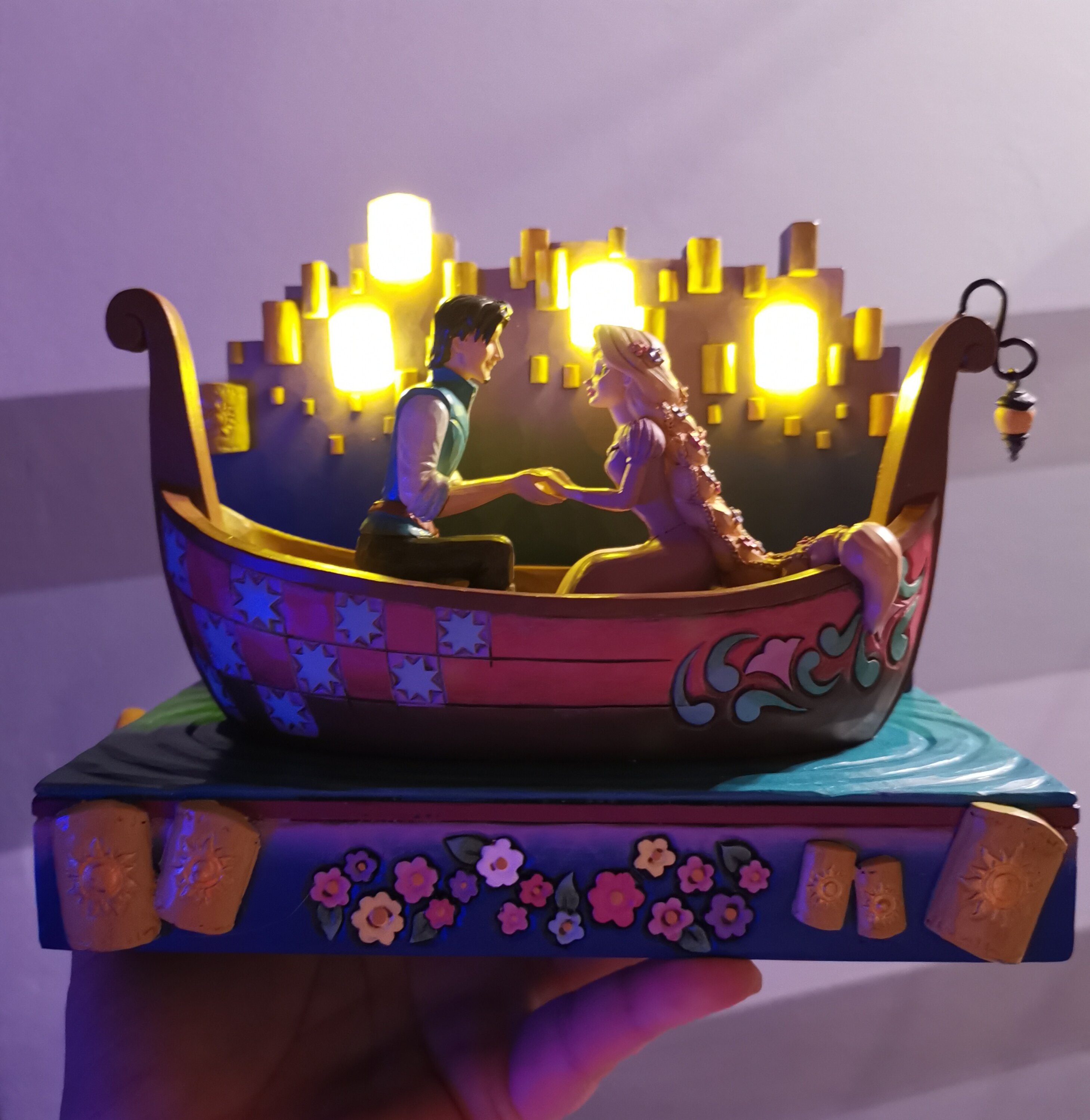 In dit prachtige Jim Shore ontwerp delen Rapunzel en Flynn Rider een romantische boottocht door gloeiende LED-drijvende lantaarns. Rapunzel's charme schittert met bloemen in haar haar en legt de betovering vast. De boot is voorzien van Jim Shore's iconische details.