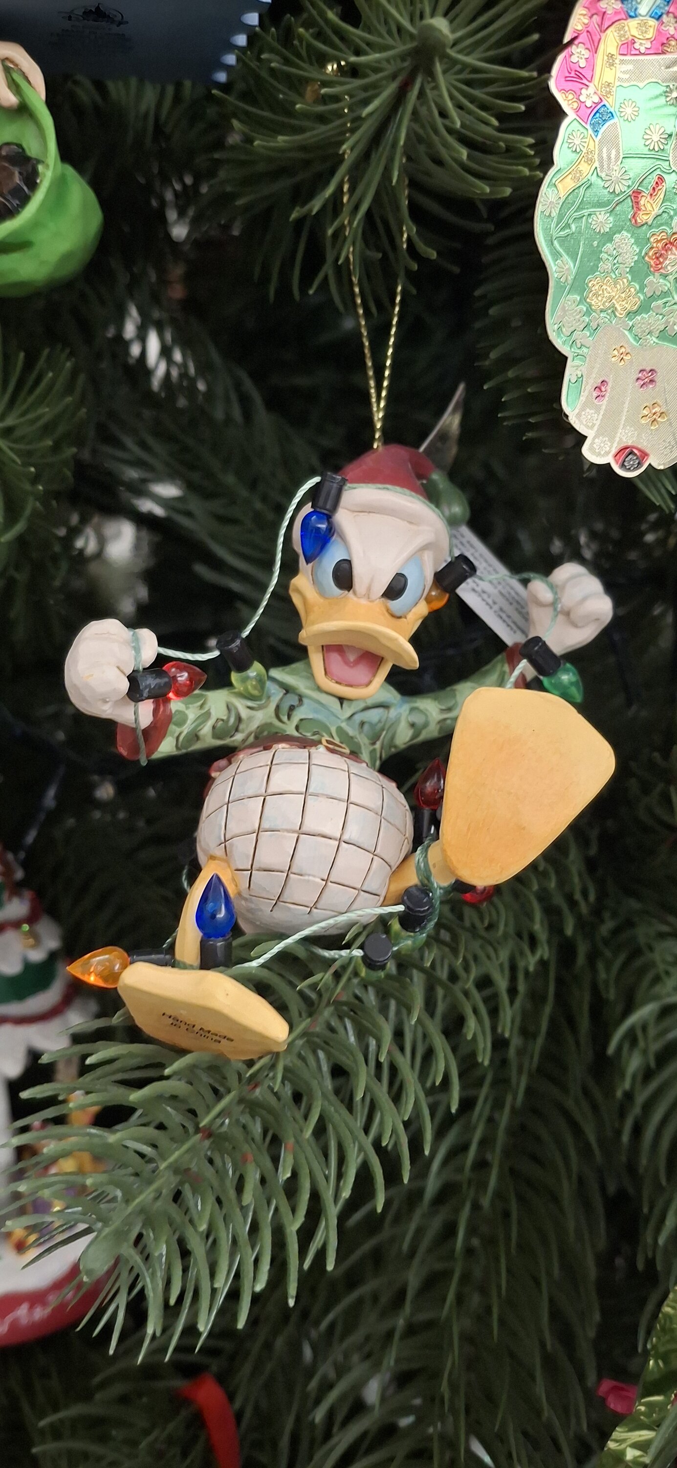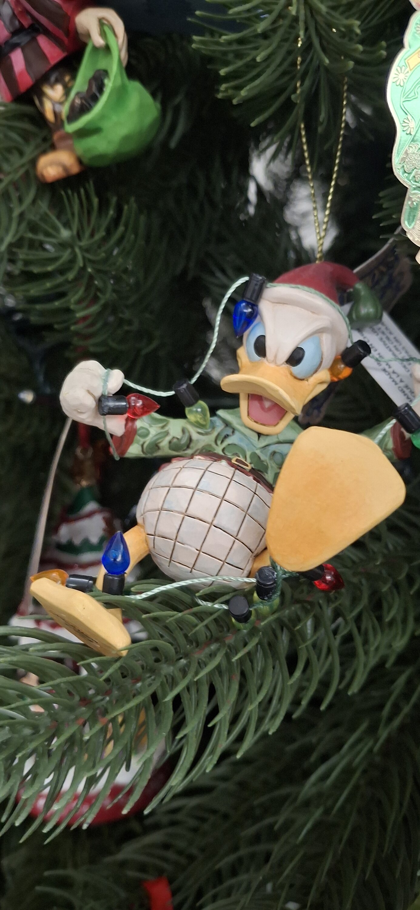 Een heel schattig ornament, met Donald Duck die probeert te ontsnappen aan de kerstverlichting. Prachtig gemaakt, zoals altijd. Het wordt mijn nieuwe aanwinst voor de kerstboom.