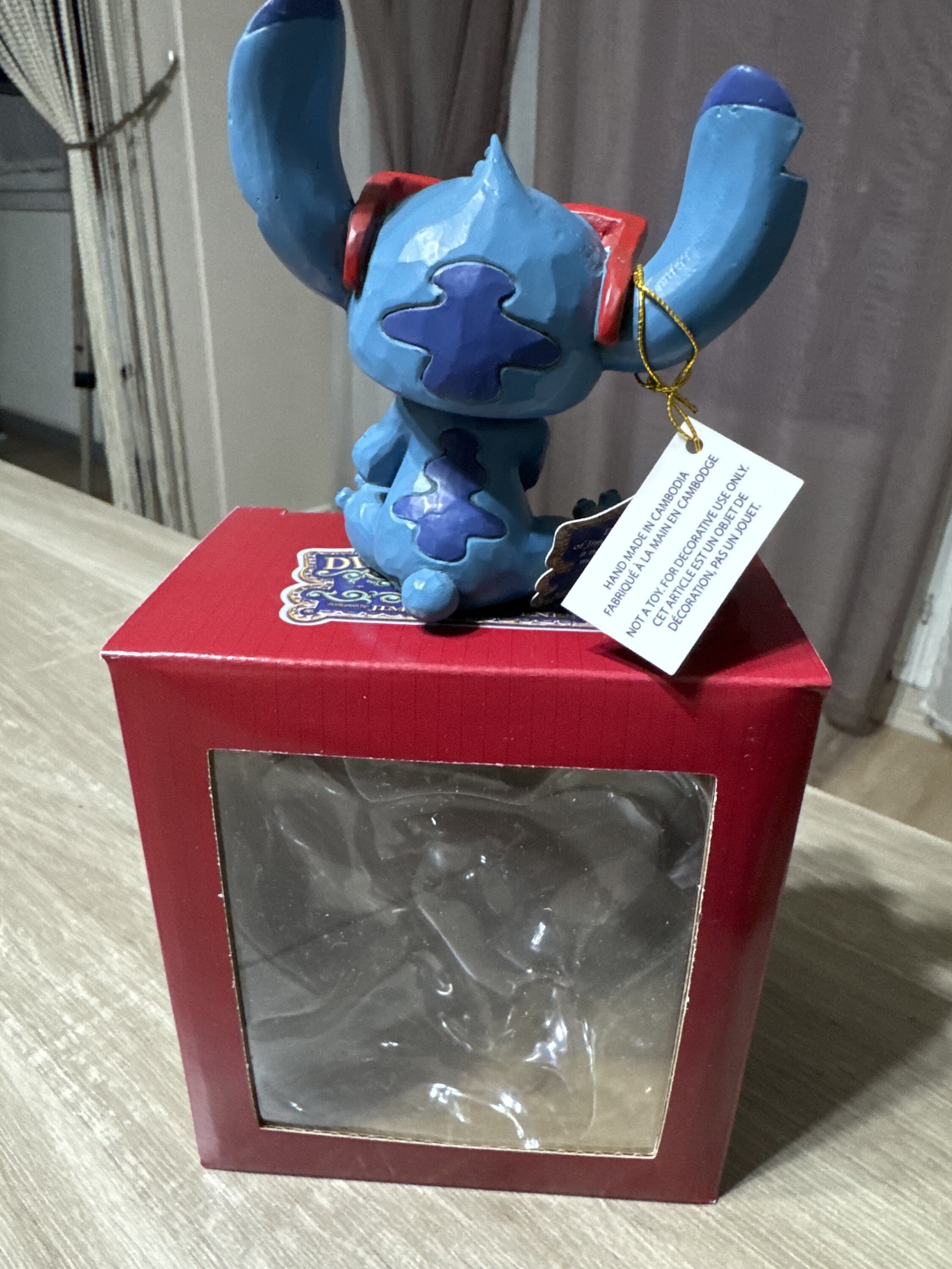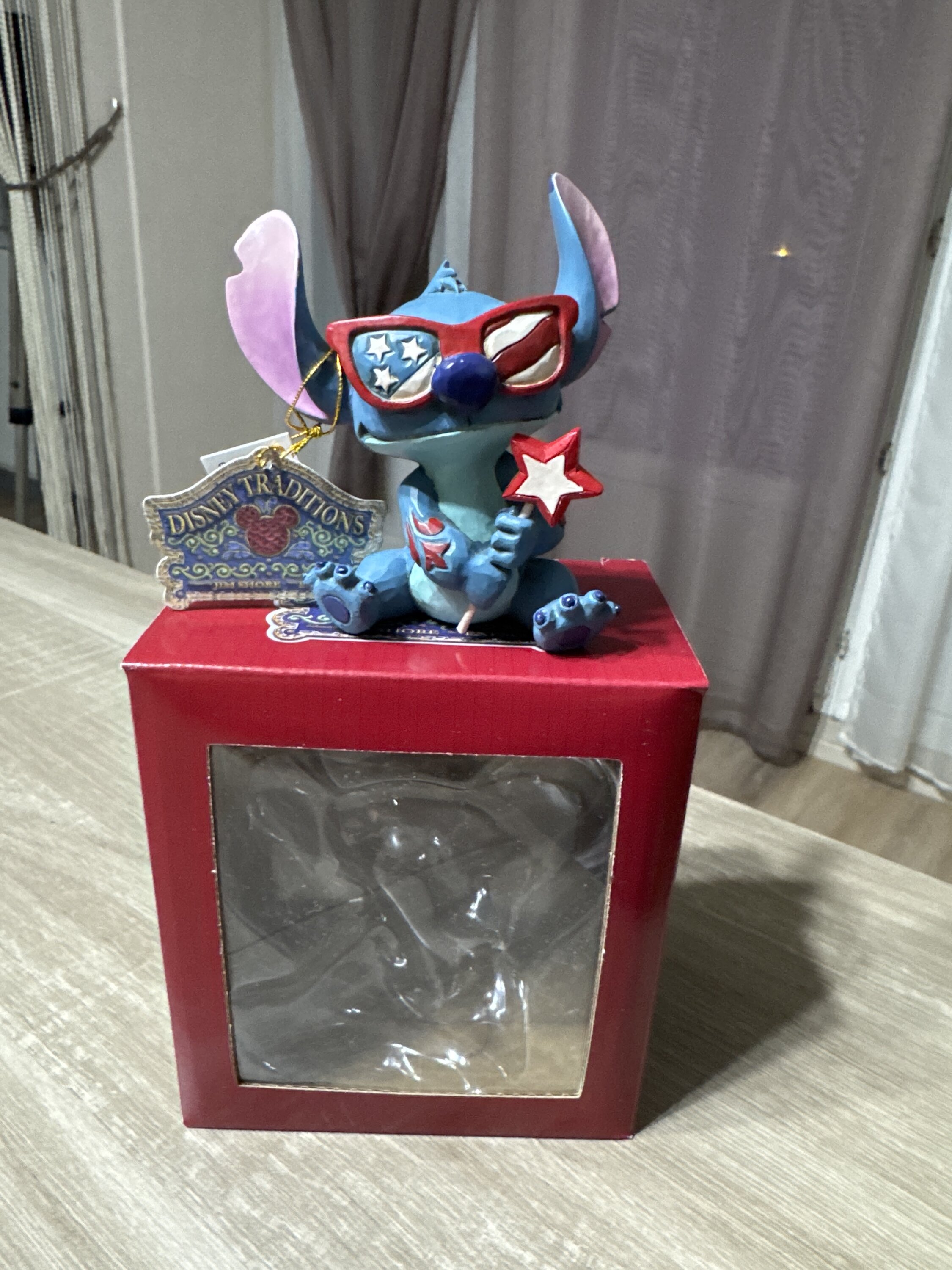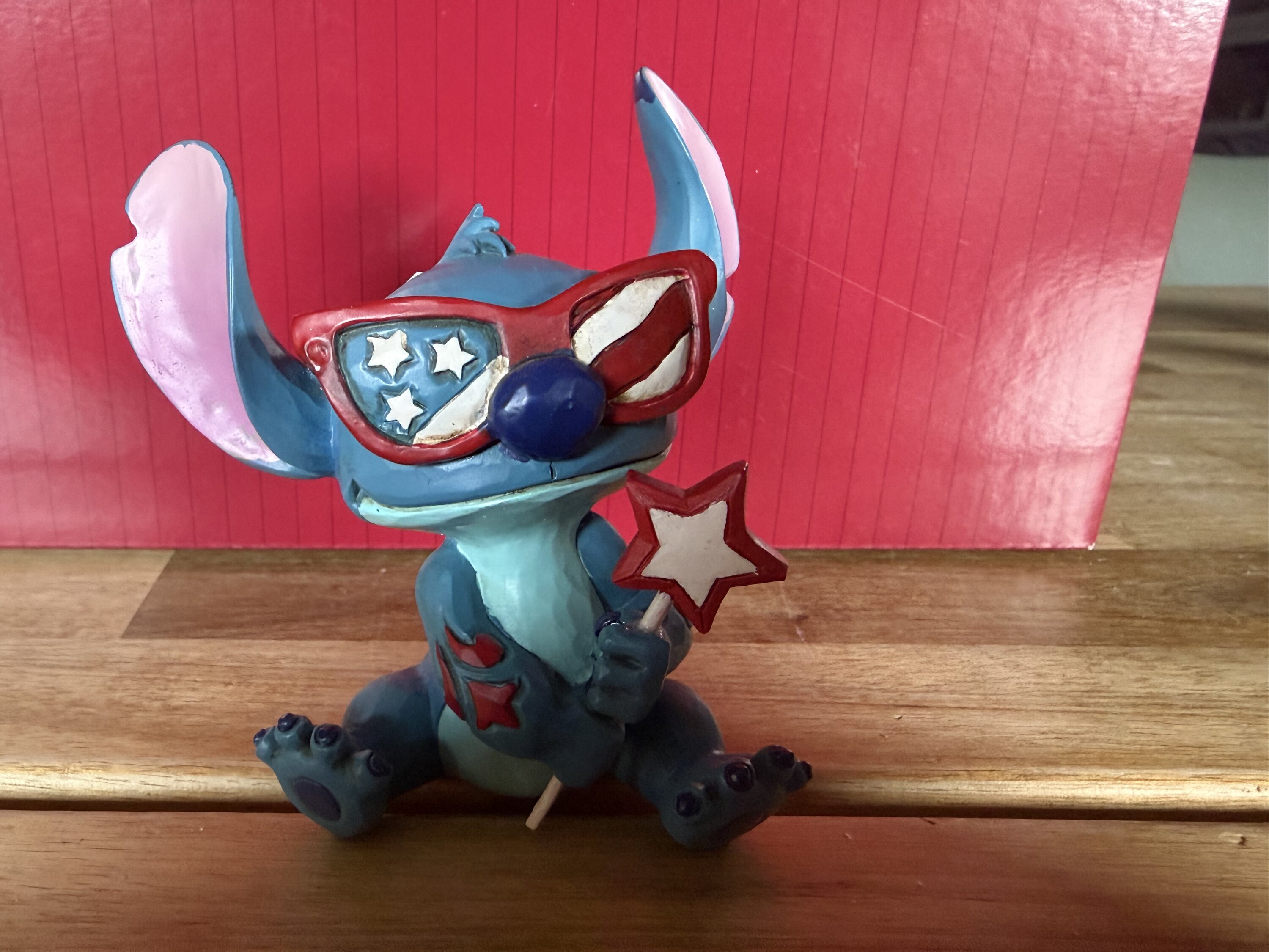 Stitch draagt een zonnebril met sterren en houdt trots een patriottisch geschenk vast in dit feestelijke Jim Shore -stuk. Zijn lichaam is versierd met rode rozenkrans, een eerbetoon aan Stitch's trots om tot de 50e staat van Amerika te behoren.