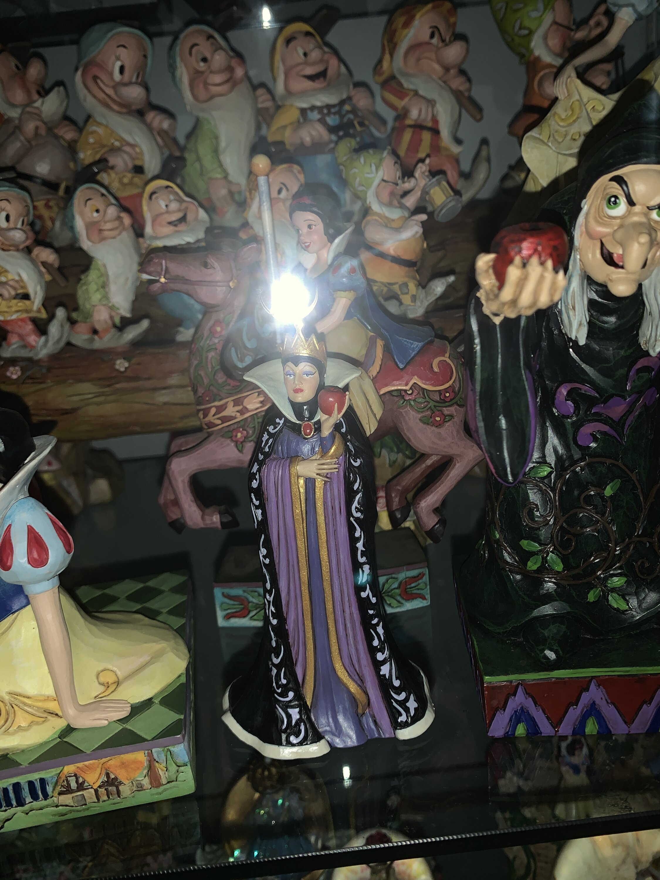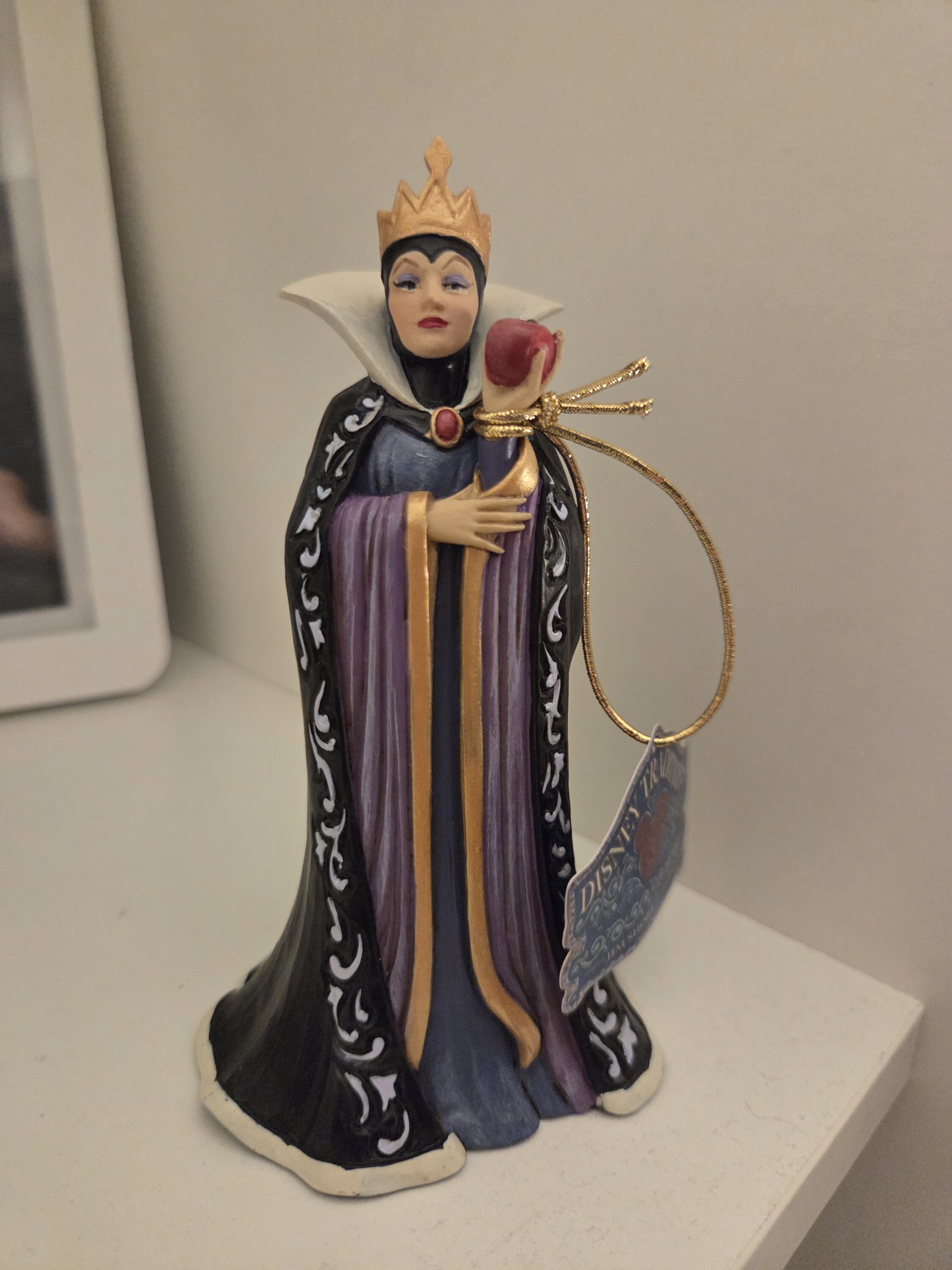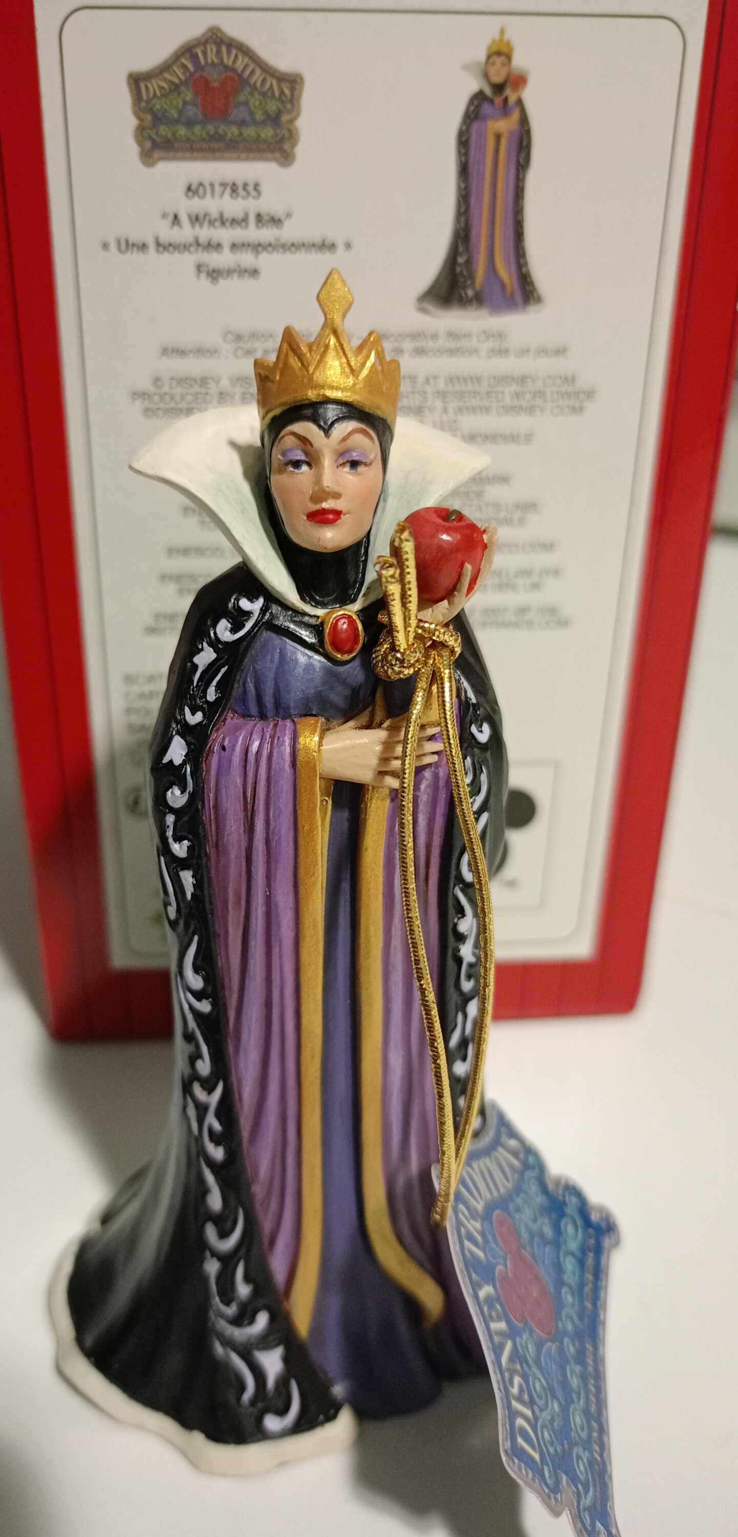 De koningin, Grimhilde, draagt een opvallende zwart-paarse jurk versierd met Jim Shore's kenmerkende rosemaling- en quiltpatronen. Met een giftige appel in haar hand, bedoeld voor Sneeuwwitje, voedt haar jaloerse hart haar duistere bedoelingen terwijl ze haar volgende zet bedenkt.