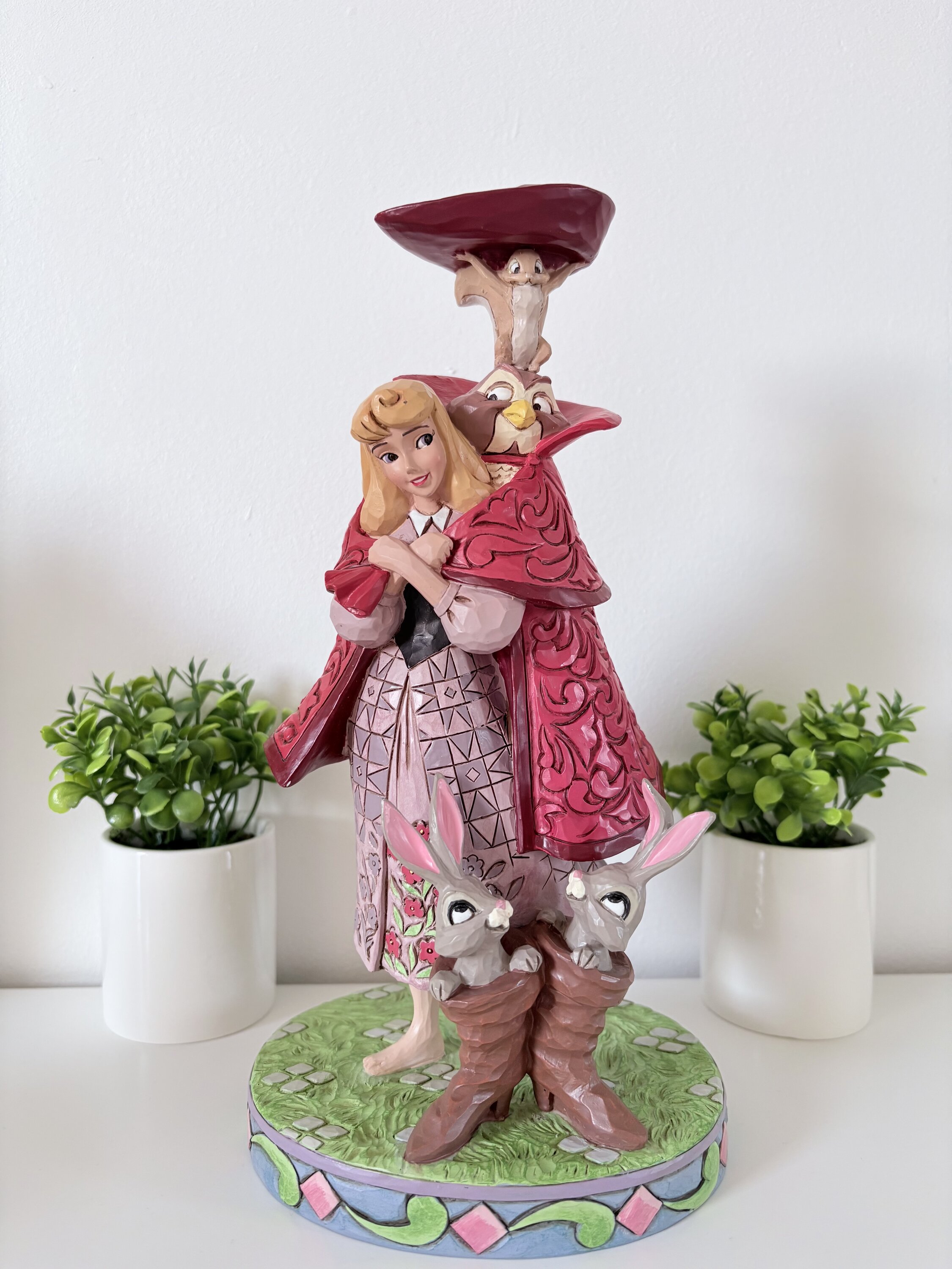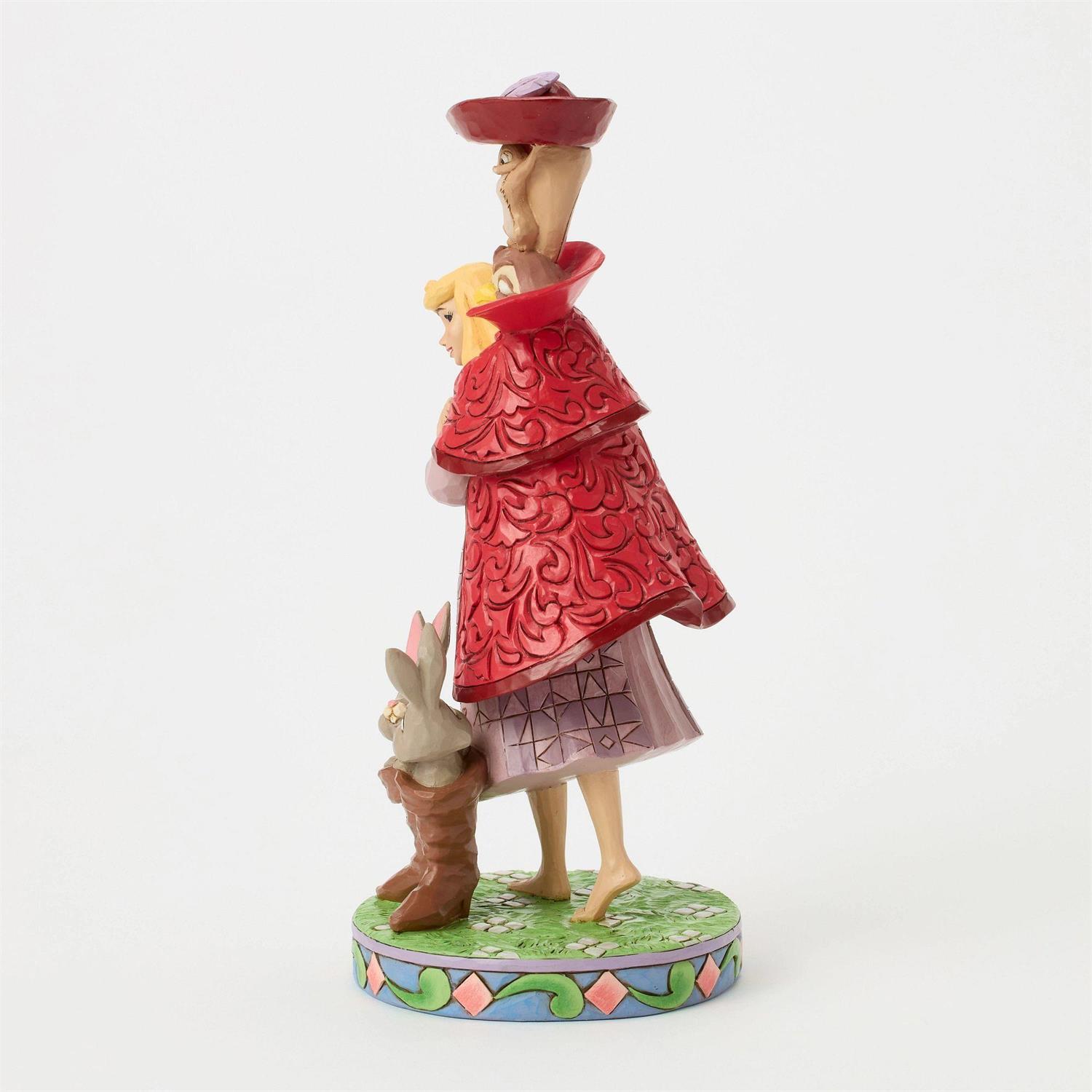 Aurora's bosvrienden transformeren in een man in een rode jas terwijl ze op zoek gaat naar haar prins. Een uil, eekhoorn en konijntjes in laarzen voegen charme toe aan dit betoverende Jim Shore -ontwerp en brengen de memorabele filmscène betoverend tot leven.