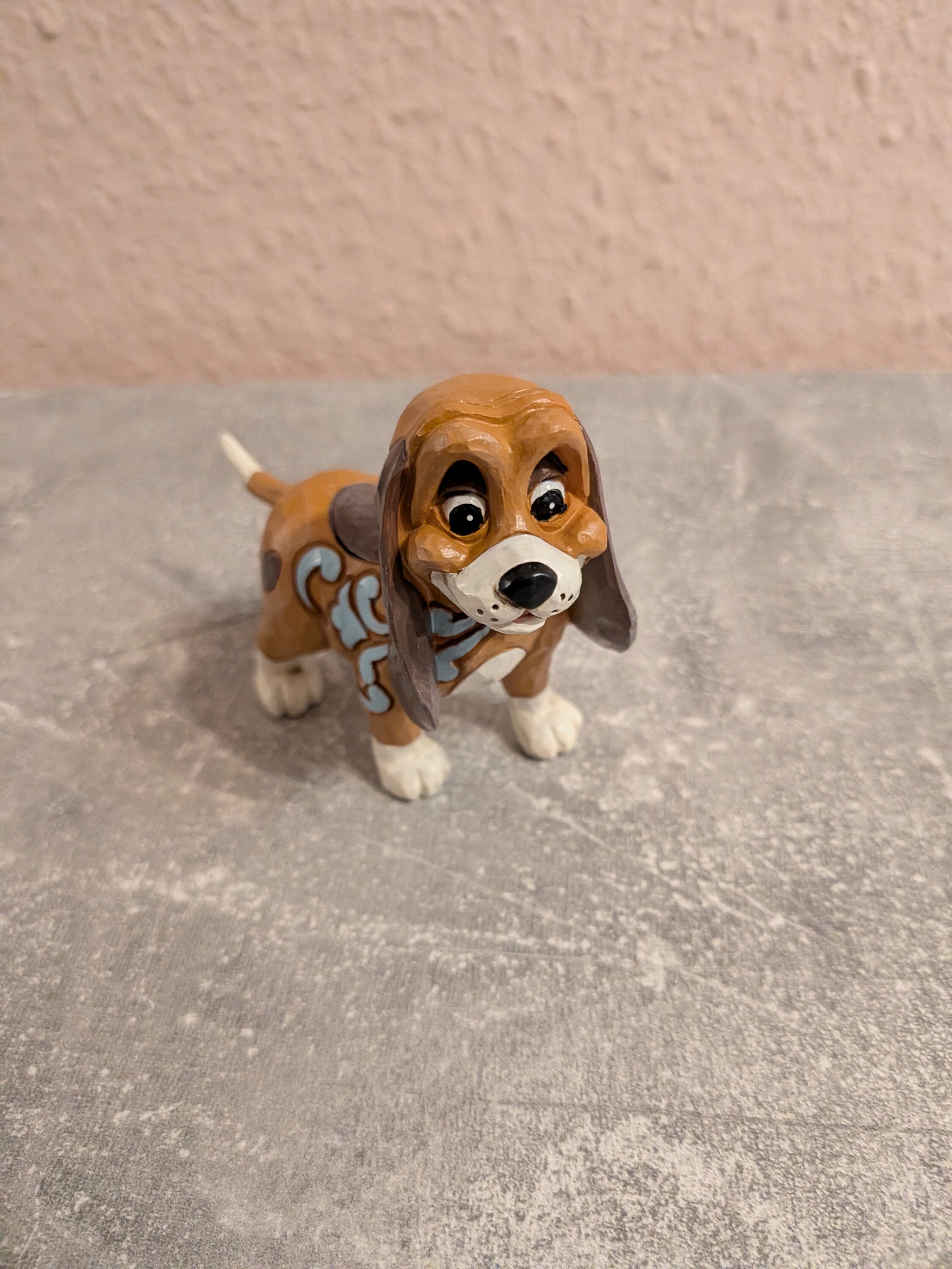 Deze schattige miniatuur van Jim Shore toont Copper, de hond, met ingewikkelde rosemaling-patronen en een oprechte uitdrukking. Hij is waarschijnlijk op zoek naar zijn vriend, de Vos, klaar voor hun volgende avontuur samen in het bos.