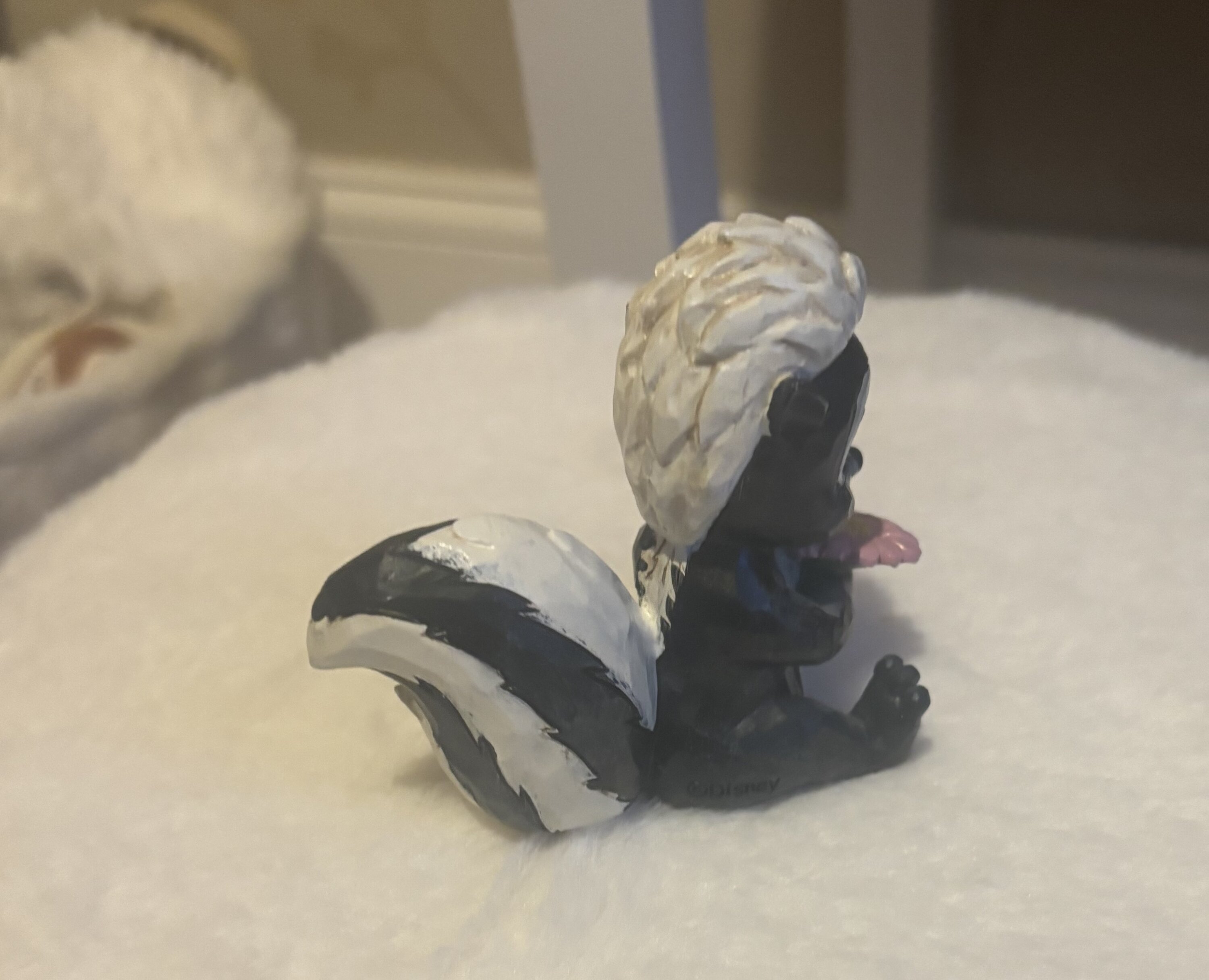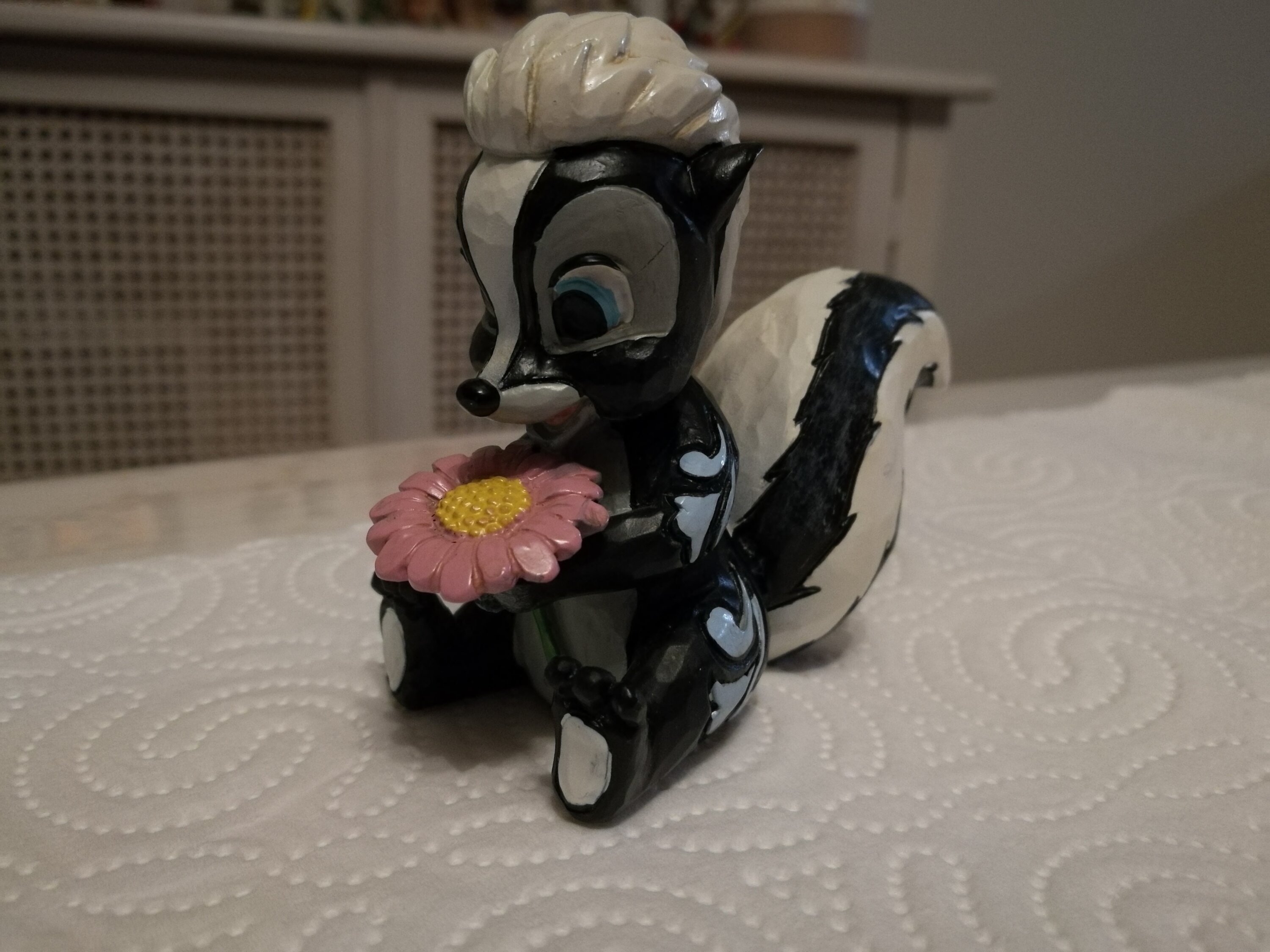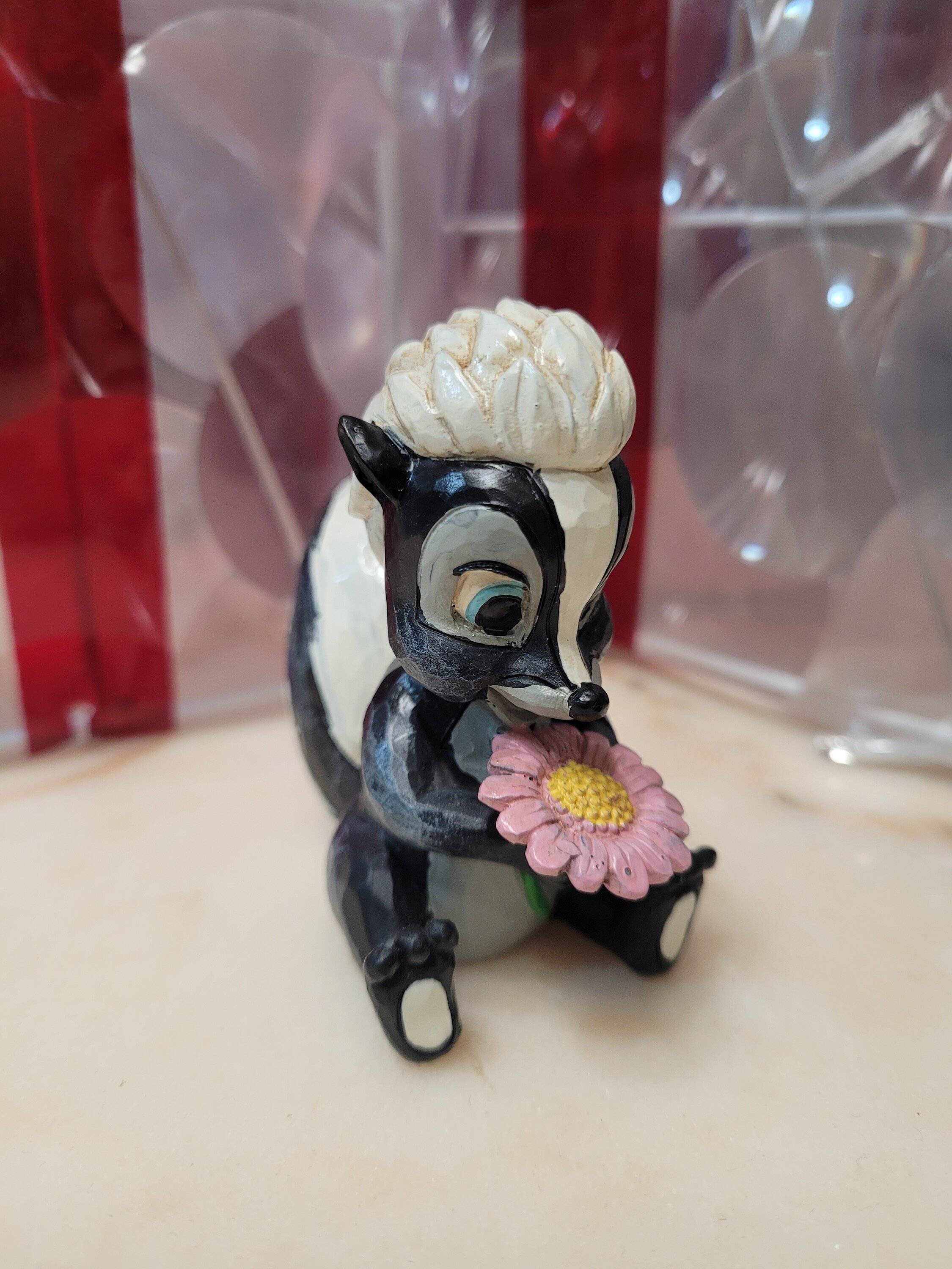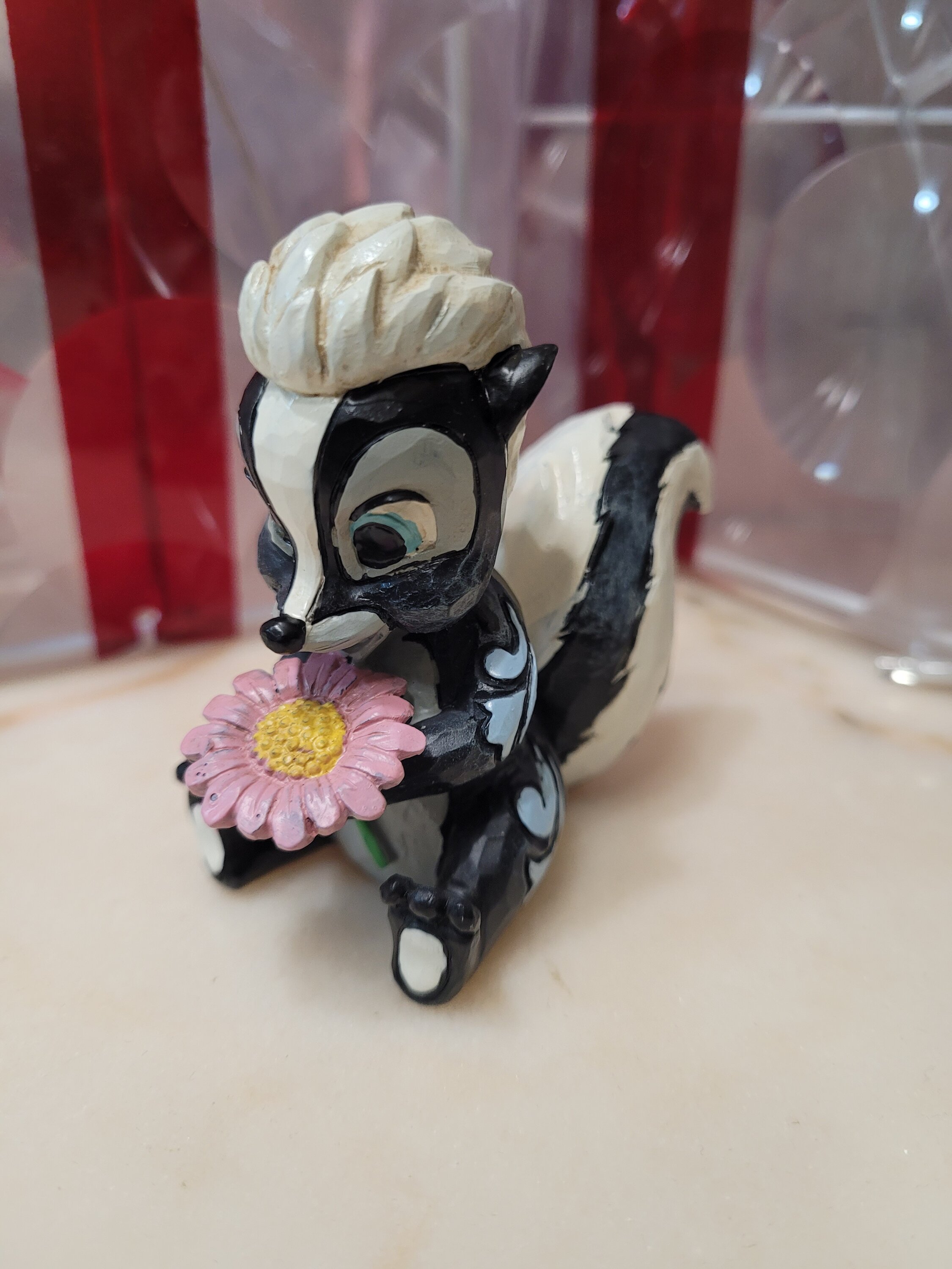 Deze schattige miniatuur van Jim Shore toont Flower, het stinkdier uit Bambi, versierd met opvallend rozenhout en een handvol verse bloemen. Met een stralende glimlach en kinderlijke liefde straalt ze zoetheid en charme uit.