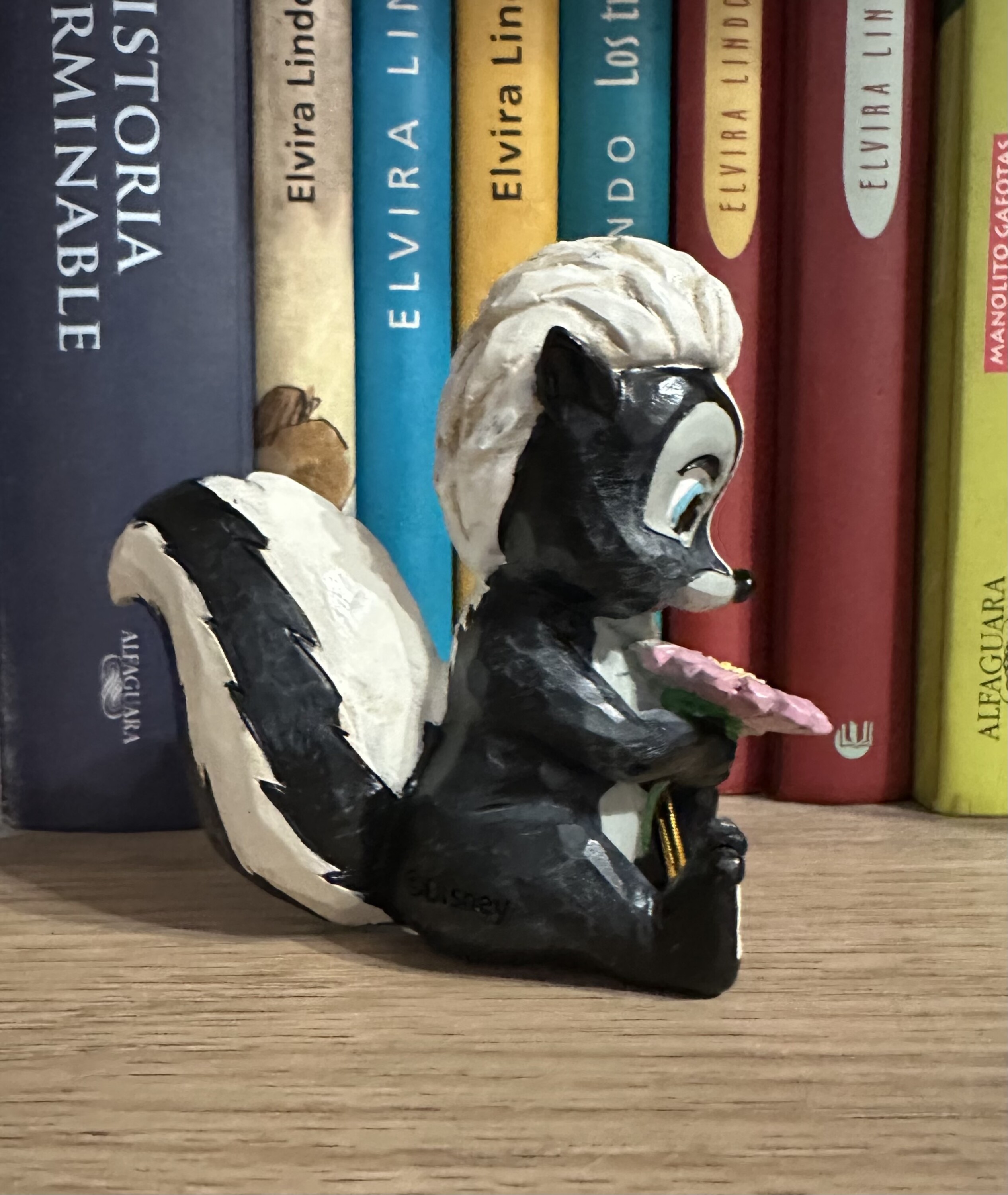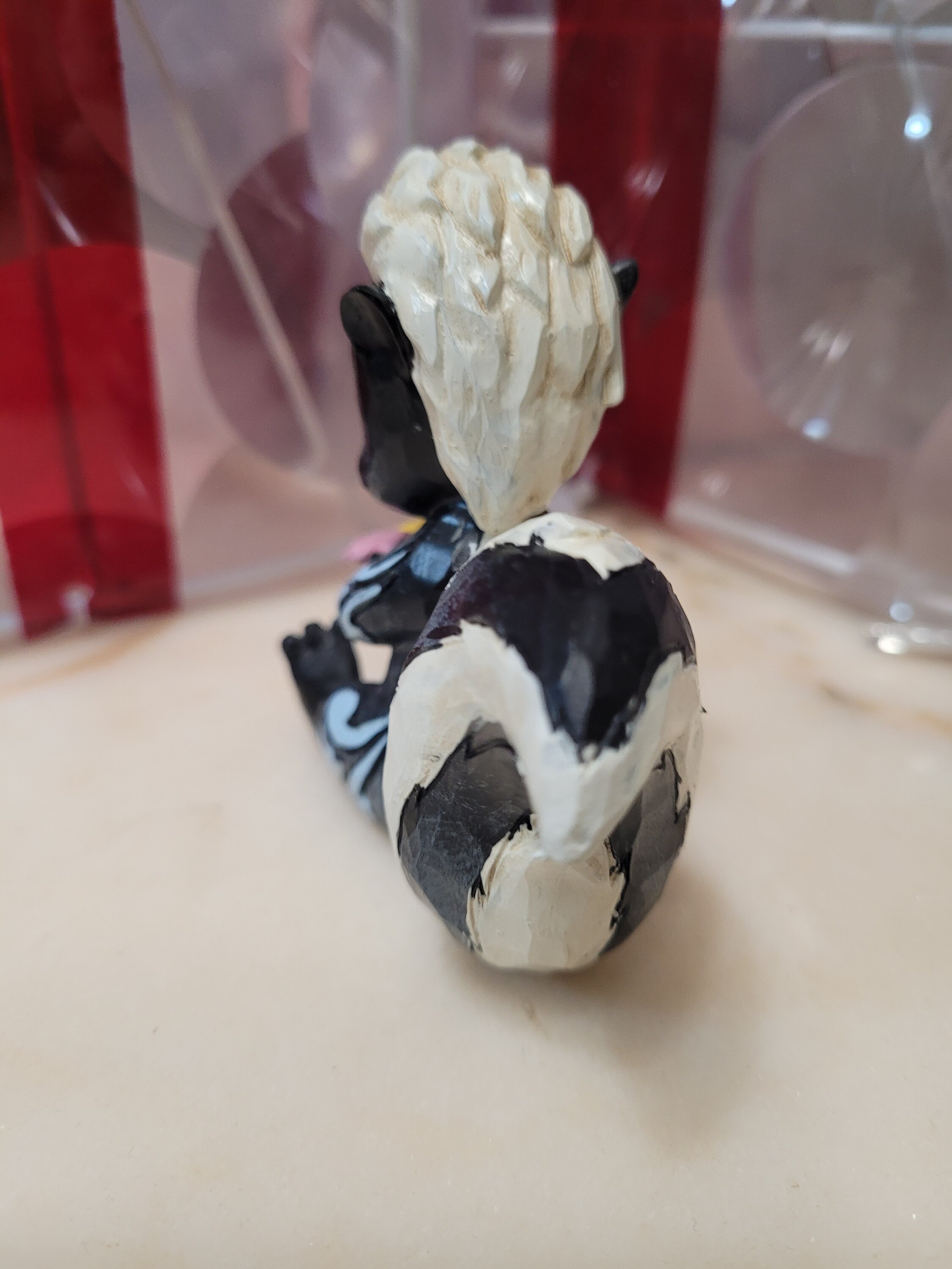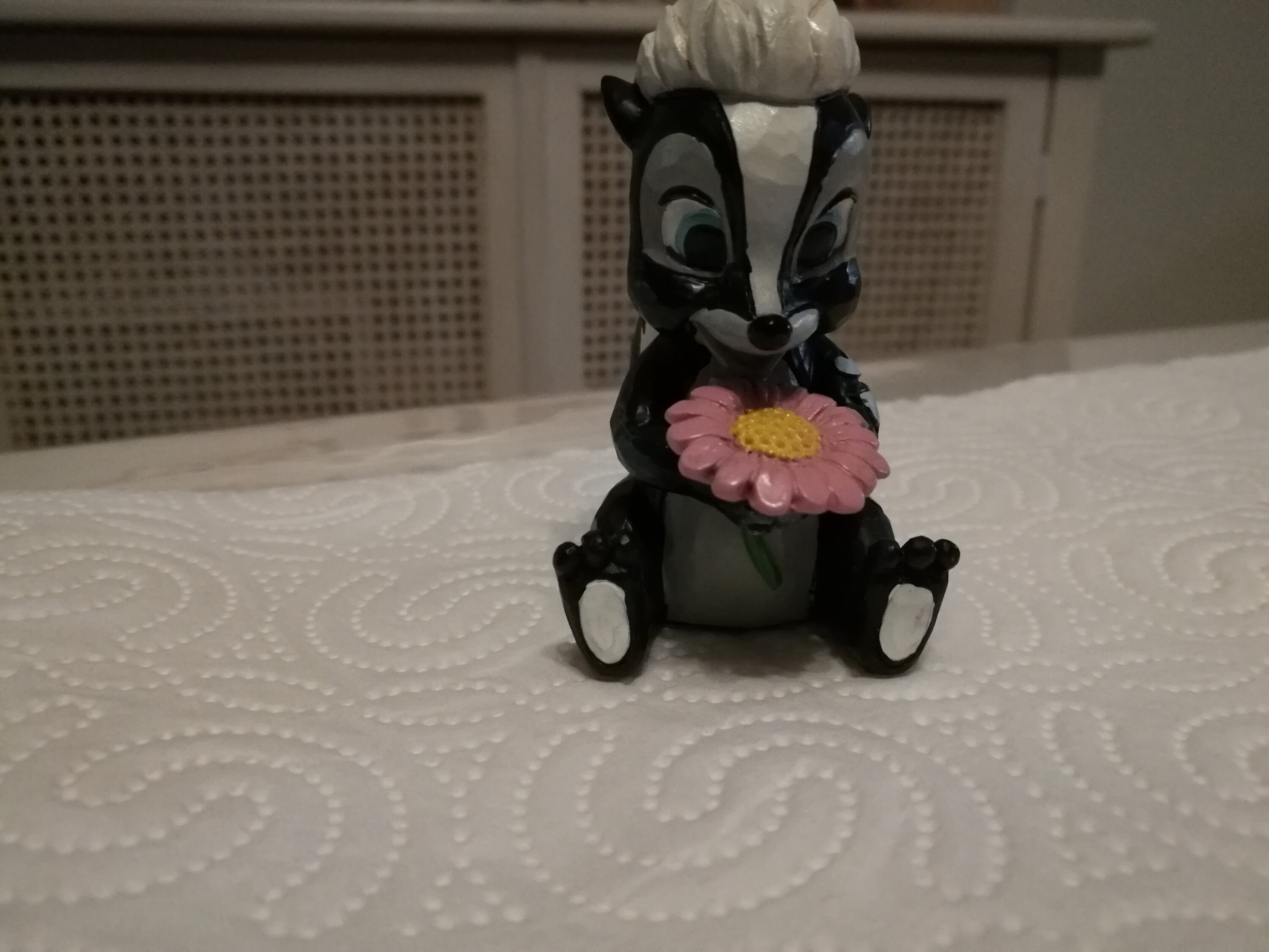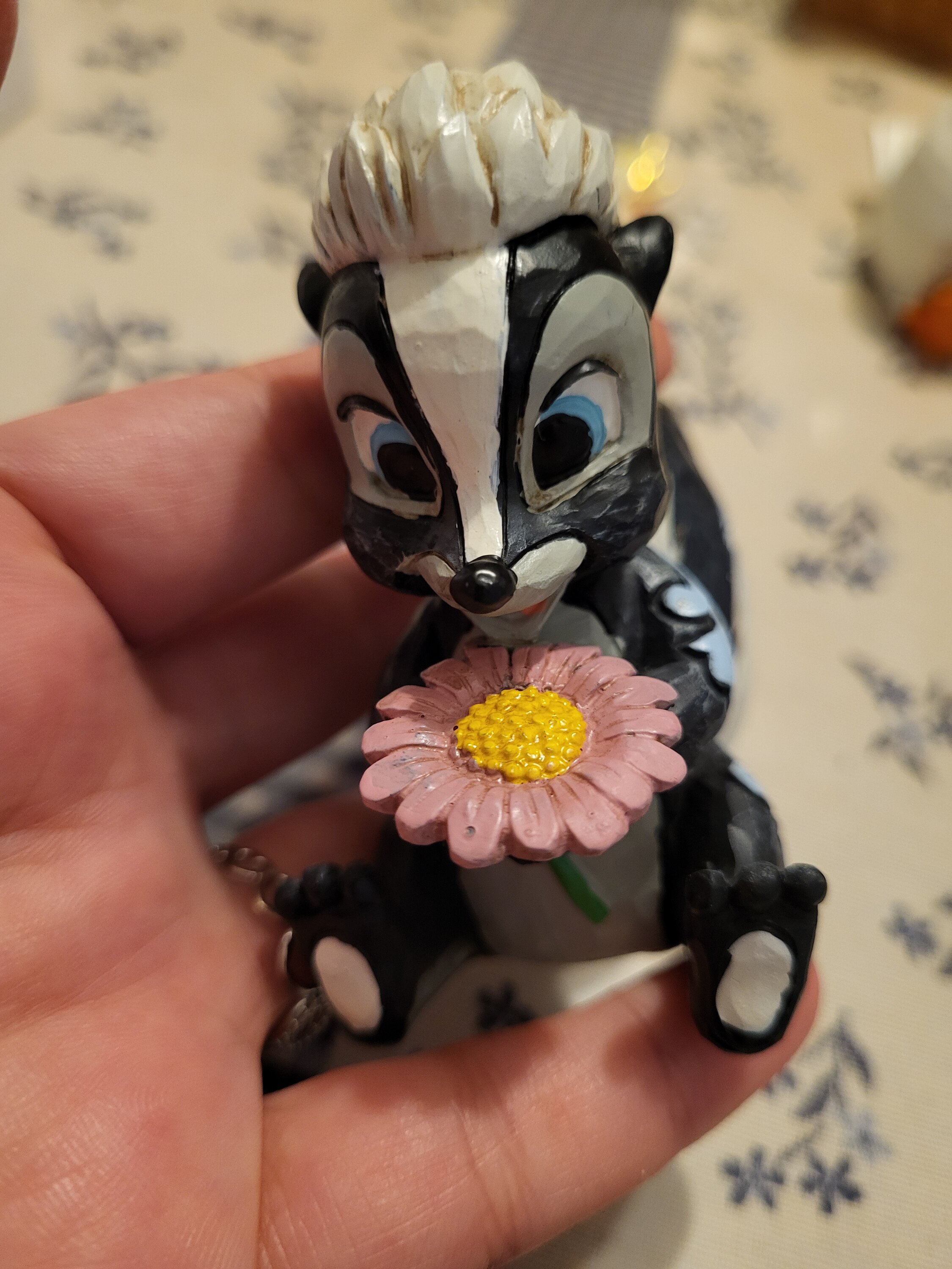 Deze schattige miniatuur van Jim Shore toont Flower, het stinkdier uit Bambi, versierd met opvallend rozenhout en een handvol verse bloemen. Met een stralende glimlach en kinderlijke liefde straalt ze zoetheid en charme uit.