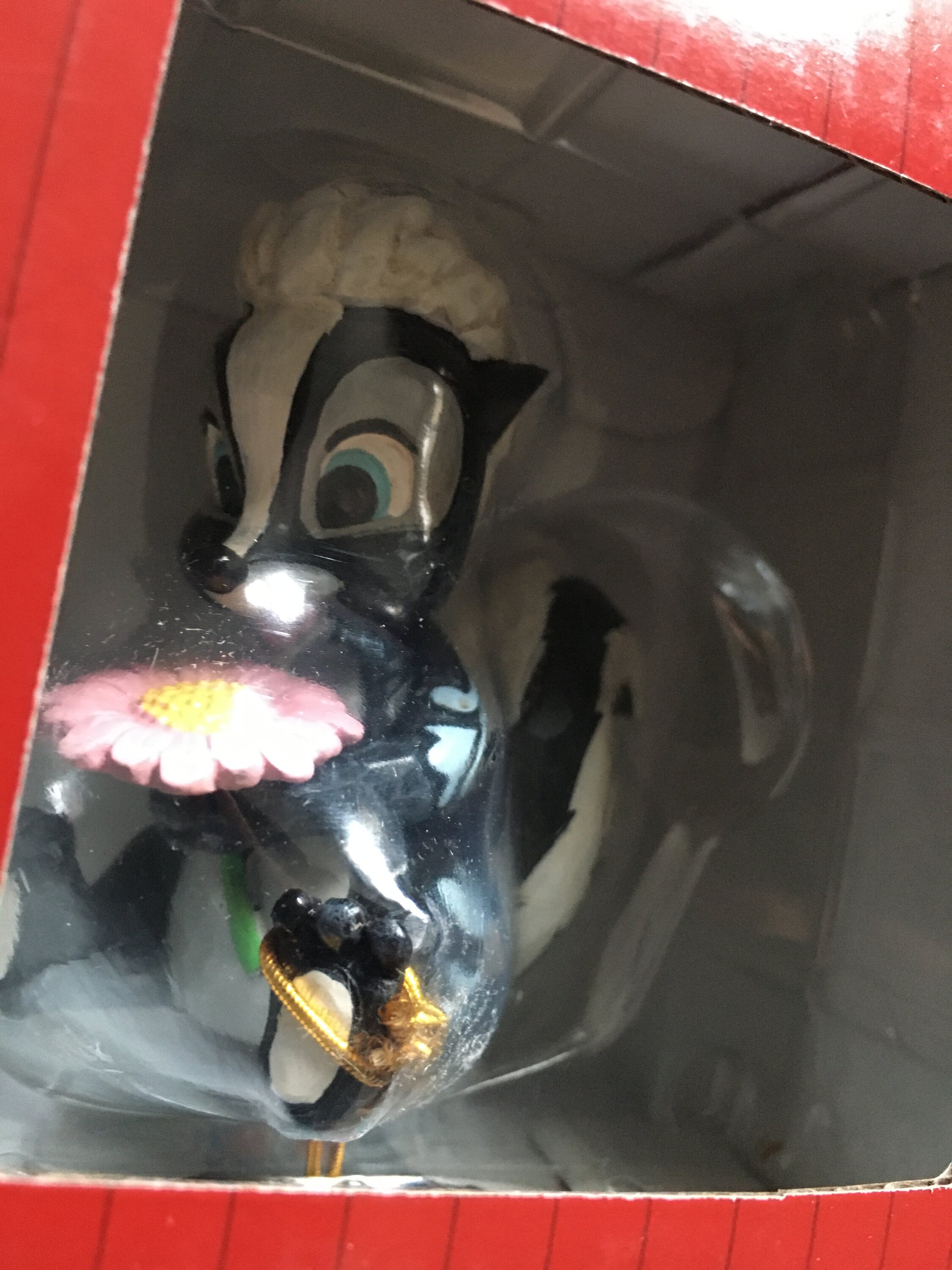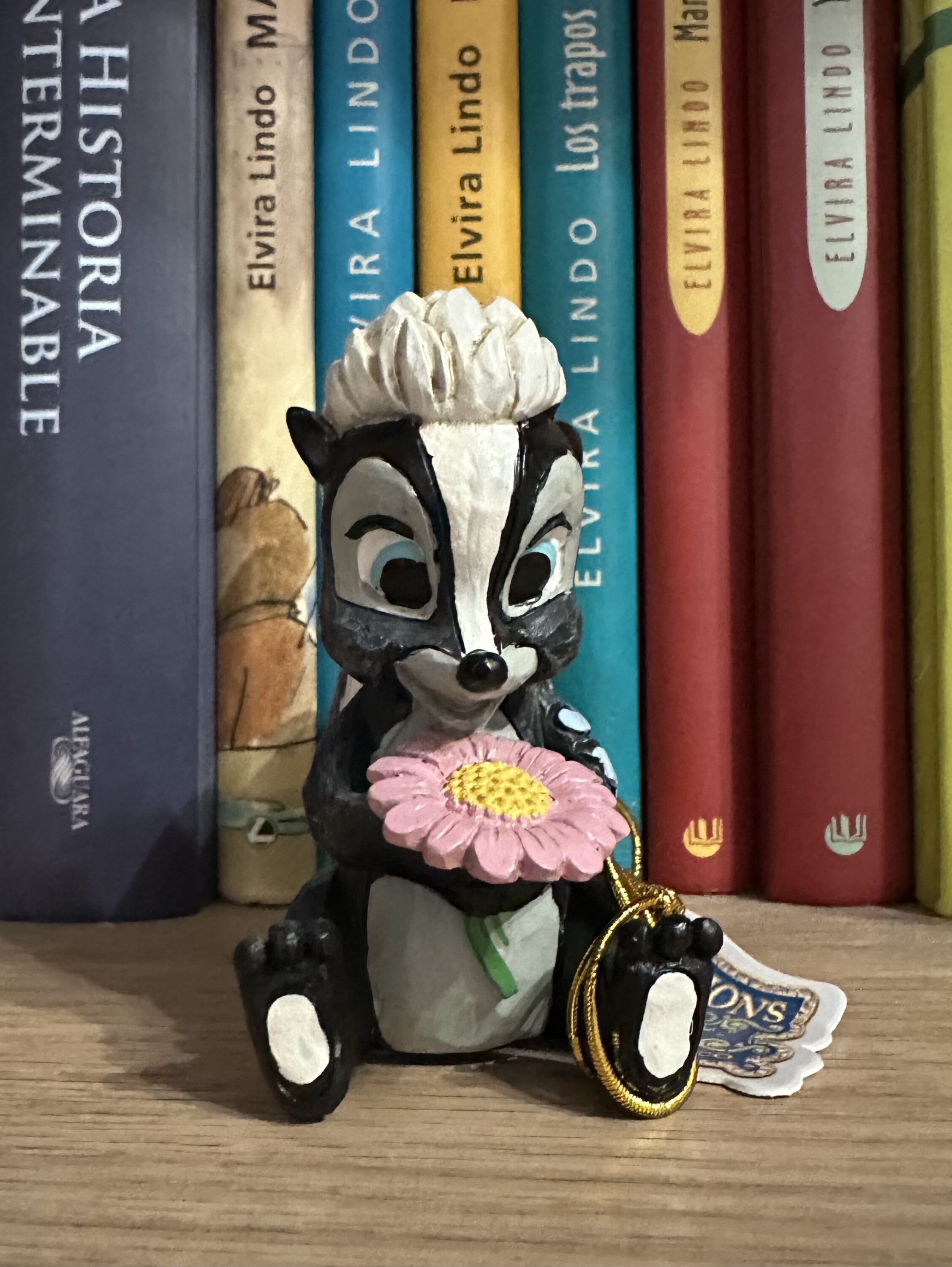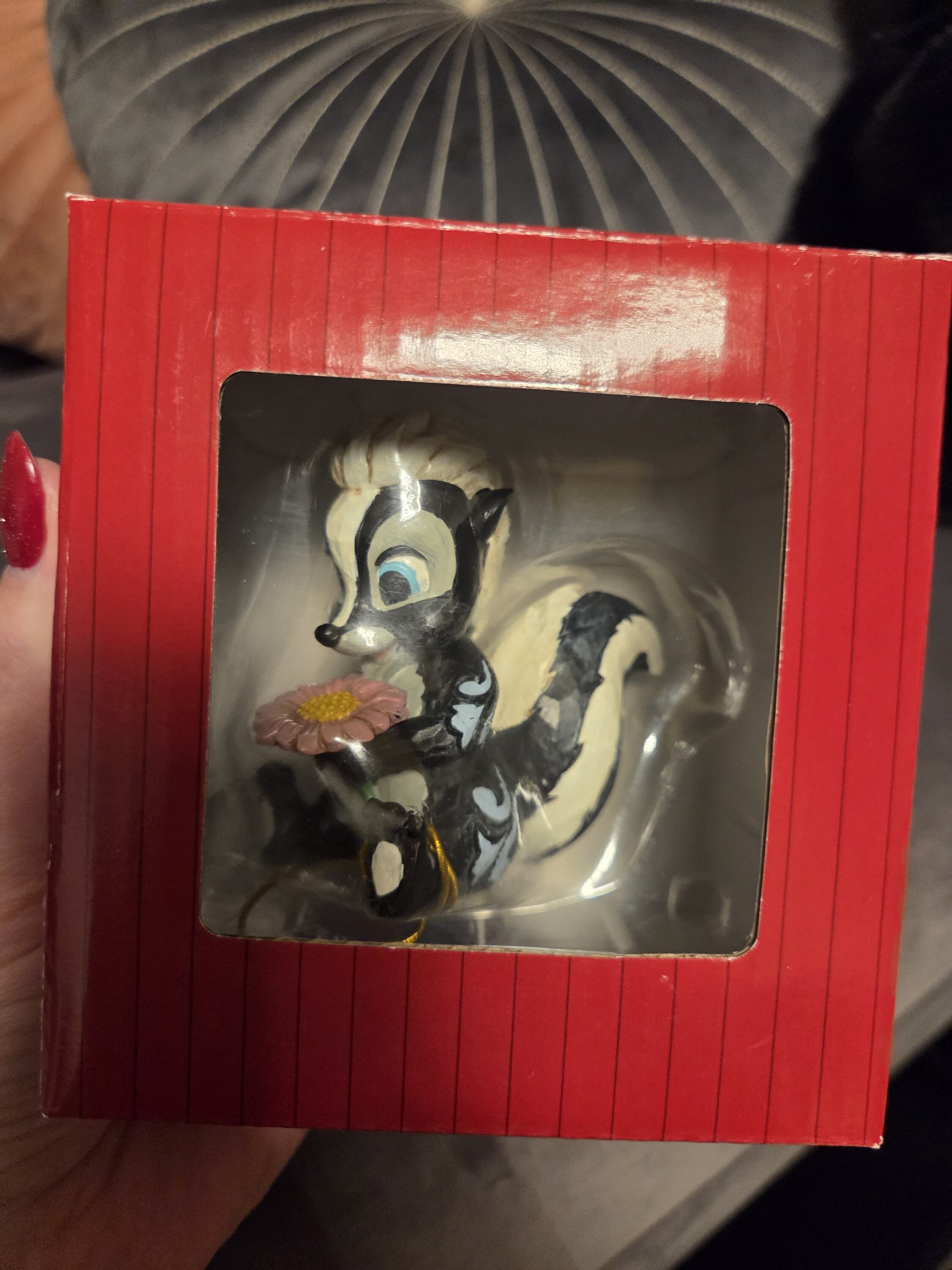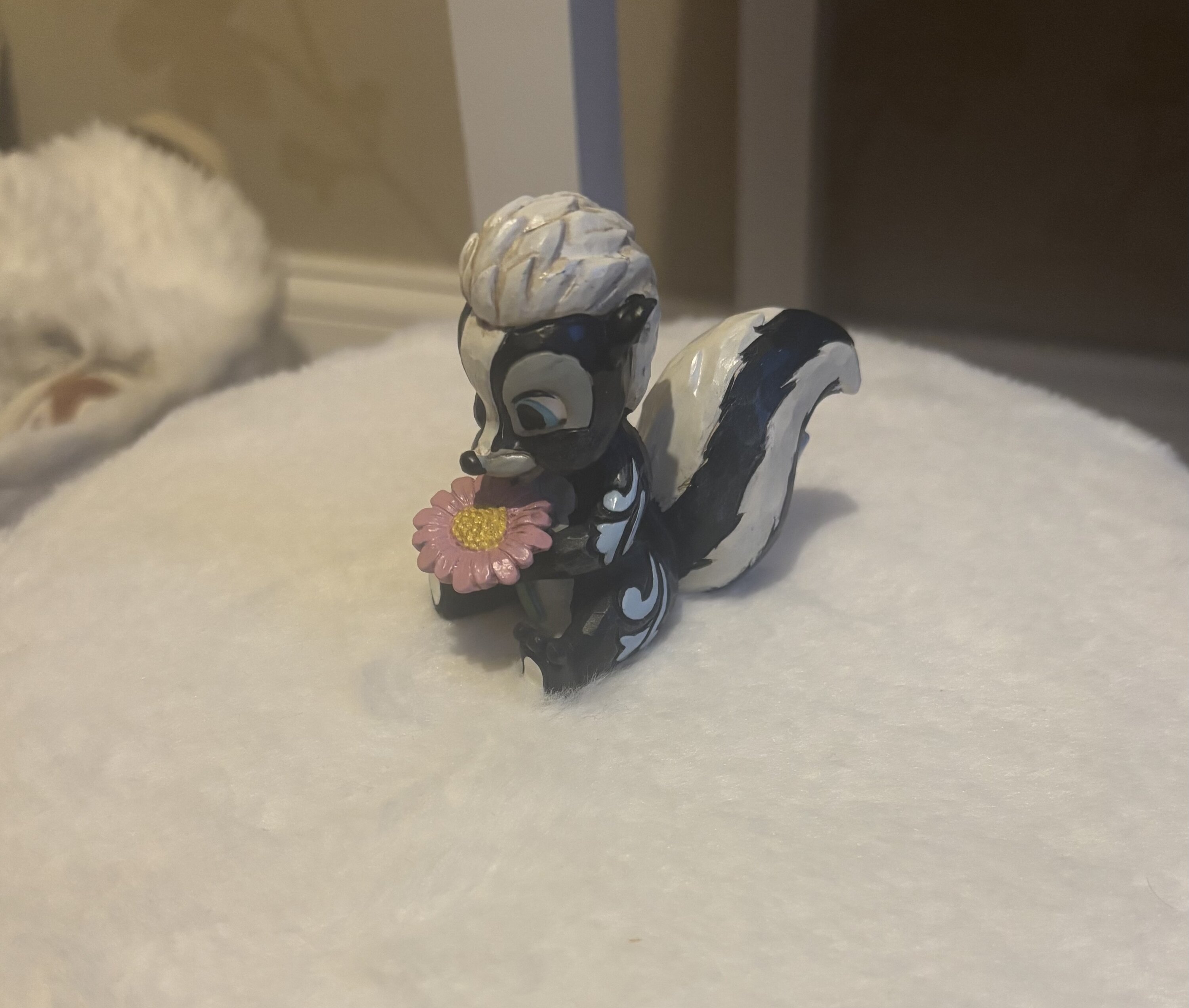Deze schattige miniatuur van Jim Shore toont Flower, het stinkdier uit Bambi, versierd met opvallend rozenhout en een handvol verse bloemen. Met een stralende glimlach en kinderlijke liefde straalt ze zoetheid en charme uit.