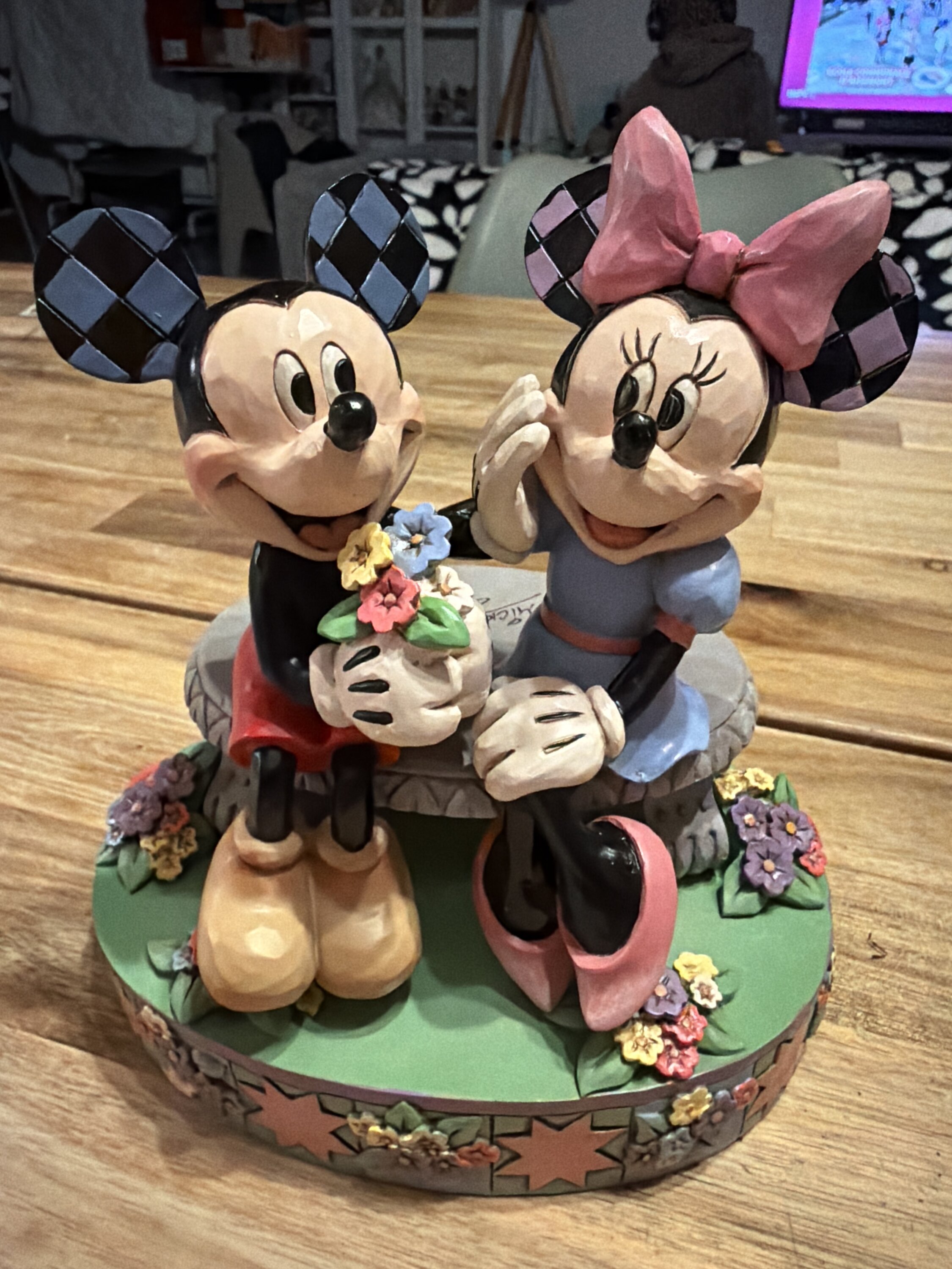 Mickey en Minnie delen een zoet moment op een parkbankje in deze romantische scène met Jim Shore . Omringd door kleurrijke bloemen en Jims rozenkrans- en quiltpatronen, geeft Mickey Minnie een vers boeket terwijl ze bloost.