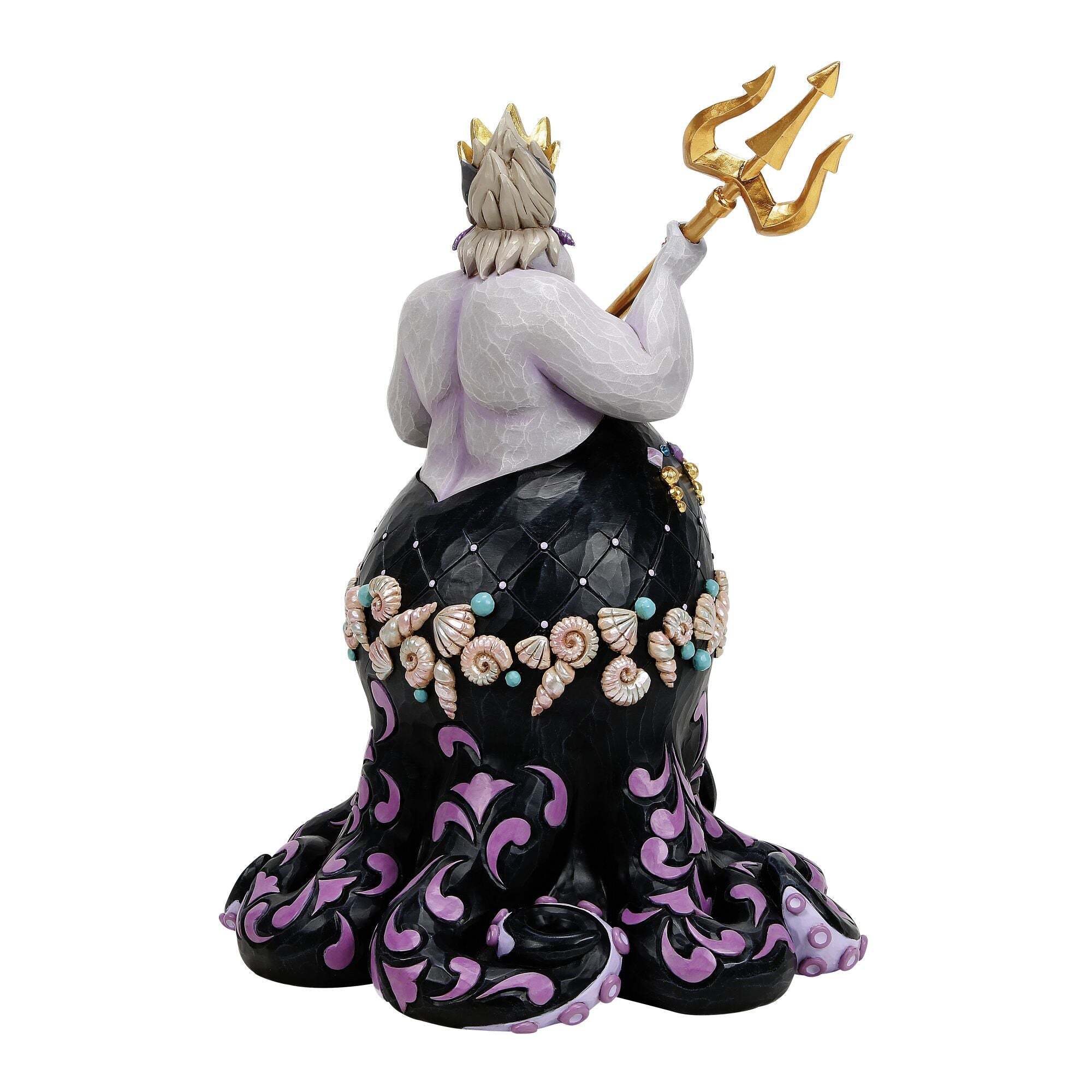 Krachtig en theatraal, Ursula is prachtig opnieuw vormgegeven in dit deluxe Disney Traditions -beeld. De Zeeheks, met haar gouden drietand in de hand, staat met een imposante uitstraling, versierd met ingewikkelde patronen, rijke texturen en elegante decoratieve details geïnspireerd op volkskunst. Een gedurfd en dramatisch pronkstuk dat de grootsheid van de schurk perfect weergeeft.
