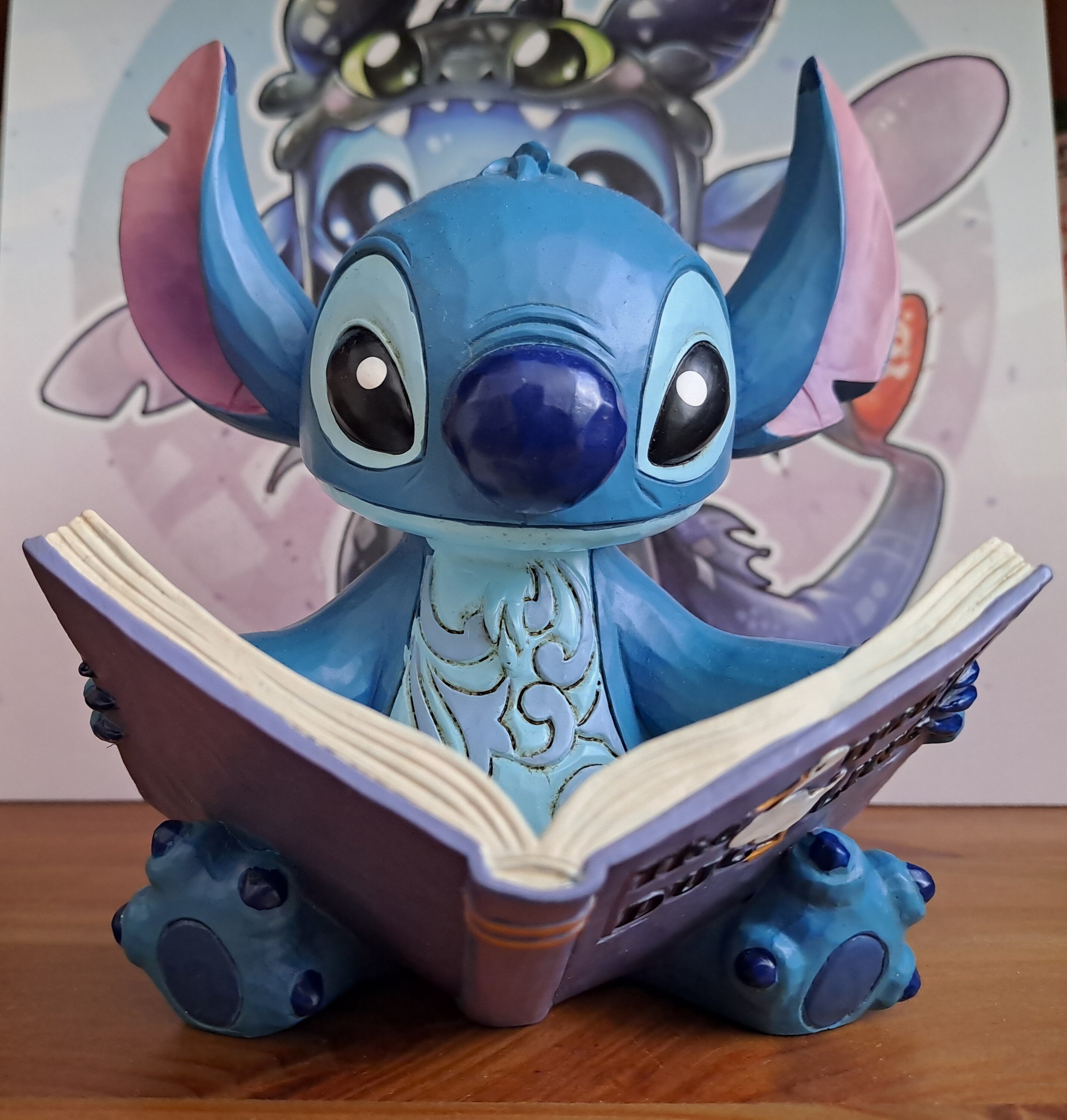 Prachtig beeldje van Stitch die het Ugly Duckling-boek leest. Heel schattig