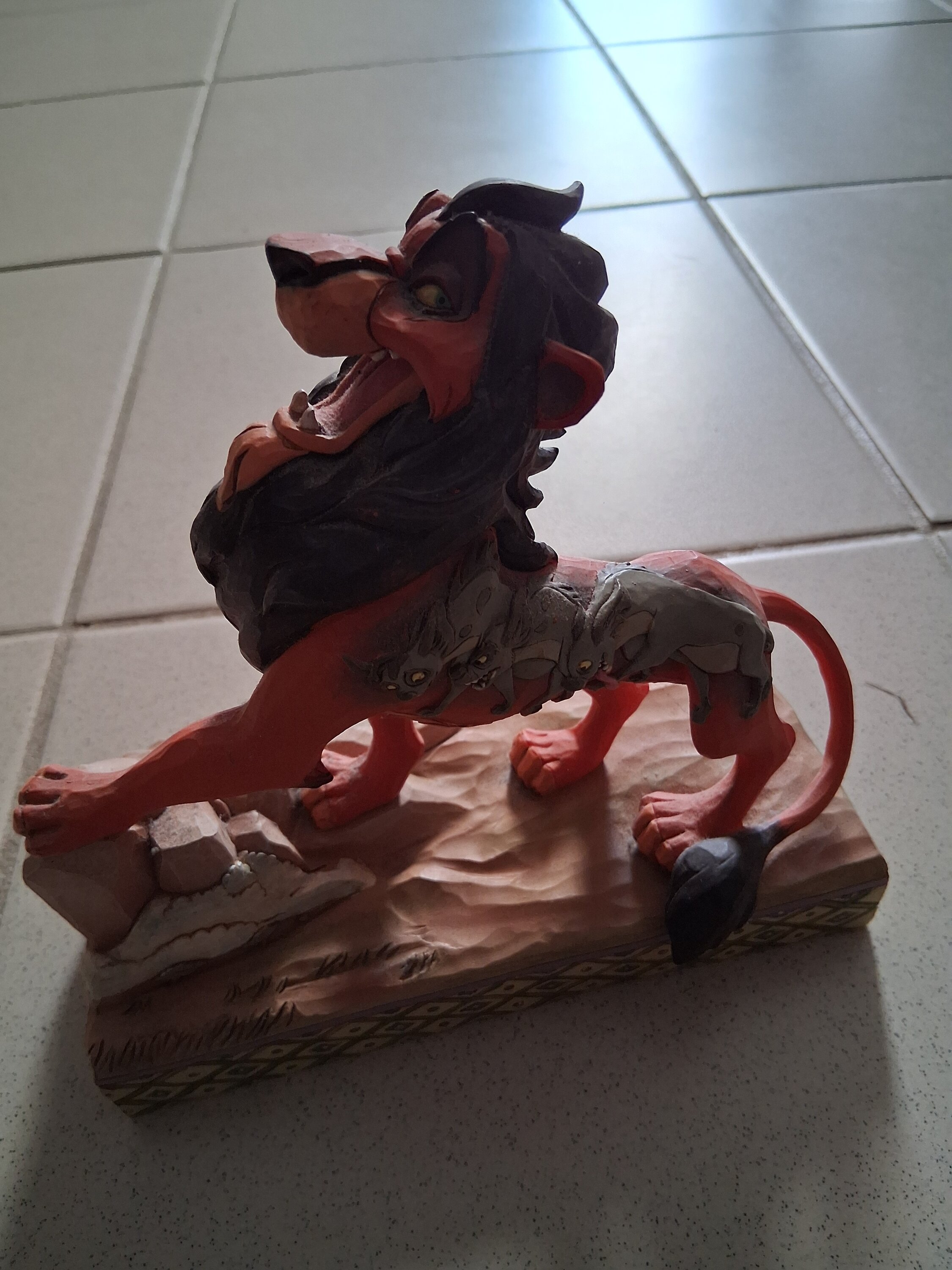 Un pezzo superbo, del tutto riuscito. Il cattivo de "Il Re Leone" si presenta imponente ed è raffigurato nei minimi dettagli. Il tocco di classe dell' artista sta nell' aver raffigurato lungo la schiena i suoi tirapiedi, ovvero le tre iene. Notevoli anche le dimensioni della statuetta.