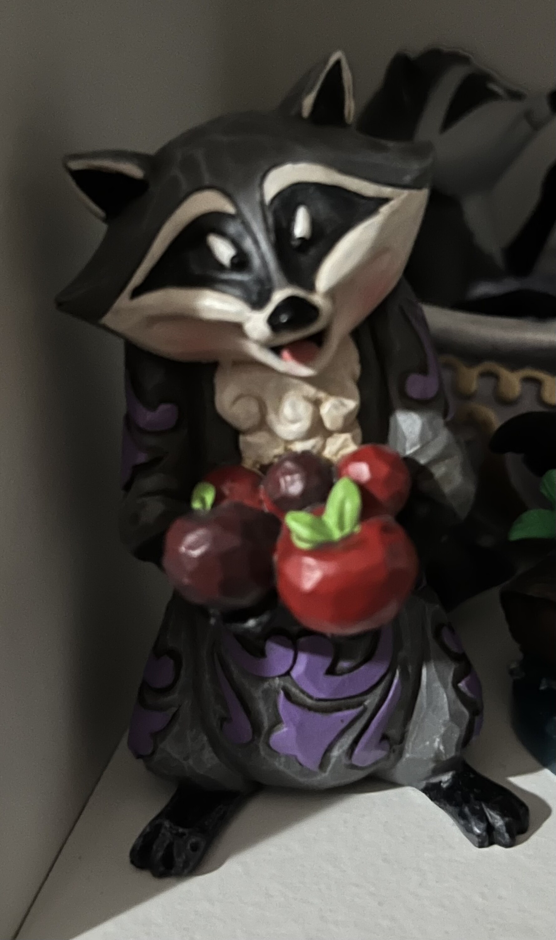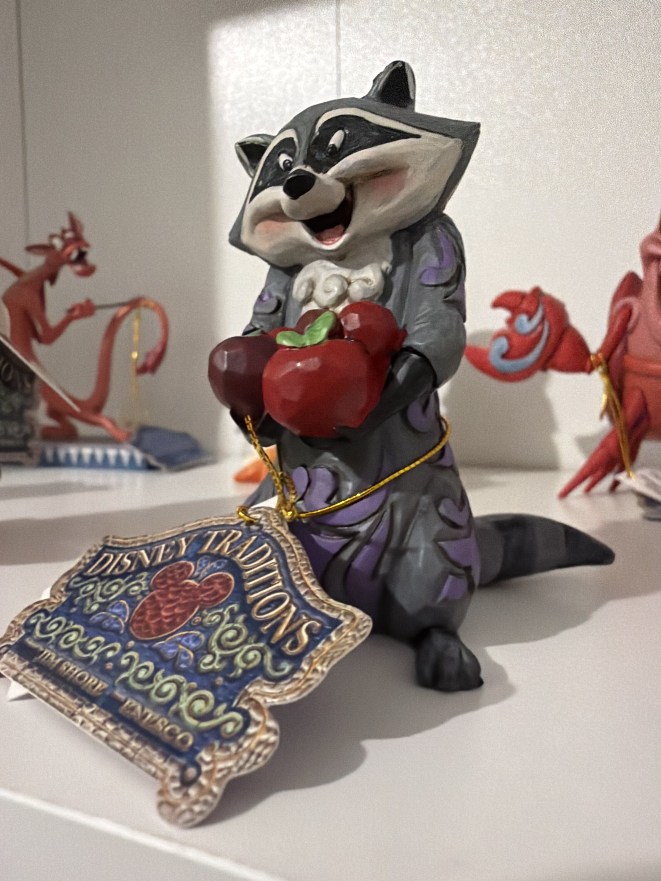 Meeko, de geliefde wasbeer uit Disney's animatiefilm Pocahontas 1995, houdt van eten, vooral van John Smith-koekjes. In deze miniatuur van Jim Shore heeft de vindingrijke aaseter appels in overvloed gevonden.