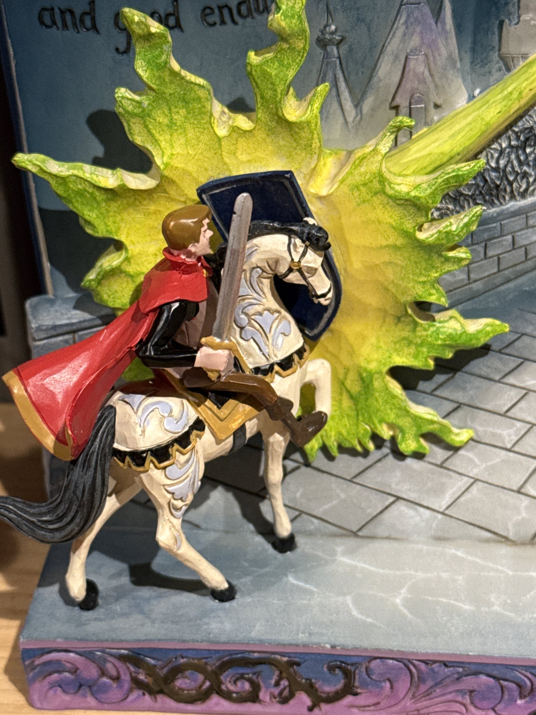 Fin da bambino (e ormai sono un vecchio) mi è sempre rimasto impresso il combattimento del principe Filippo contro Malefica, perché, ancor prima della maggior parte degli eroi e supereroi vari, già negli anni 50 e con solo spada e scudo egli si apprestava a combattere, senza alcun superpotere, contro nientepopodimeno che un drago. Sarebbero dovuti passare decenni ancora prima di rivedere uno scontro di fantasia epico di questa portata. Quindi questo soprammobile ha catturato subito la mia attenzione, quando l'ho visto. In realtà, purtroppo, il suddetto spezzone non è mai veramente stato riportato in nessuna maniera nel merchandise fino a questo momento, o almeno credo. È molto piccolo, circa 15 cm, ma non potevo non prenderlo ed è fatto piuttosto bene... non amo l'effetto legno ma in questo caso non mi dà fastidio e la scena ripropone bene l'epico scontro. Purtroppo mi è arrivato danneggiato ma non per colpa del venditore, in quanto, anche se ben imballato all'interno, è fragilissimo in alcuni punti come la spada... ma sono riuscito a ripararlo senza che si veda nulla, ma ho una certa esperienza in merito.