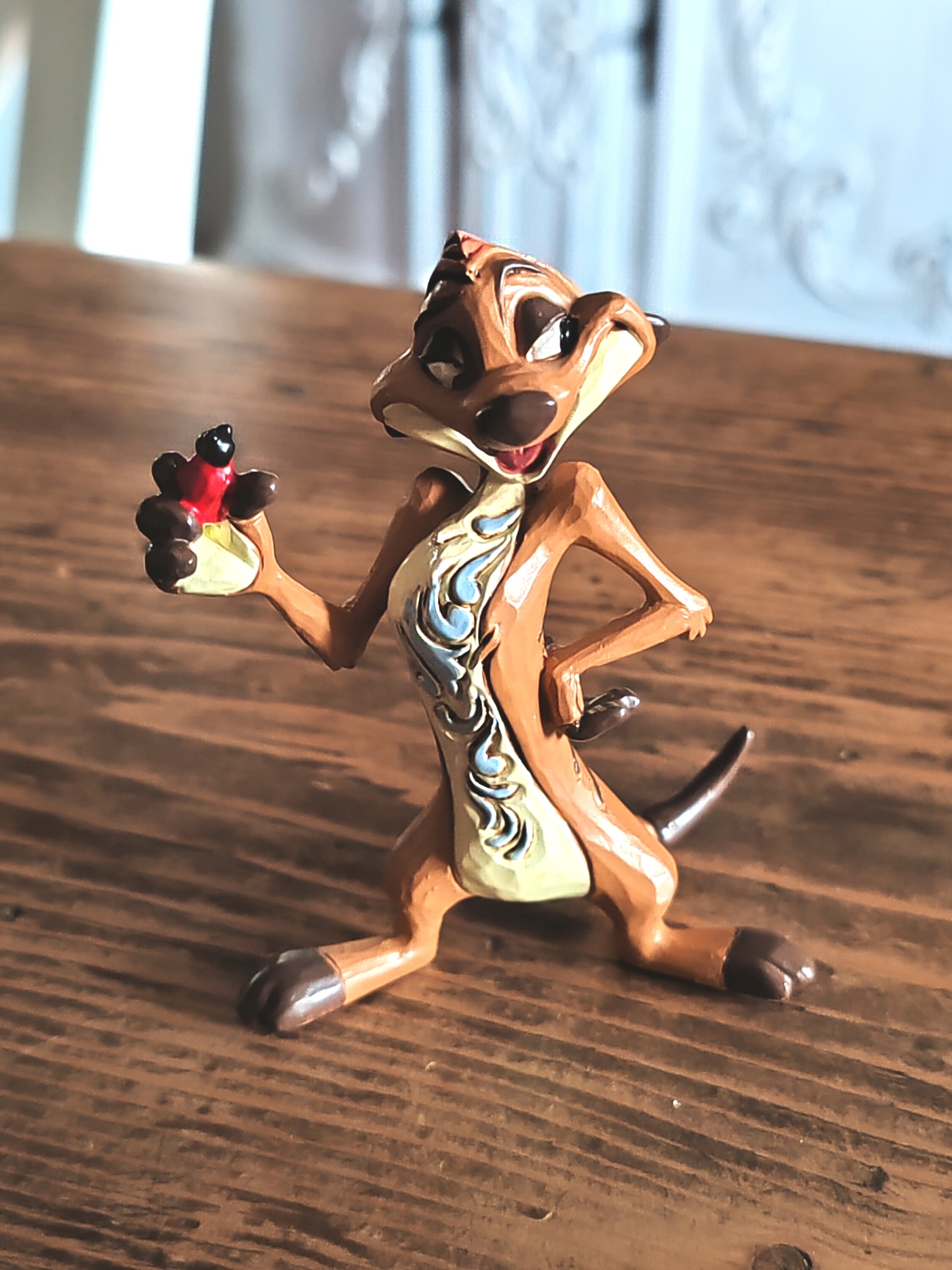 Ik hou van de uitdrukking van Timon op dit beeldje, het is een leuke verrassing.De mijne had een verffout op de neus, een grote, ongeverfde cirkel die ik heb ingevuld met een viltstift. Uiteindelijk gaat het beter