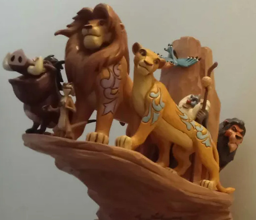 Figura impresionante y bellísima de los personajes del rey león en la mítica roca.Por ponerle una pequeña pega el efecto tallado madera en la cara de Simba podía haber sido algo más suave.Figura que no puede faltar a los coleccionistas amantes de las figuras creadas por JIM SHORE para Disney