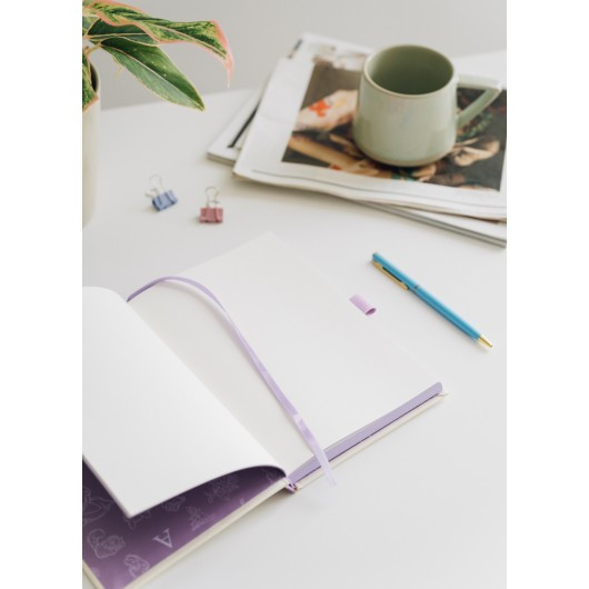 A5 hardcover notitieboek met pen. Heeft een matte gelamineerde cover met gequilt effect en zacht gevoel, blanco pagina's, rechte hoeken, gelijmde binding, pocket en lintbladwijzer. Bevat 96 vellen (192 pagina's) van 100 g/m2