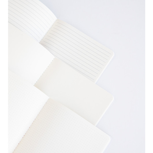 Set van 3 A5 notitieboekjes met zachte kaft, in drie verschillende designs. Elk notitieboek meet 14,8 x 21 cm en is gemaakt van een bedrukte papieren omslag van 300 g/m². Elk notitieboek heeft 32 vellen van 80 g/m² (64 pagina's) en bevat een ander type binnenwerk: gelinieerd, gestippeld, wit.