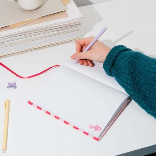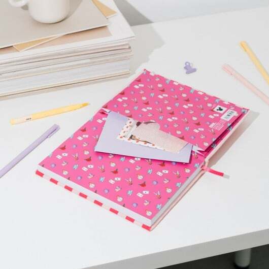 A5 hardcover notitieboek. Met fluwelen omslag en geborduurd design, gepersonaliseerd binnenwerk, rechte hoeken, gelijmde binding, insteekhoes en leeslint. Bevat 96 vellen (192 pagina's).