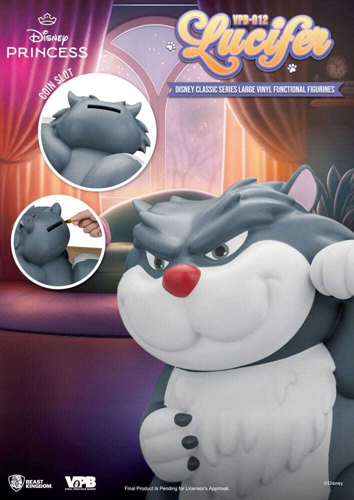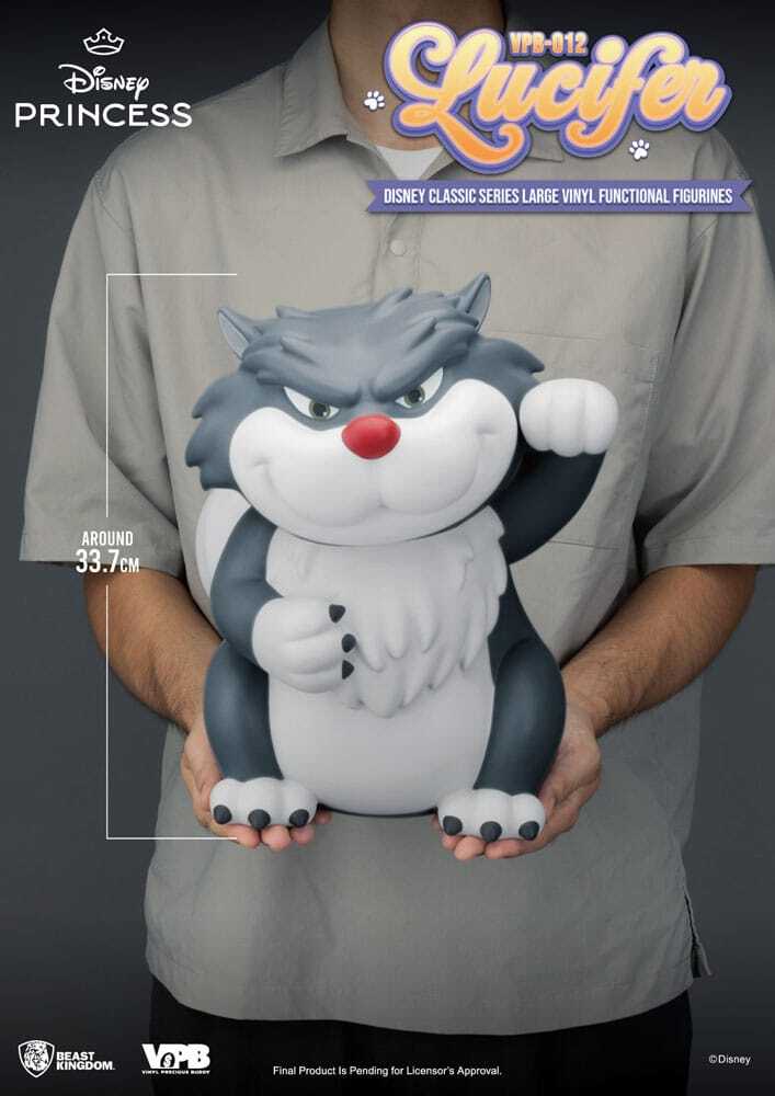 Deze 33 cm vinyl spaarpot toont Lucifer, de ondeugende kat uit Assepoester, in een speels en gedetailleerd ontwerp. Perfect voor kinderen en Disney-fans, hij stimuleert sparen en voegt een decoratief tintje toe aan elke kamer.