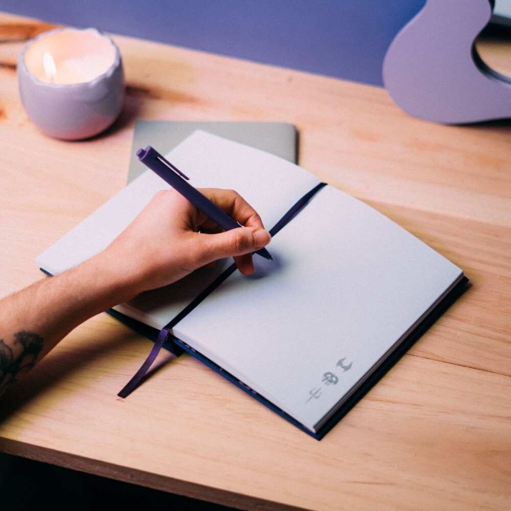 A5 notitieboek (14,8 x 21 cm). Hardcover met een lenzichtig effect, waardoor een dynamisch beeld zichtbaar wordt wanneer het vanuit verschillende hoeken wordt bekeken. Zachte achterkant, rechte hoeken, gelijmde binding, op maat gemaakte binnenpagina's met bullet-inlays, lint als bladwijzer en binnenvakje. De binnenkant bevat 96 vellen (192 pagina's) papier van 100 g/m².