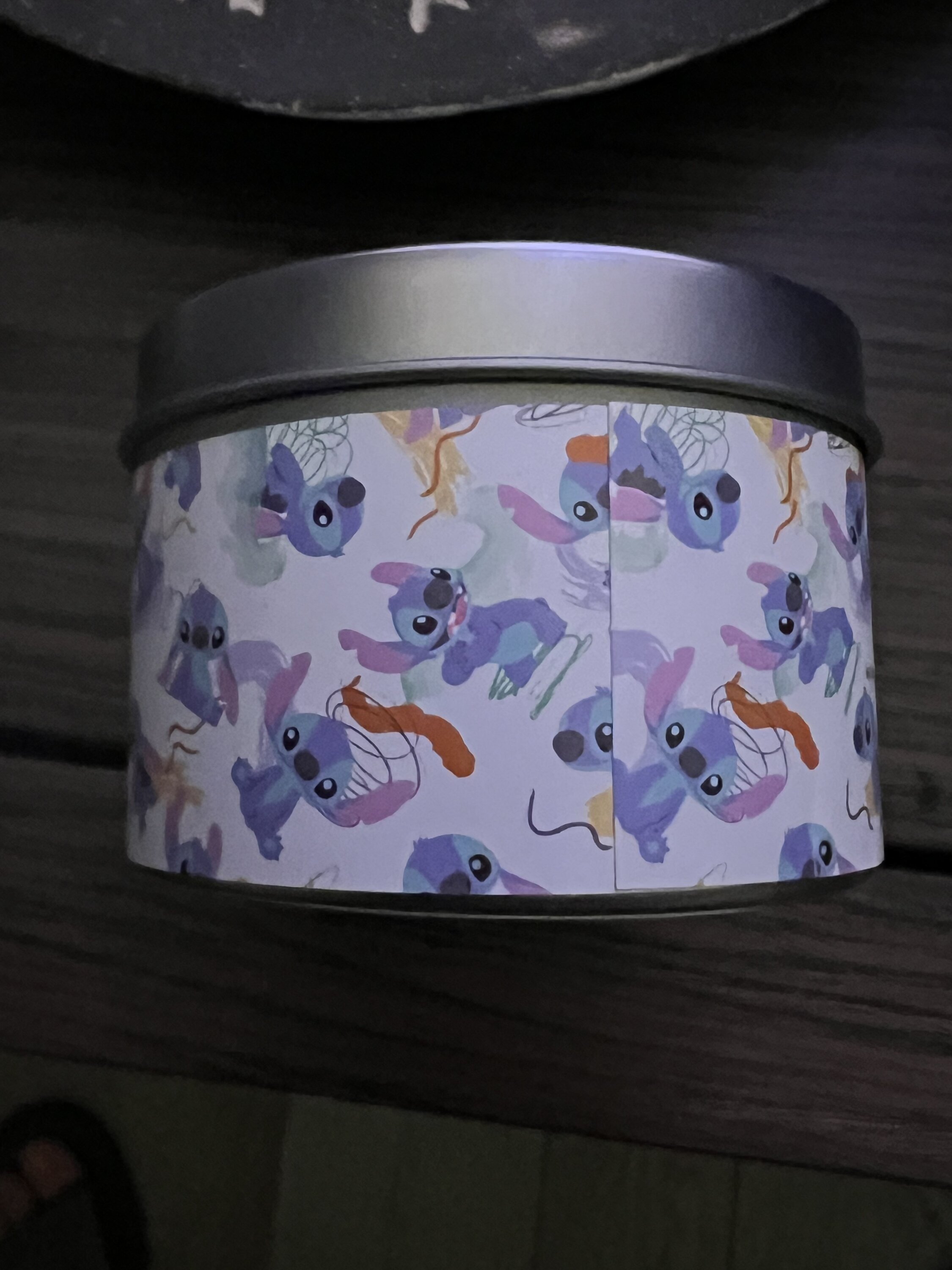Deze kaars wordt geleverd in een prachtig versierd metalen blik met witte en turquoise Lilo & Stitch -motieven en een geïllustreerd deksel met de personages. Het blik voegt een decoratieve Disney-touch toe aan elke kamer. Als de kaars is opgebrand, kan het blik hergebruikt worden om de kaars in op te bergen of als verzamelobject.