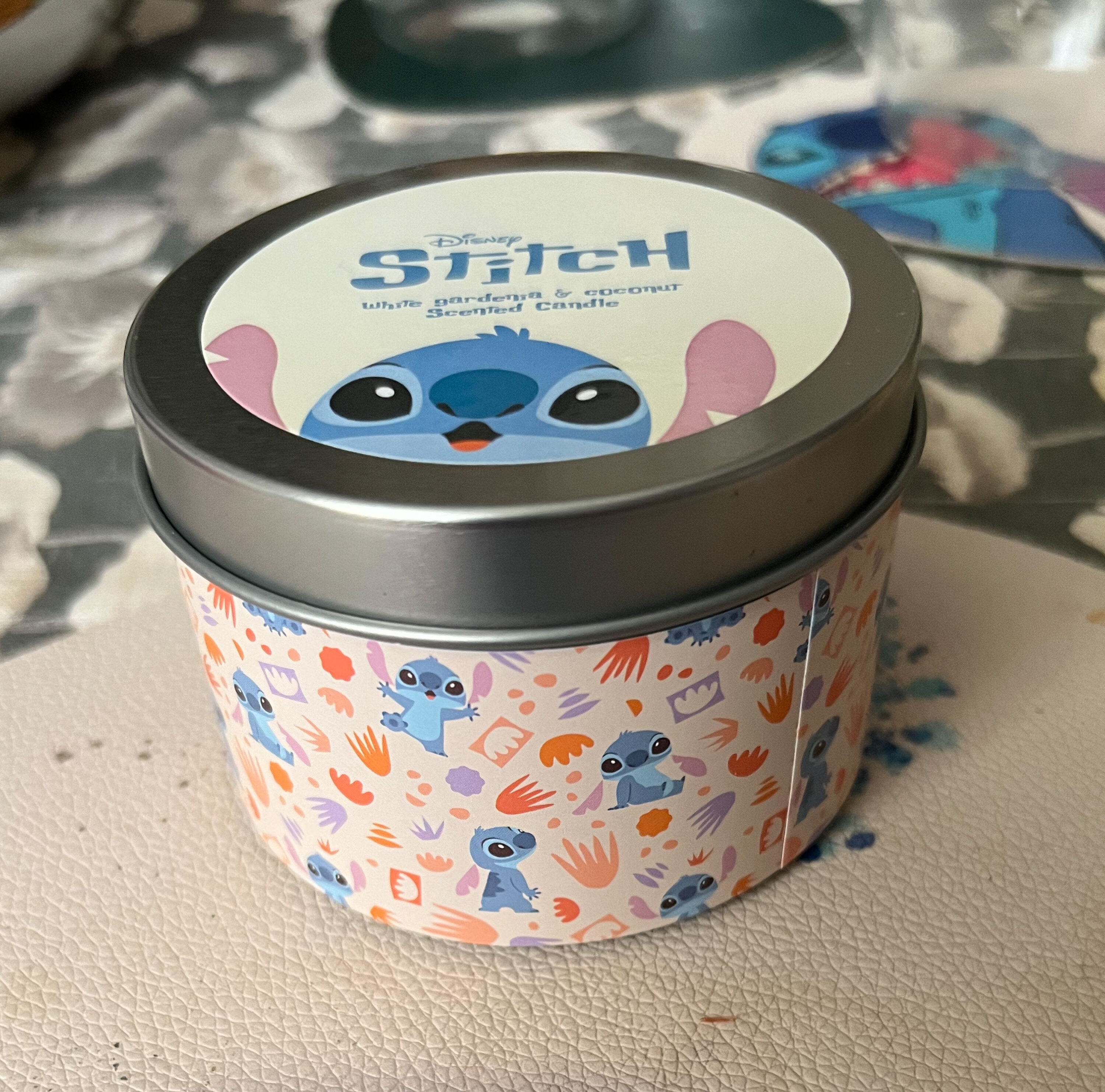 Deze kaars wordt geleverd in een prachtig versierd metalen blik met witte en gele Lilo & Stitch -motieven en een geïllustreerd deksel met de personages, en voegt een decoratieve Disney-touch toe aan elke kamer. Als de kaars is opgebrand, kan het blikje hergebruikt worden om de kaars in op te bergen of als verzamelobject.