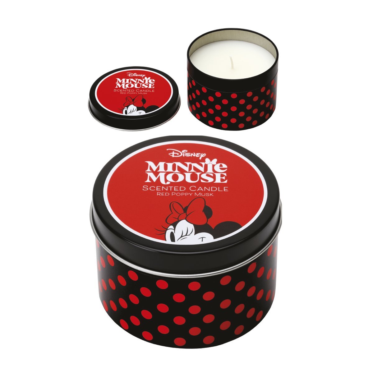 De kaars wordt geleverd in een prachtig versierd metalen blik in Minnie's iconische kleuren (zwart en rood), met de beroemde stippen en het speelse ontwerp van het personage op het deksel.