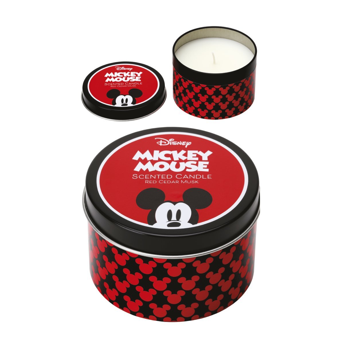 De kaars zit in een prachtig versierd metalen blikje in Mickey's iconische zwart-rode kleuren, met Mickey's kenmerkende print rondom en zijn speelse ontwerp op het deksel.