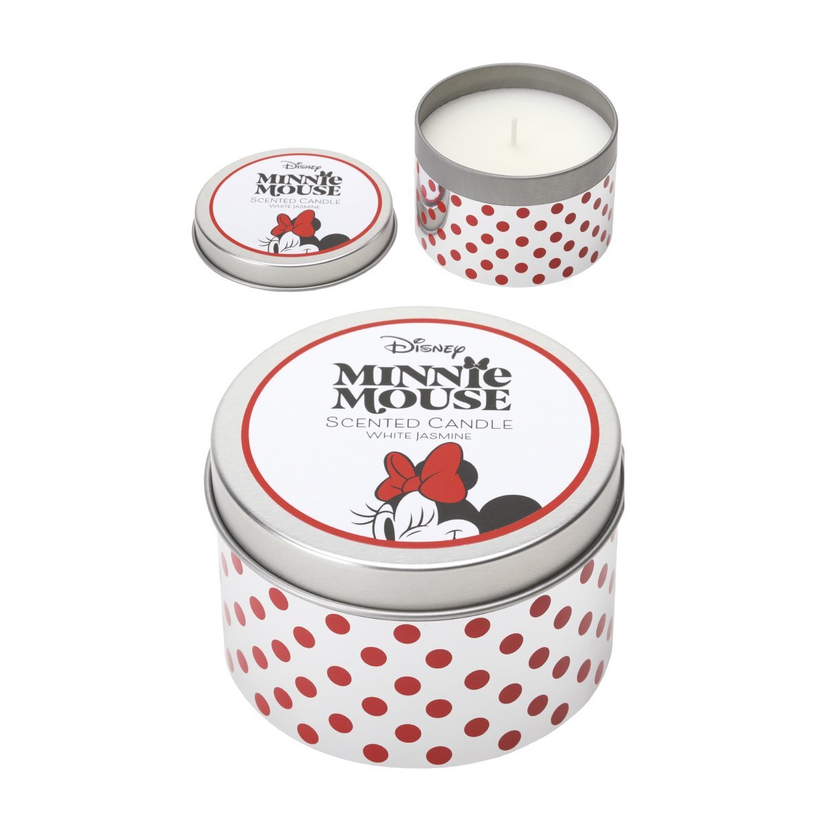 De kaars wordt geleverd in een prachtig vormgegeven metalen blik in de iconische kleuren van het personage: rood, wit en zilver. Het blik is rondom bedrukt met Minnie Mouse's stippen en het speelse personage staat afgebeeld op het deksel.