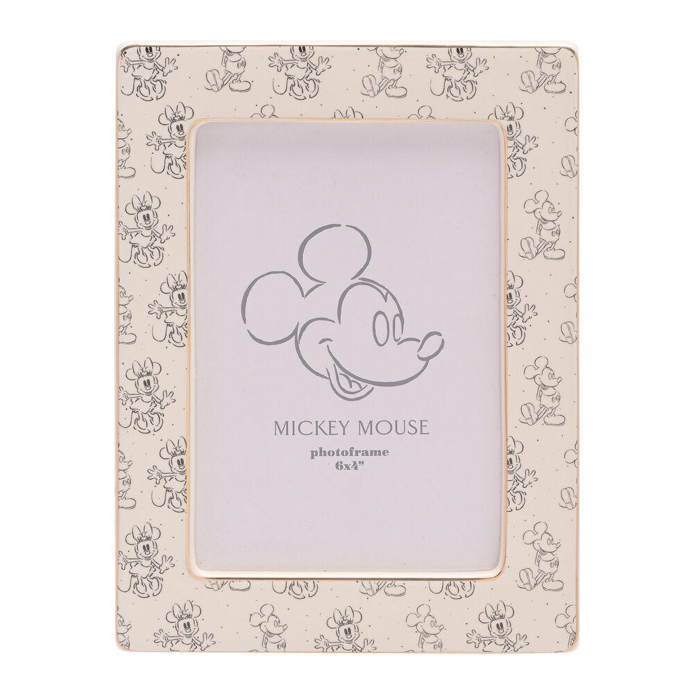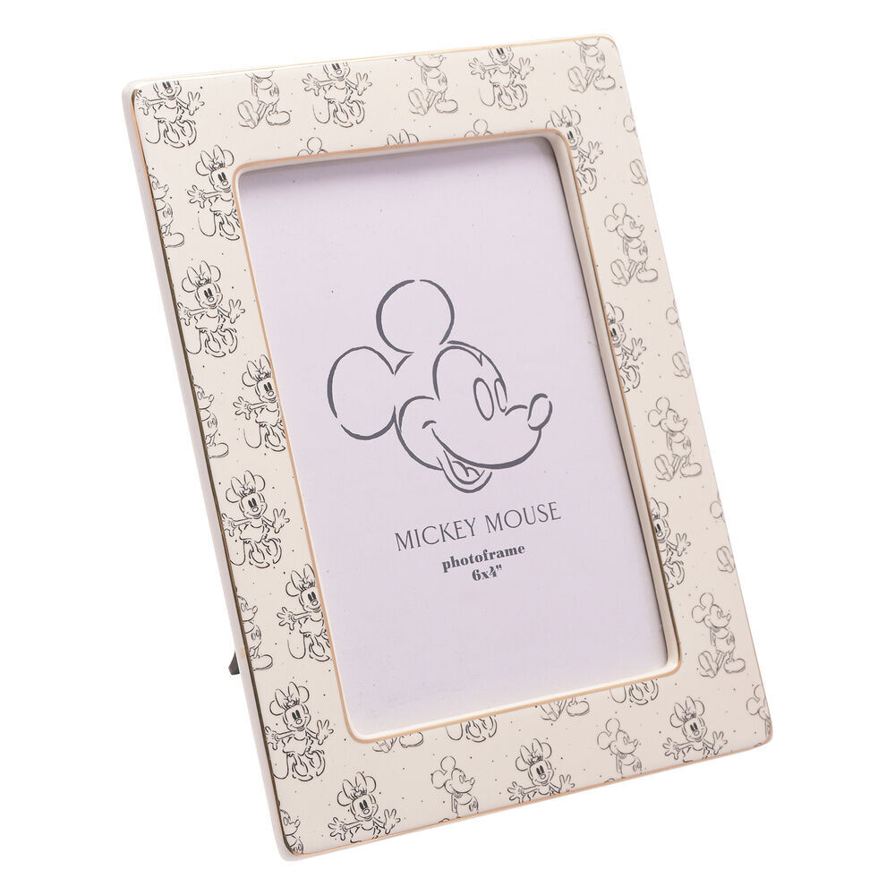 De witte keramische fotolijst heeft een gespikkelde afwerking, een gouden rand en afbeeldingen van Mickey & Minnie Muis. Hij is ontworpen om verticaal te worden neergezet met behulp van de bijgeleverde standaard.